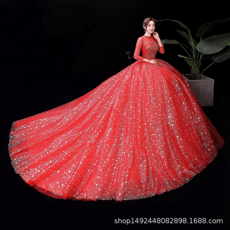 Gaun pengantin merah 2025 gaya baru dengan lengan panjang dan rok mengembang, simpel dan ramping, elegan vintage gaya putri Korea.