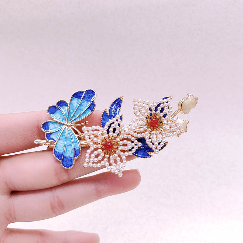 Jepit rambut mutiara kupu-kupu gaya Tiongkok aksesori rambut hiasan kepala klip samping hanfu aksesori rambut jepit rambut bebek
