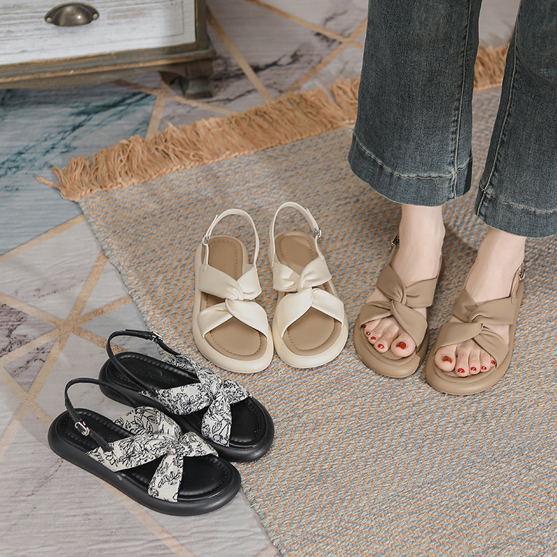 Sandal wanita model peri musim panas 2024, sol datar empuk, tali silang, ujung terbuka, sandal pantai kasual, hak datar.