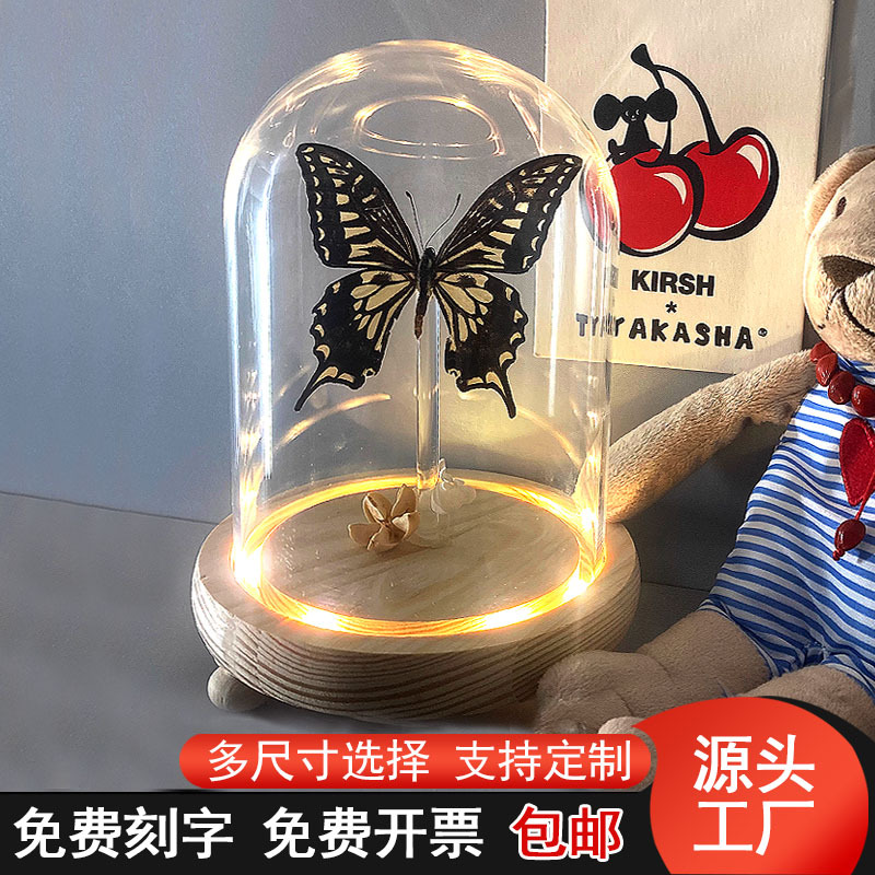 Penutup kaca bunga abadi pabrik langsung kotak display dasar kayu solid bercahaya penutup transparan cetakan buatan tangan kupu-kupu antidebu