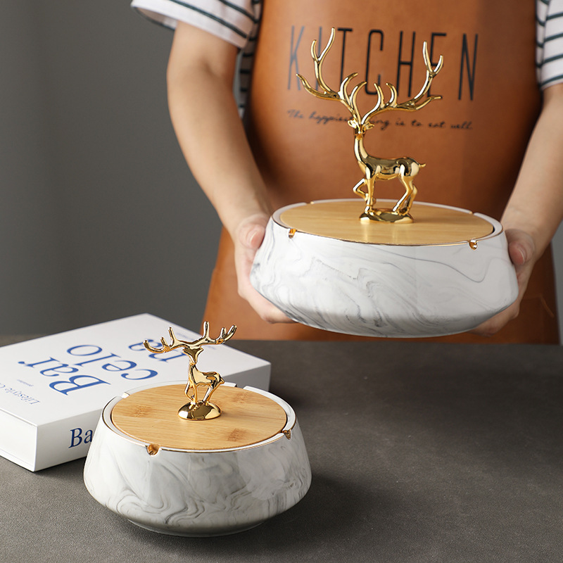 烟灰缸感大理石个性潮流家用办公室客厅陶瓷烟缸防飞带盖麋鹿客厅