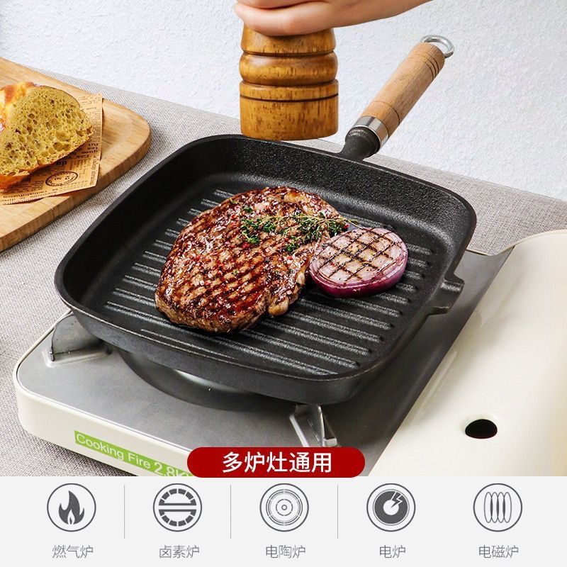 Wajan steak besi cor tebal, wajan datar tebal, wajan panggangan bergaris cocok untuk kompor induksi, wajan anti lengket.