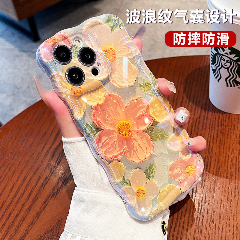 适用苹果16promax蓝光油画花朵手机壳新款iPhone15波浪边14全包13