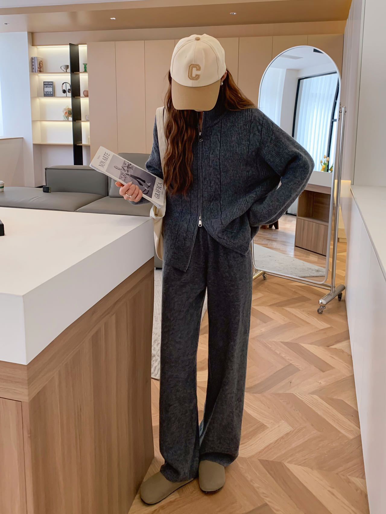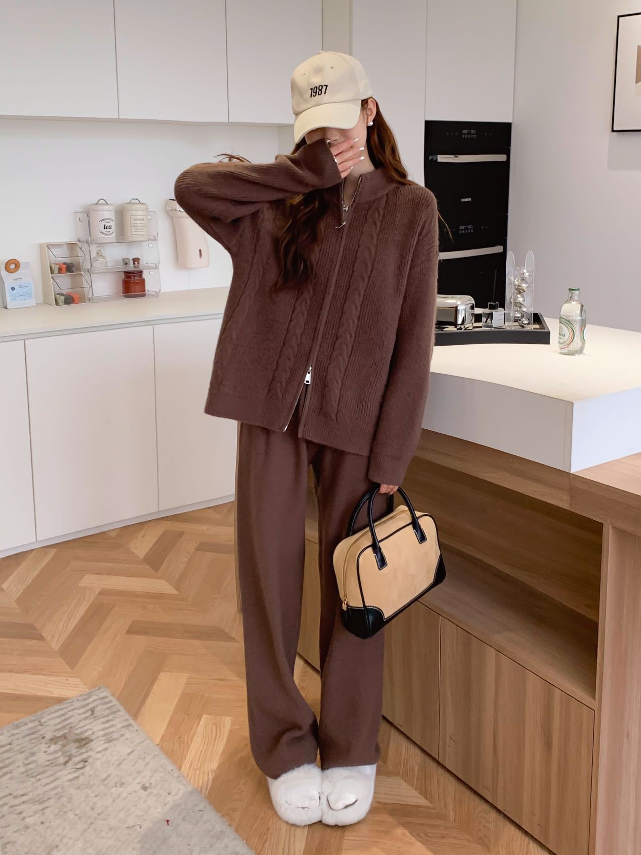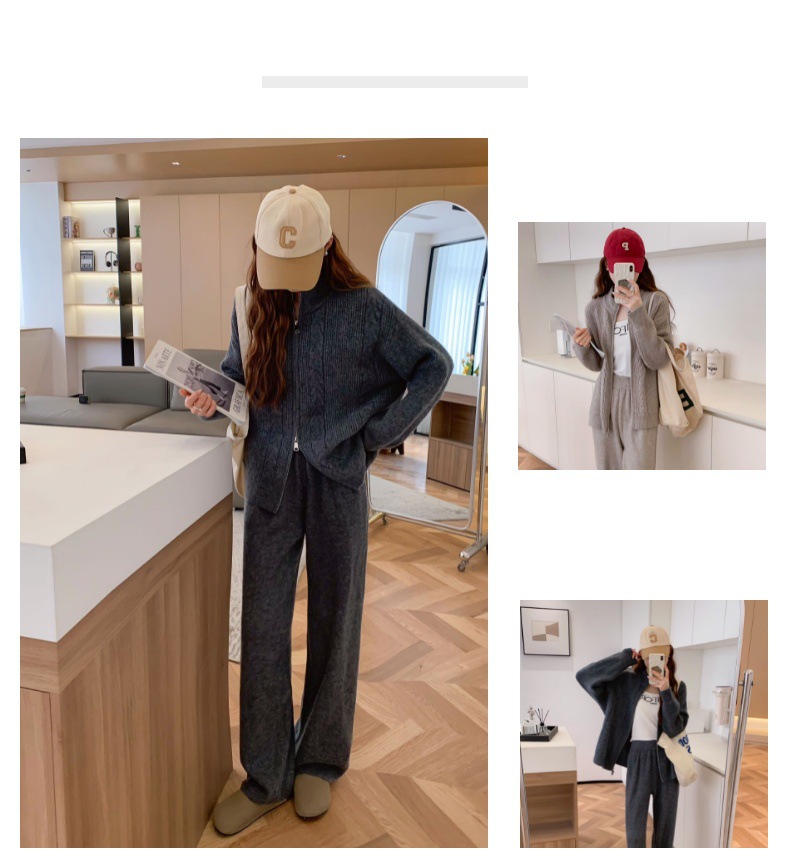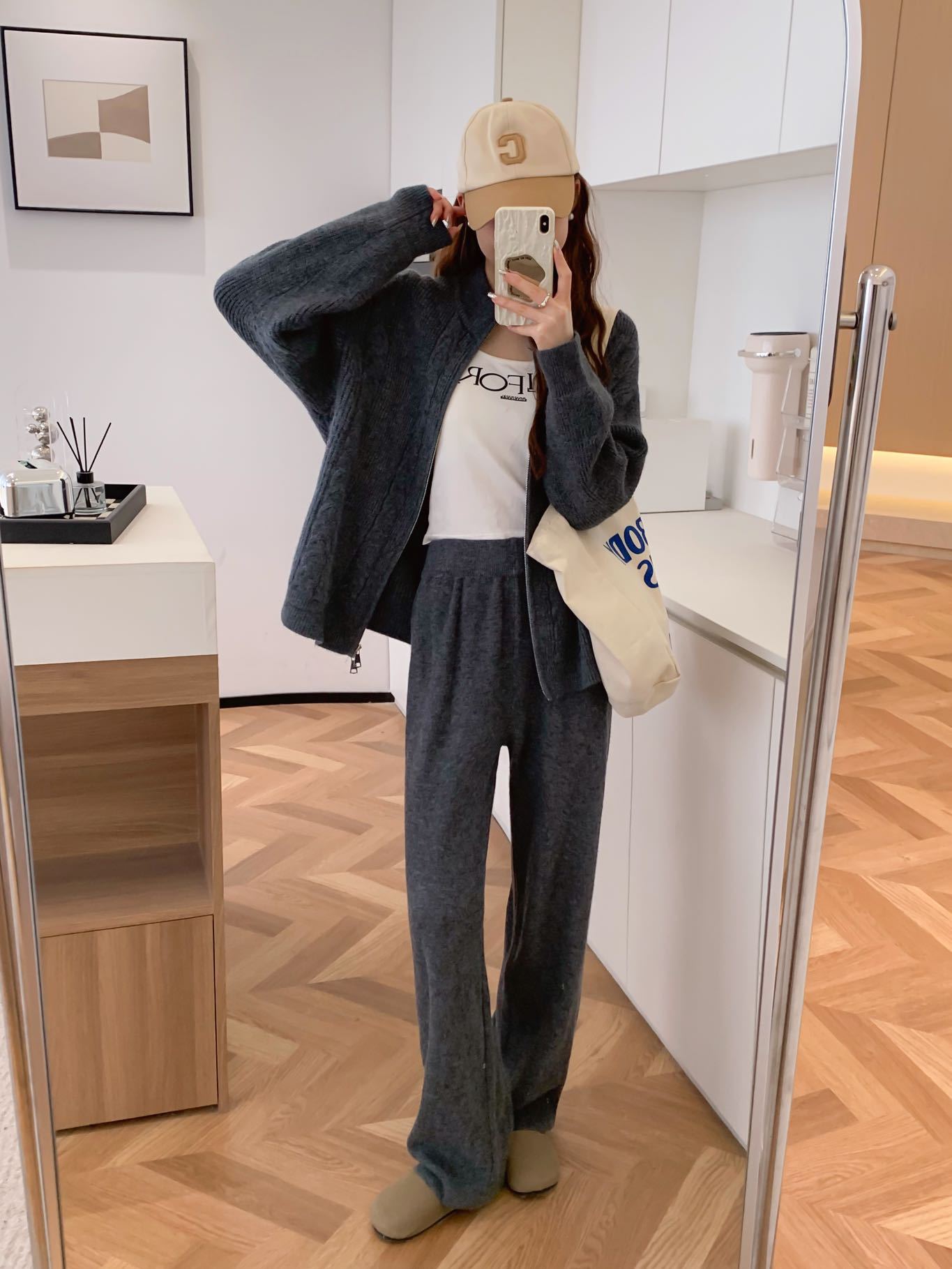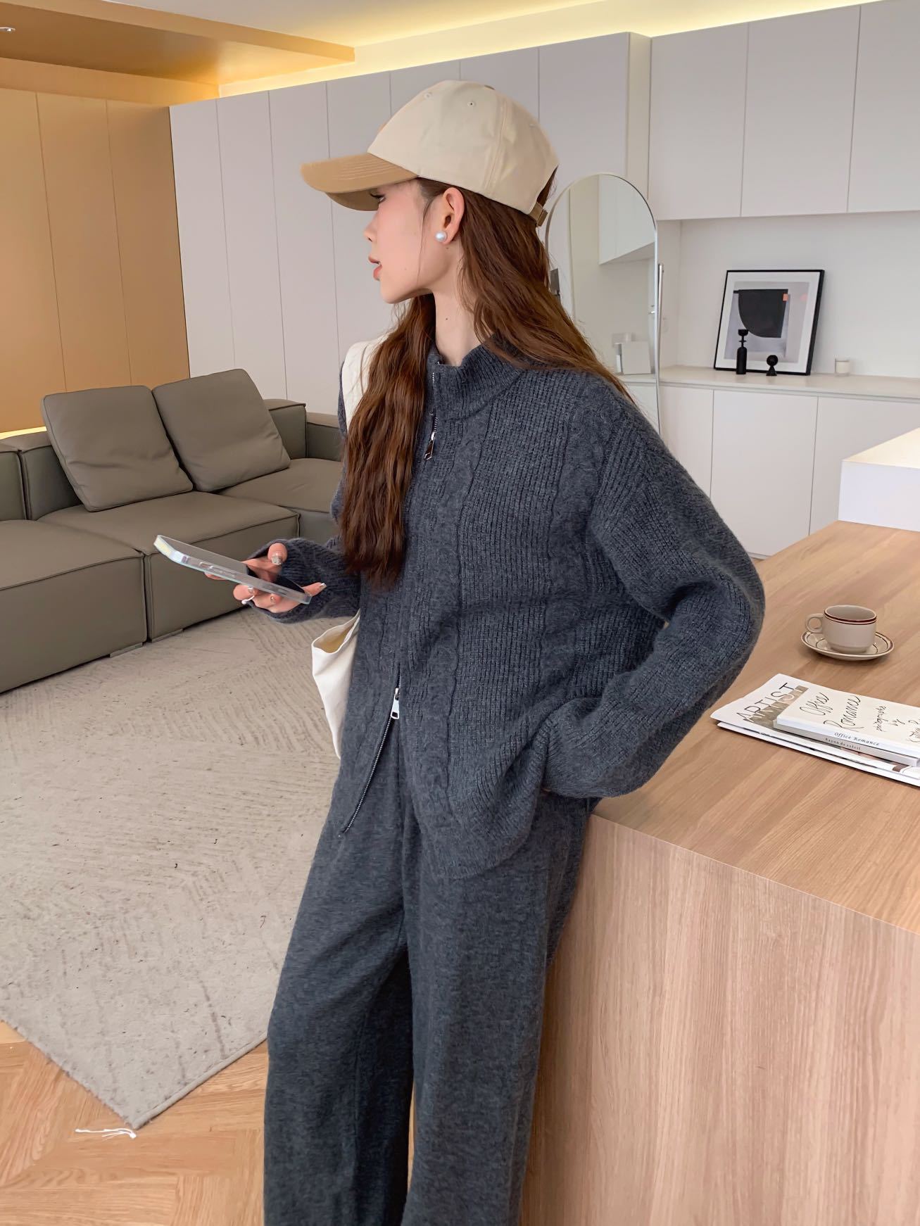 Setelan pakaian rajut wanita, setelan dua potong jaket ritsleting model Korea, celana kaki lebar kasual 2024 dan 186