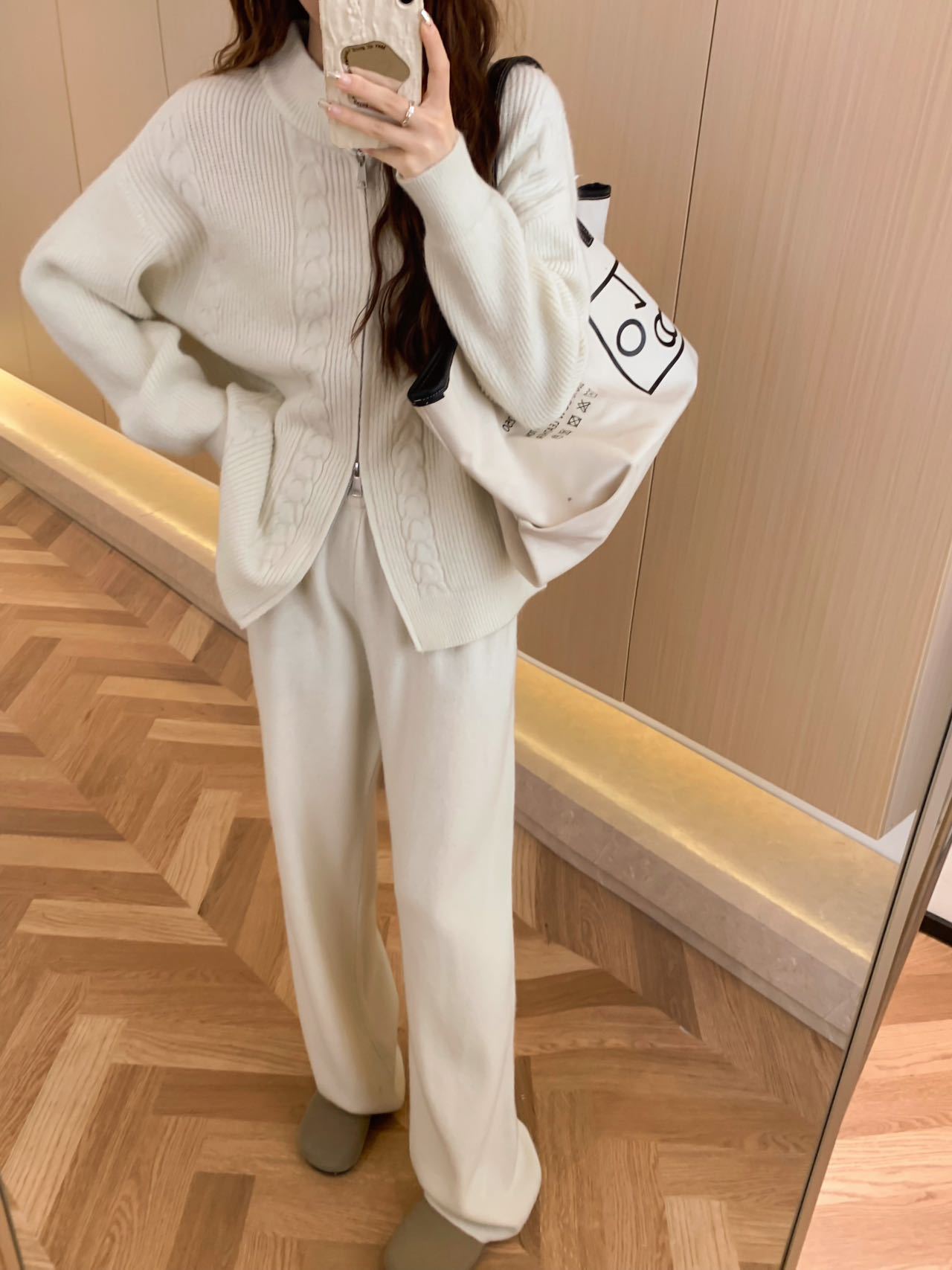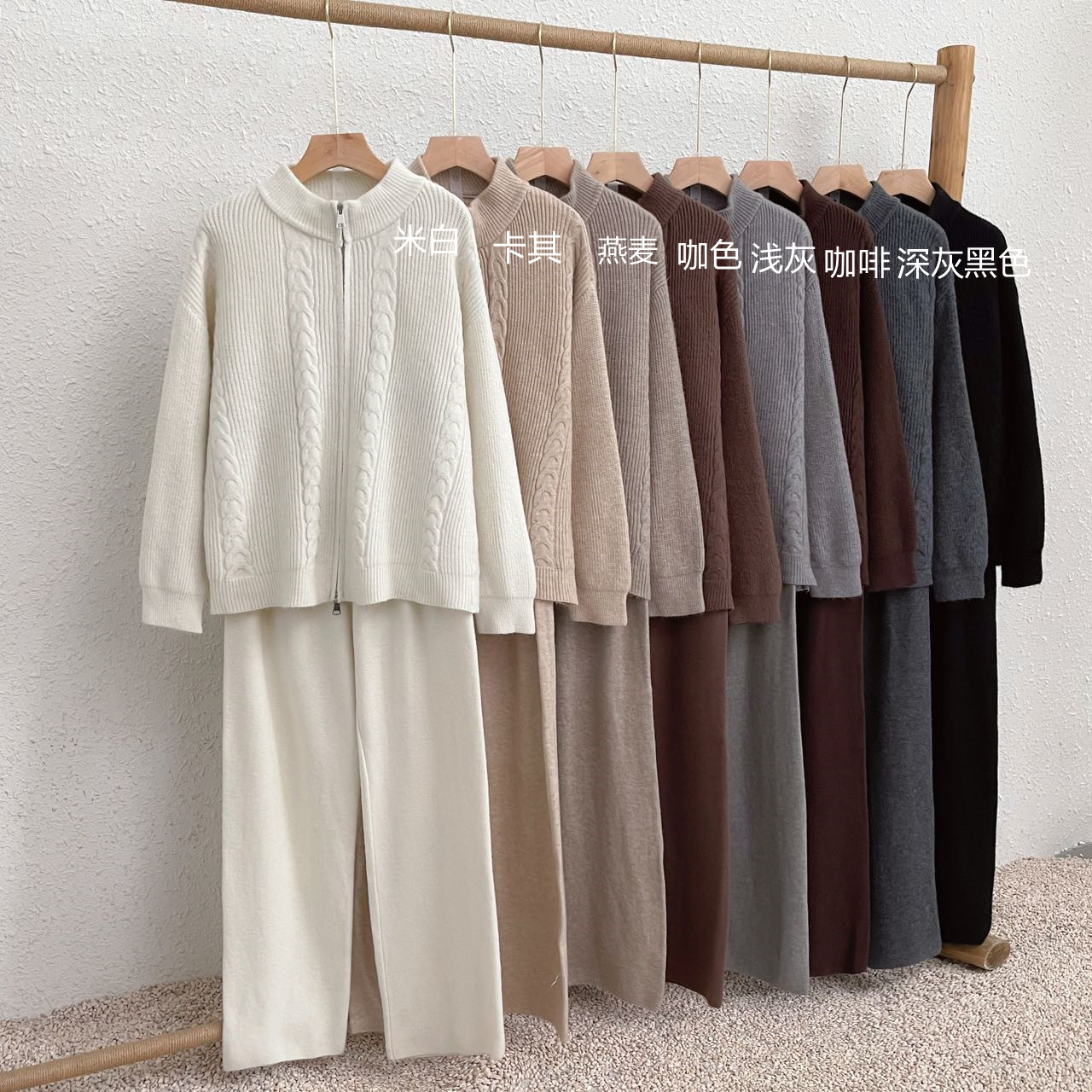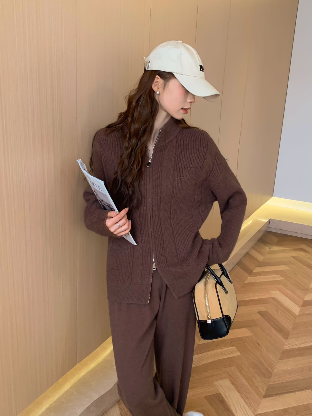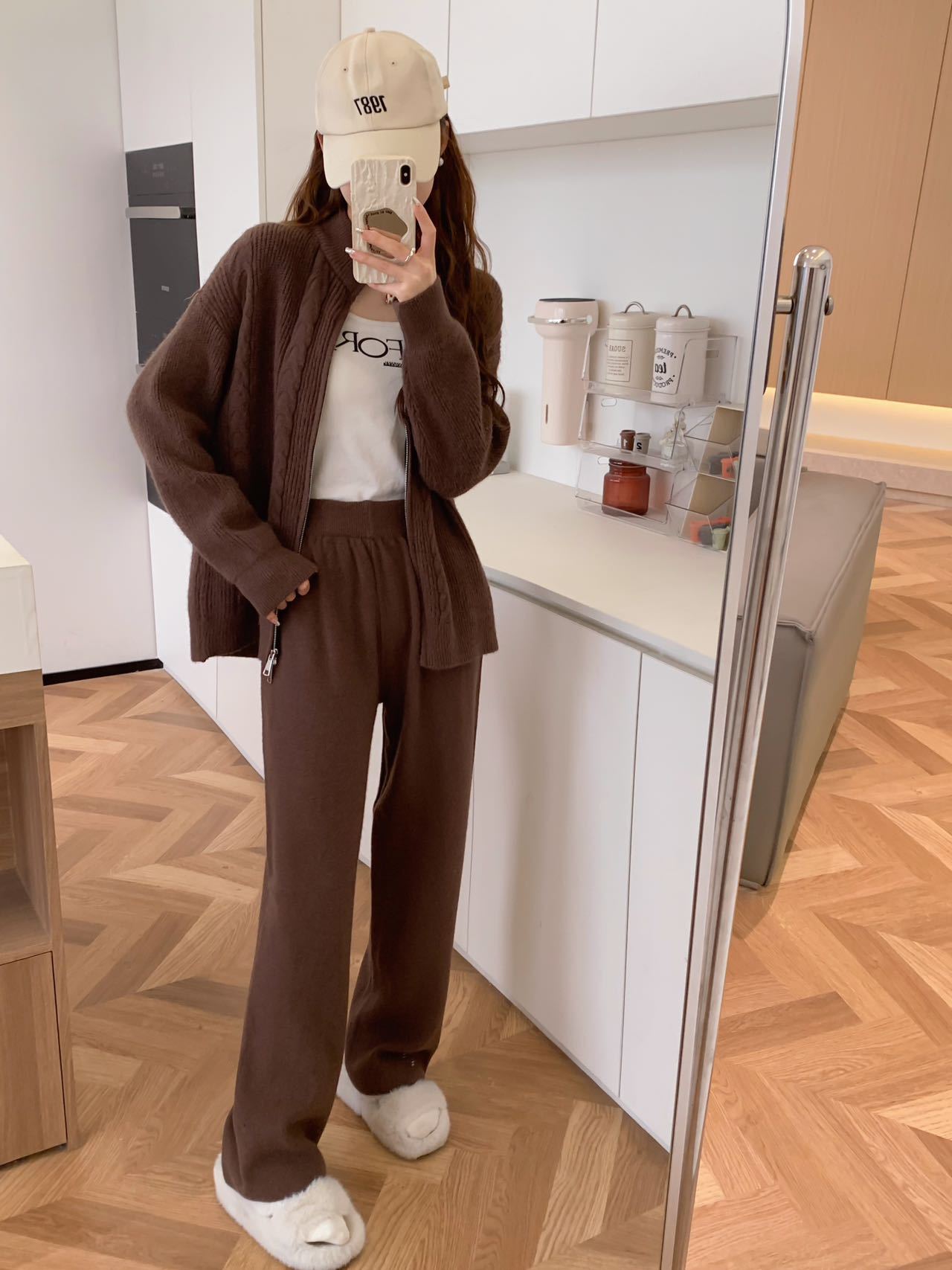 Setelan pakaian rajut wanita, setelan dua potong jaket ritsleting model Korea, celana kaki lebar kasual 2024 dan 186