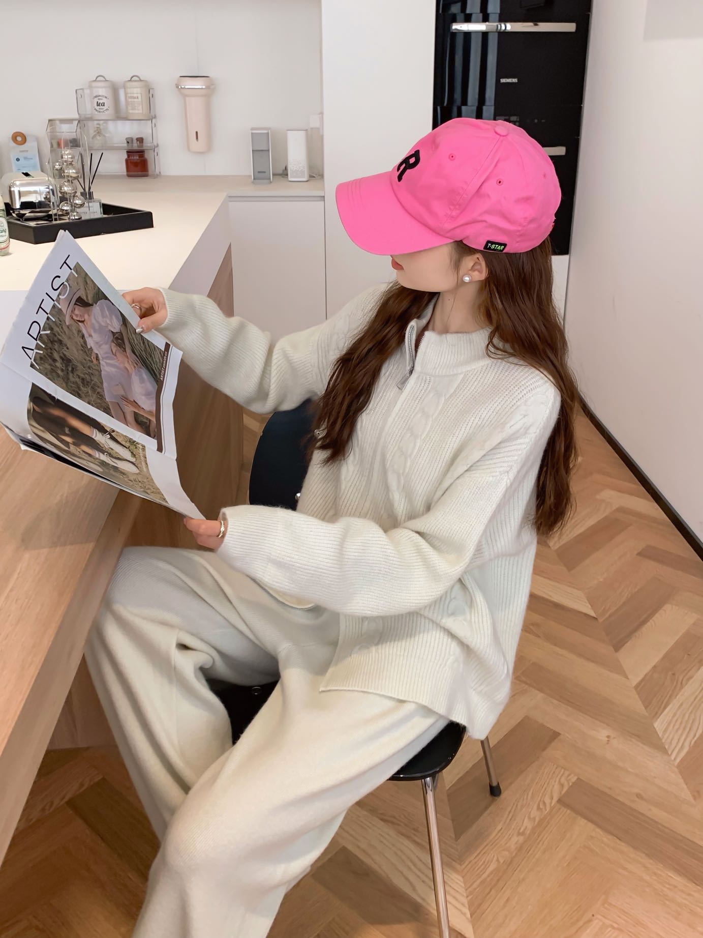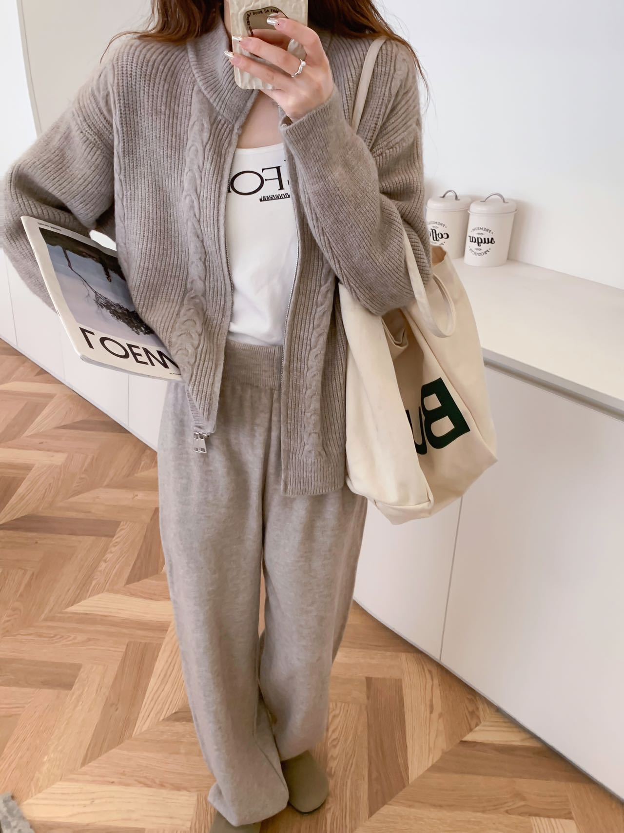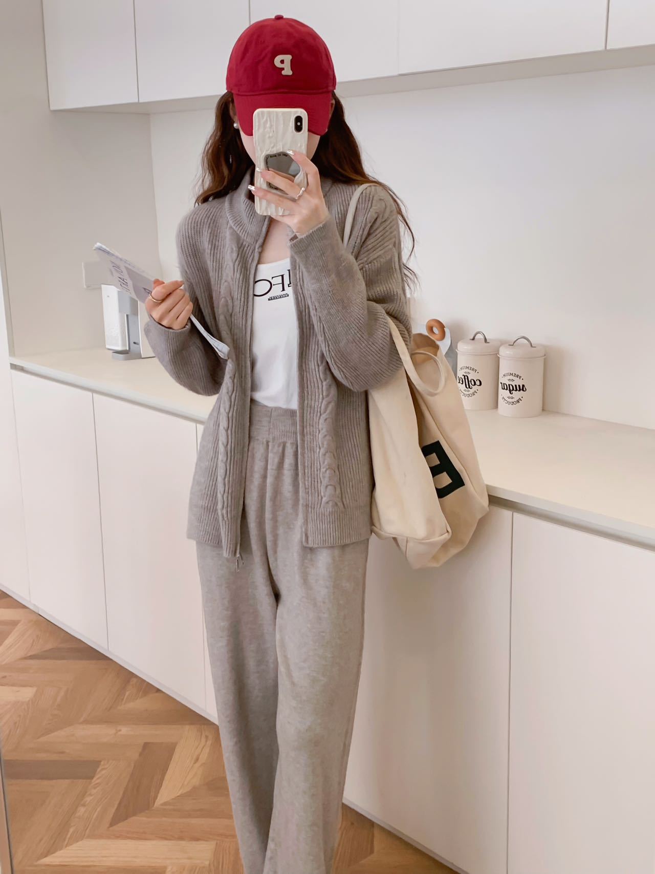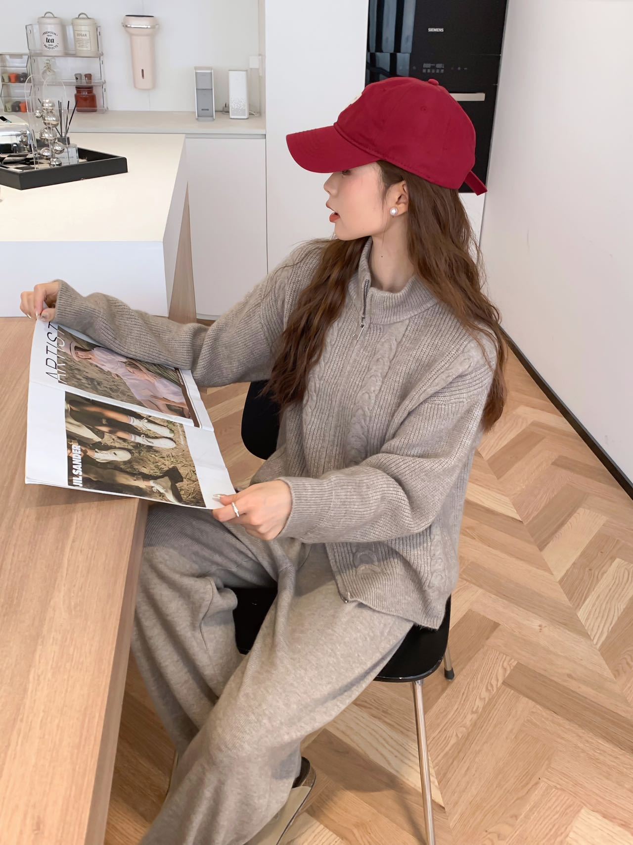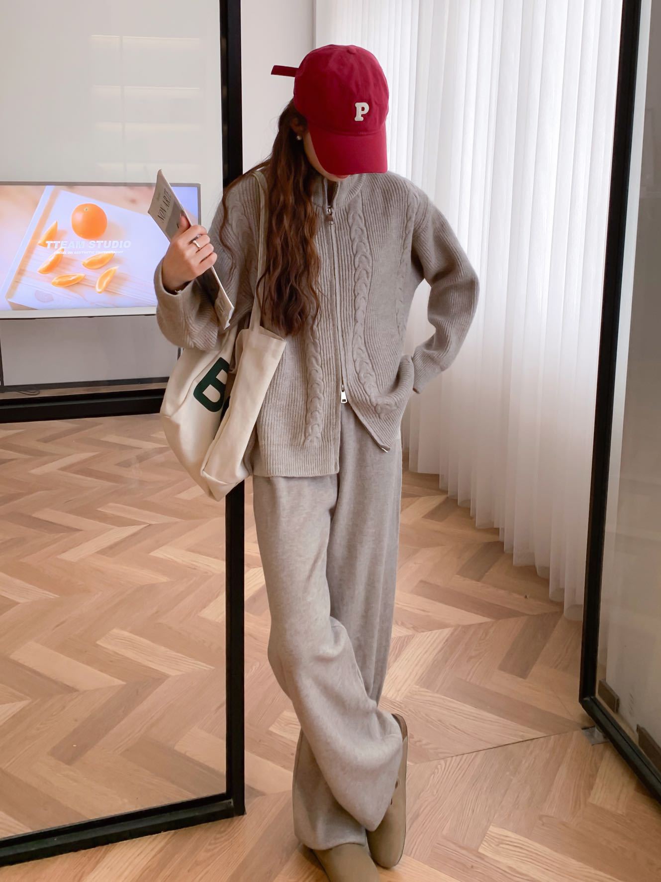 Setelan pakaian rajut wanita, setelan dua potong jaket ritsleting model Korea, celana kaki lebar kasual 2024 dan 186