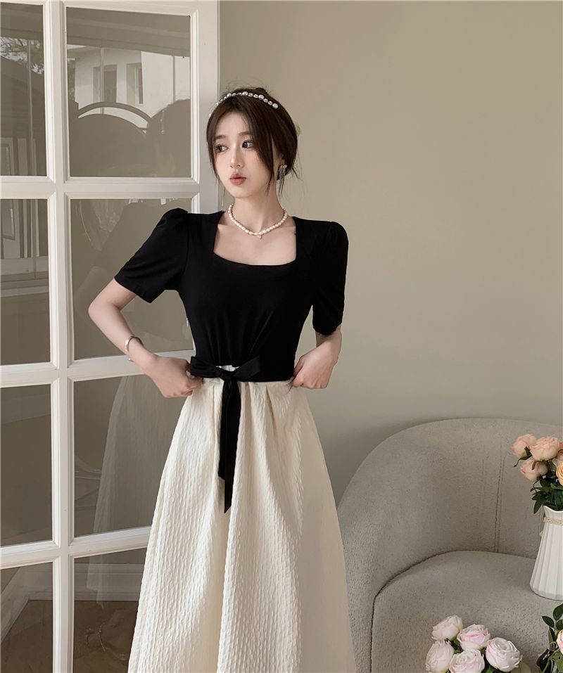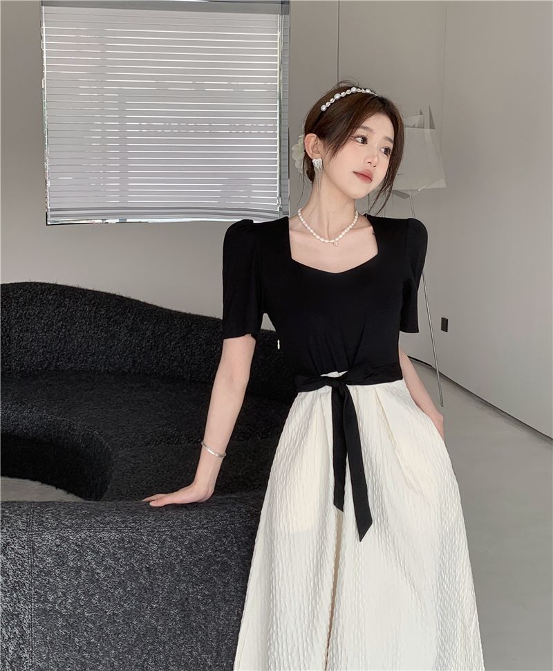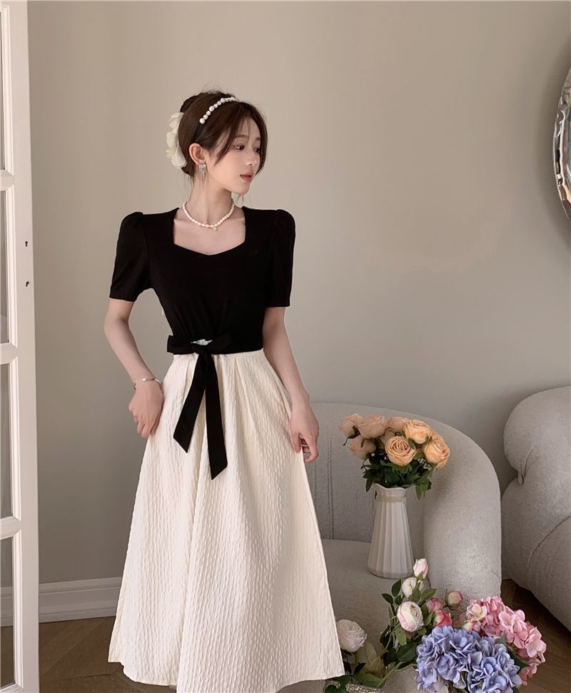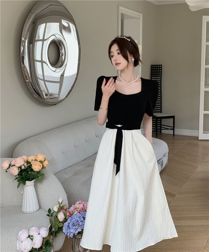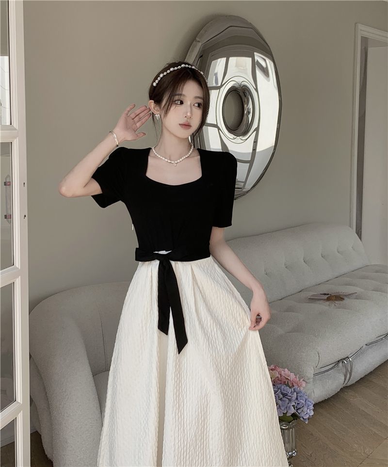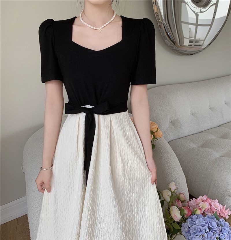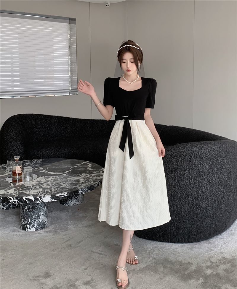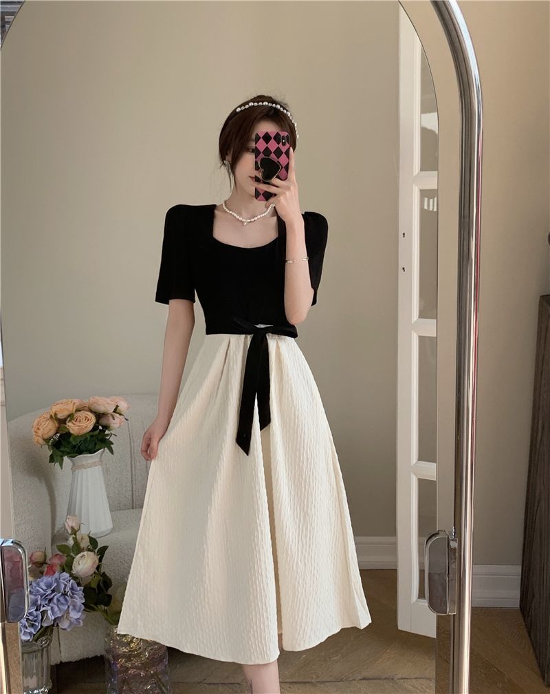 Gaun wanita ukuran besar, gaun perempuan gemuk, jahitan pinggang, rok a-line, gaun penutup perut Perancis musim panas setengah panjang musim semi dan musim panas