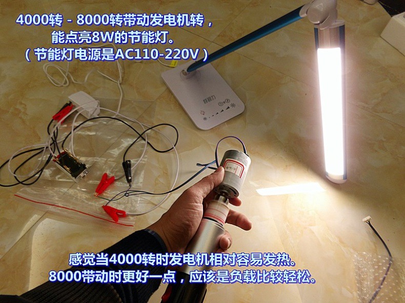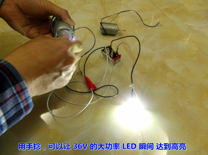 用手快速转动电机的轴,发出的电足够让 36V 15W的大功率 LED 瞬间达到高亮。(不过这个是因人而异,如果是一个女的,她有可能是做不到这么快的)
