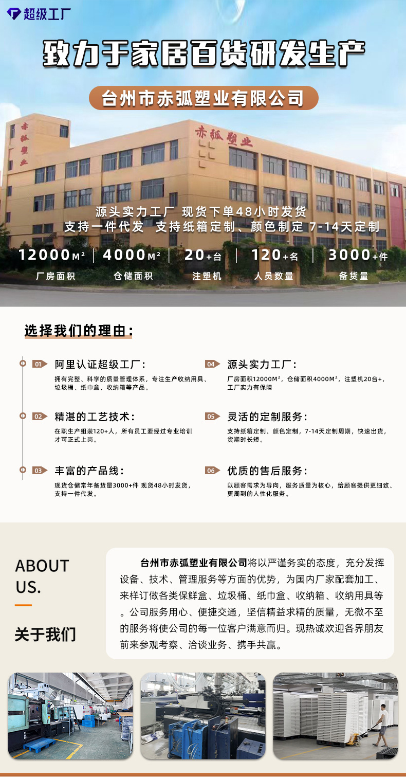 因为我们是源头工厂,有多年收纳盒,置物架、垃圾桶等生产加工经验,口碑好,深受品牌商青睐,所以我们的工厂更值得广大群体的信赖,违约风险低。