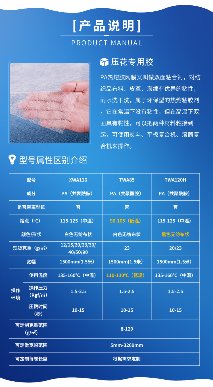 该产品用于:服装各种双层面料的粘合(西装、大衣、时装、衬衫等服装的门里襟、袖口、下摆、衣领、脚口等处的褶边、光滑接缝、腰带、绑带、垫肩固定等)。各种纺织面料、海绵、无纺布之间的粘合。鞋、帽、手套、手提箱、文件包、行李箱包(织物、天然或人造皮革、透气膜、防护膜、硬质泡沫、无纺布等)的粘接。