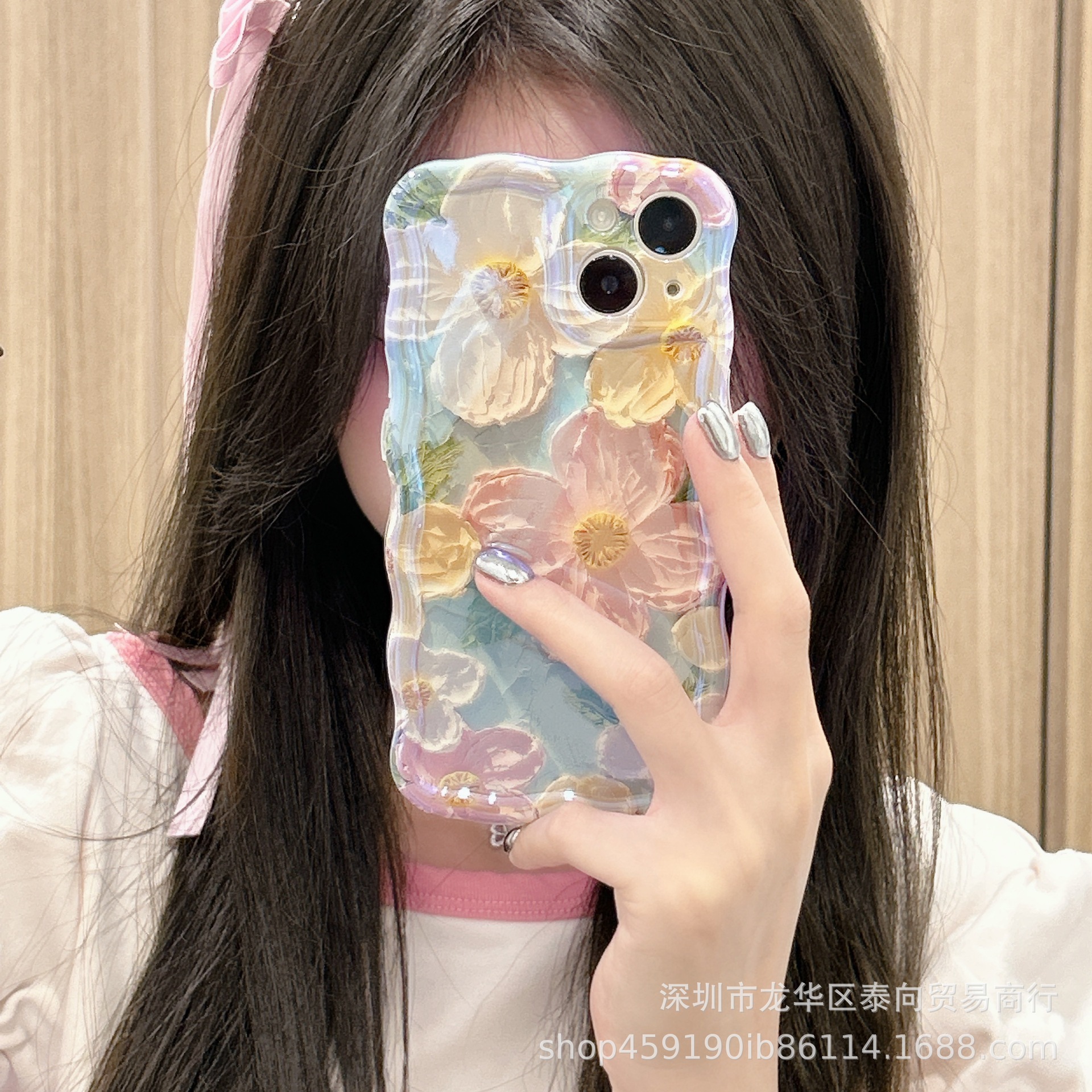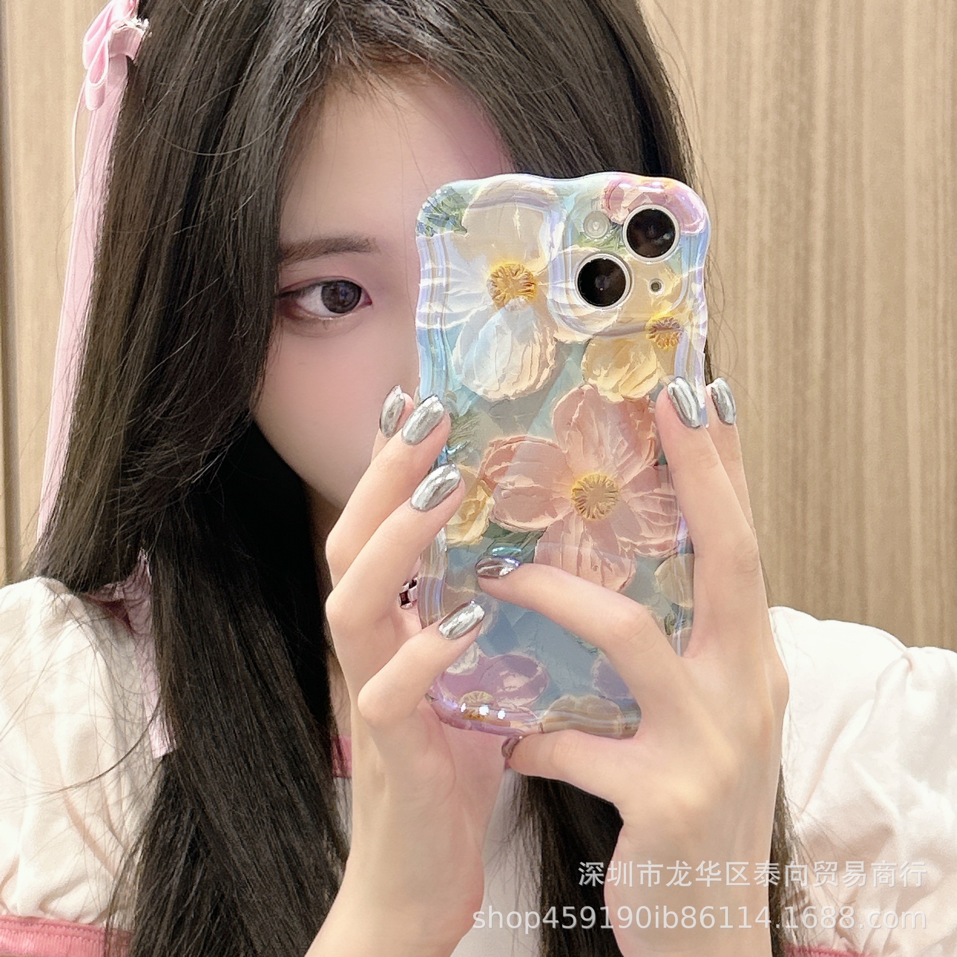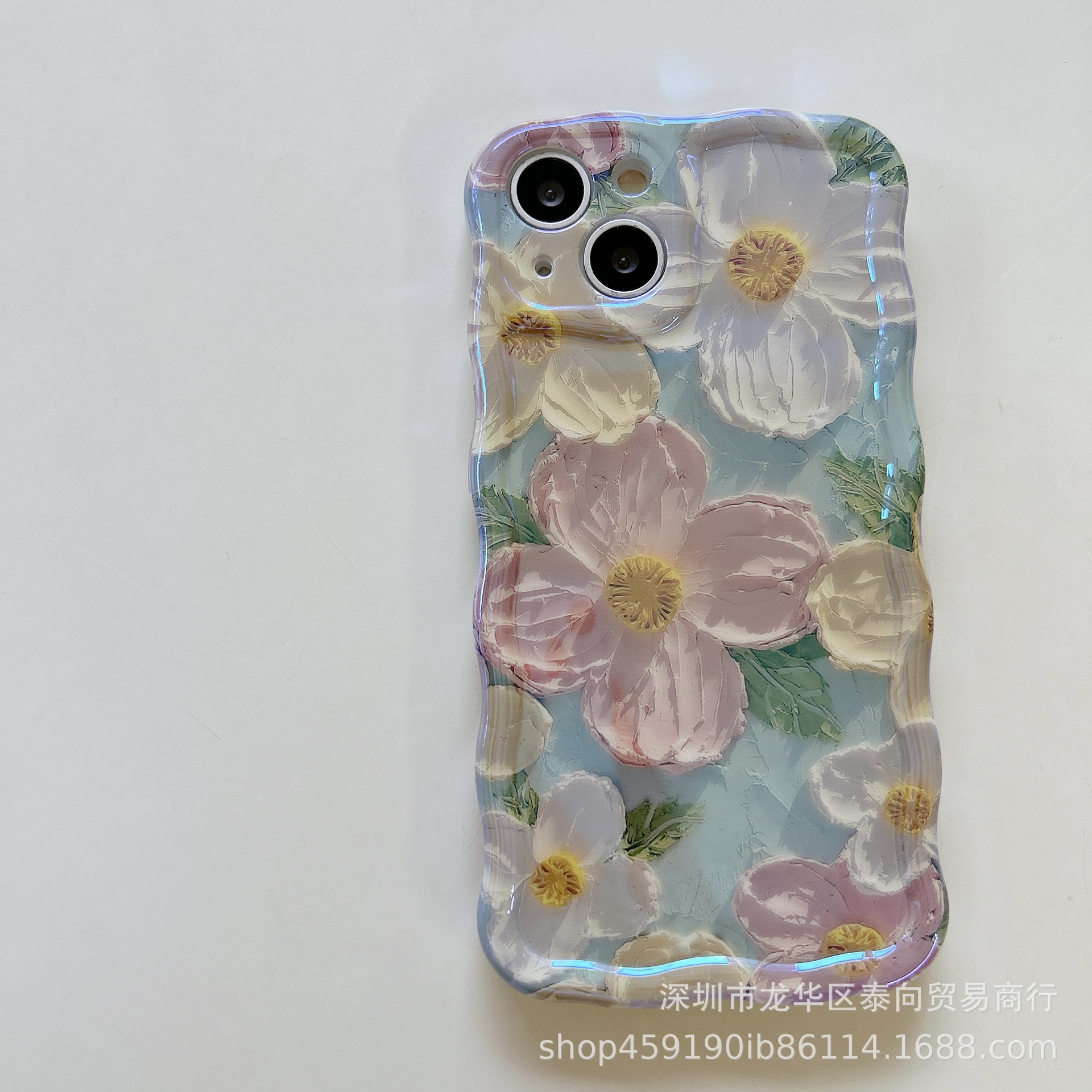 适用苹果16promax蓝光油画花朵手机壳新款iPhone15波浪边14全包13