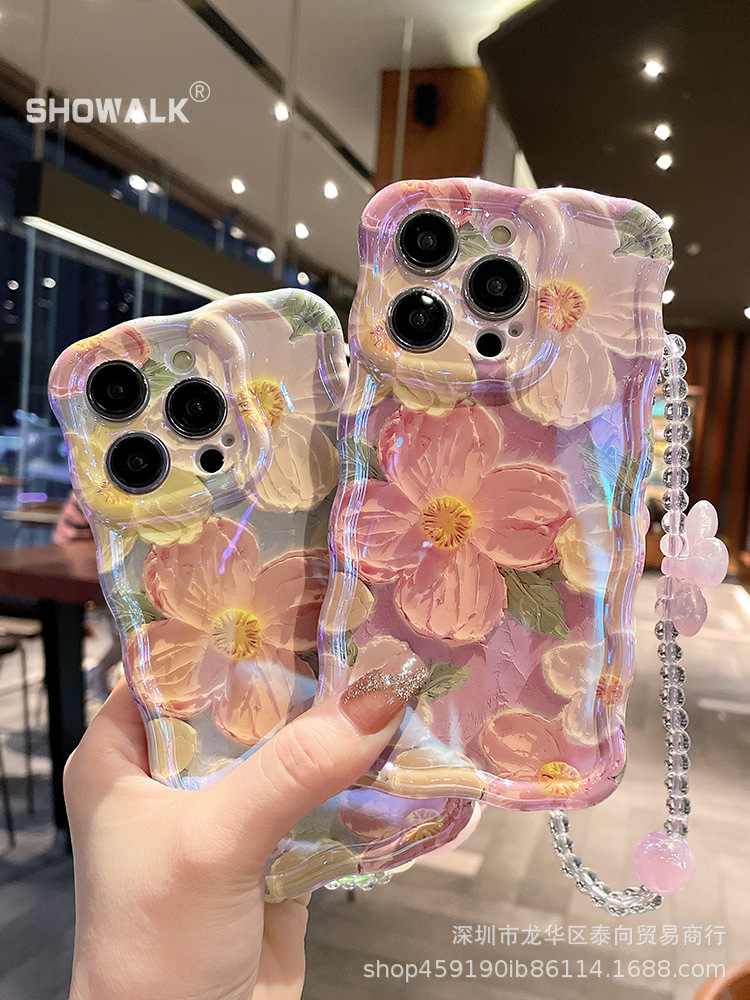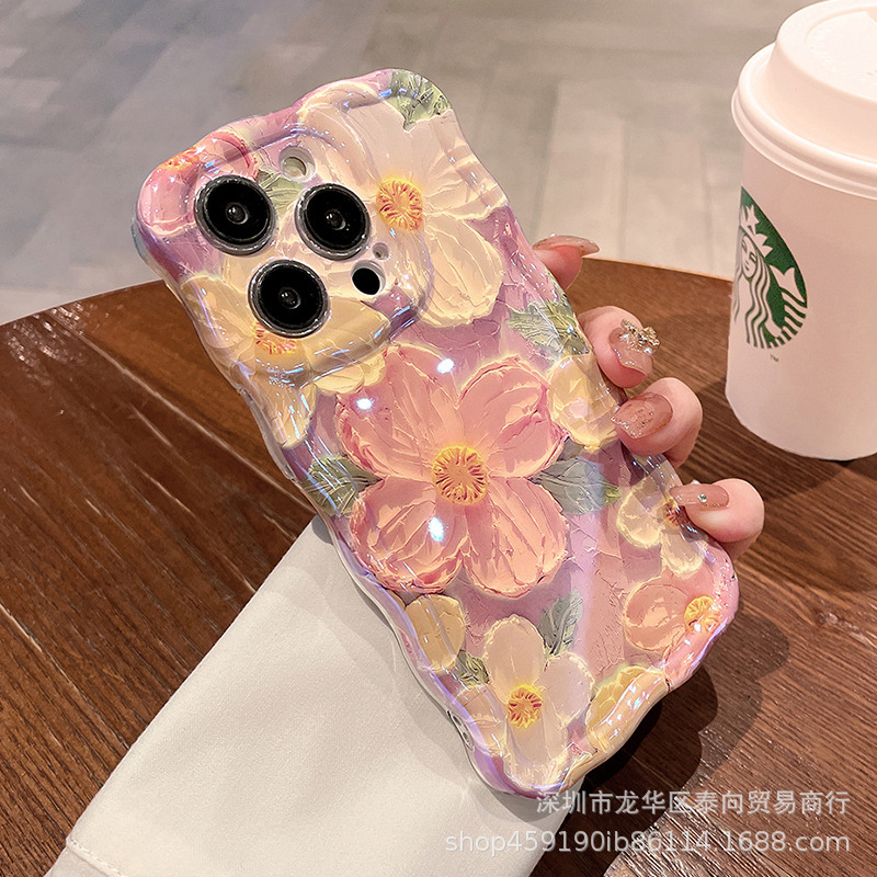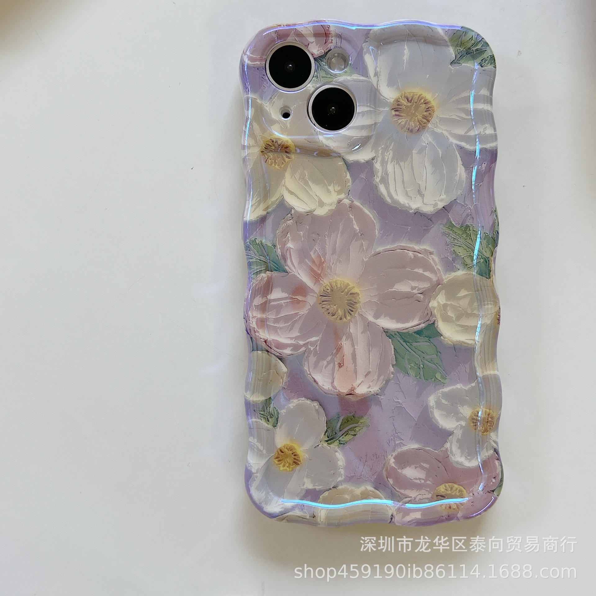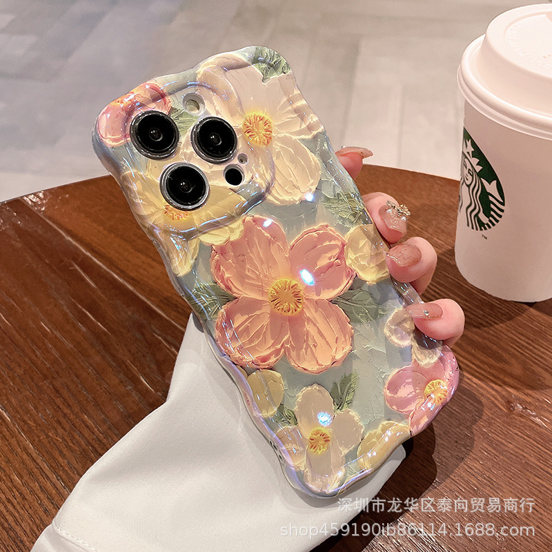 适用苹果16promax蓝光油画花朵手机壳新款iPhone15波浪边14全包13