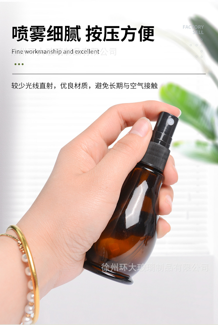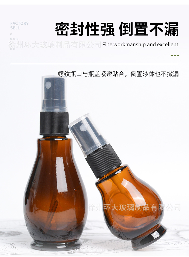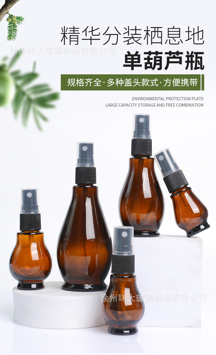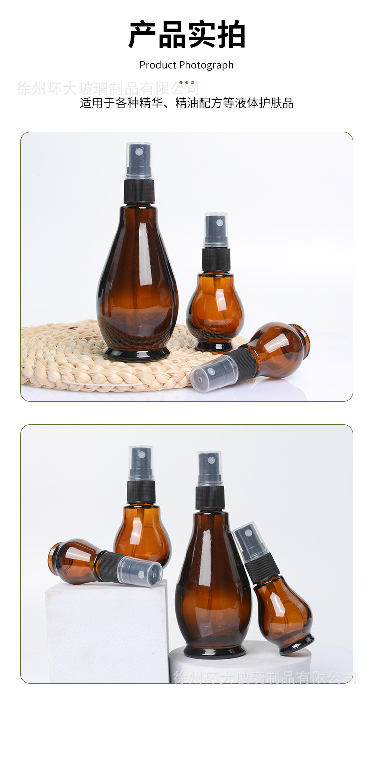 Botol minyak esensial single-gourd anti cahaya berwarna cokelat, botol kaca isi ulang, botol semprot tekan, botol lotion, botol kosong grosir