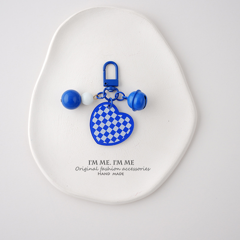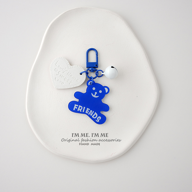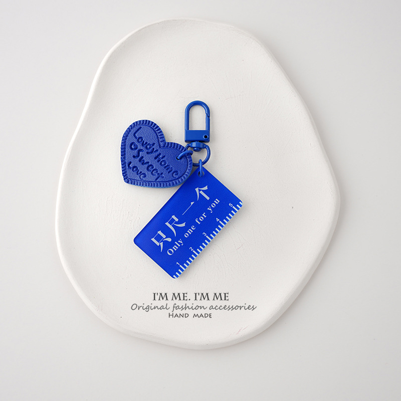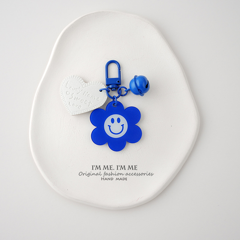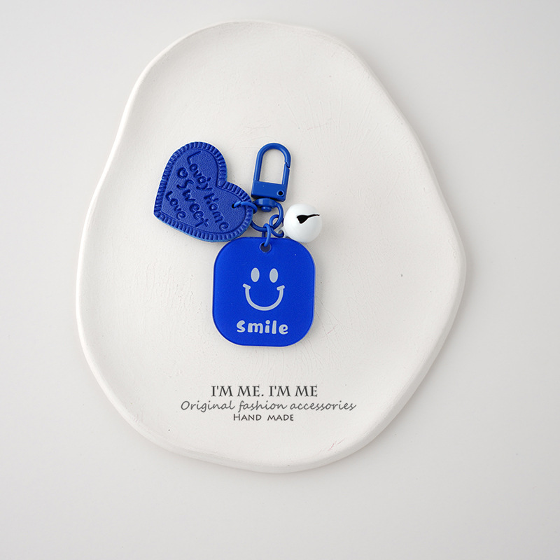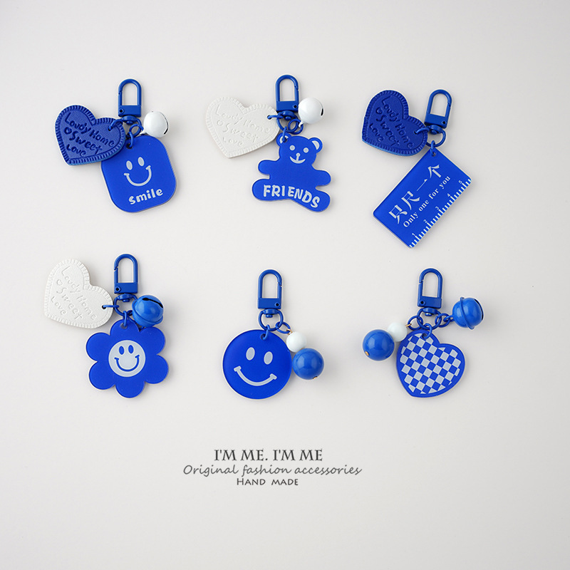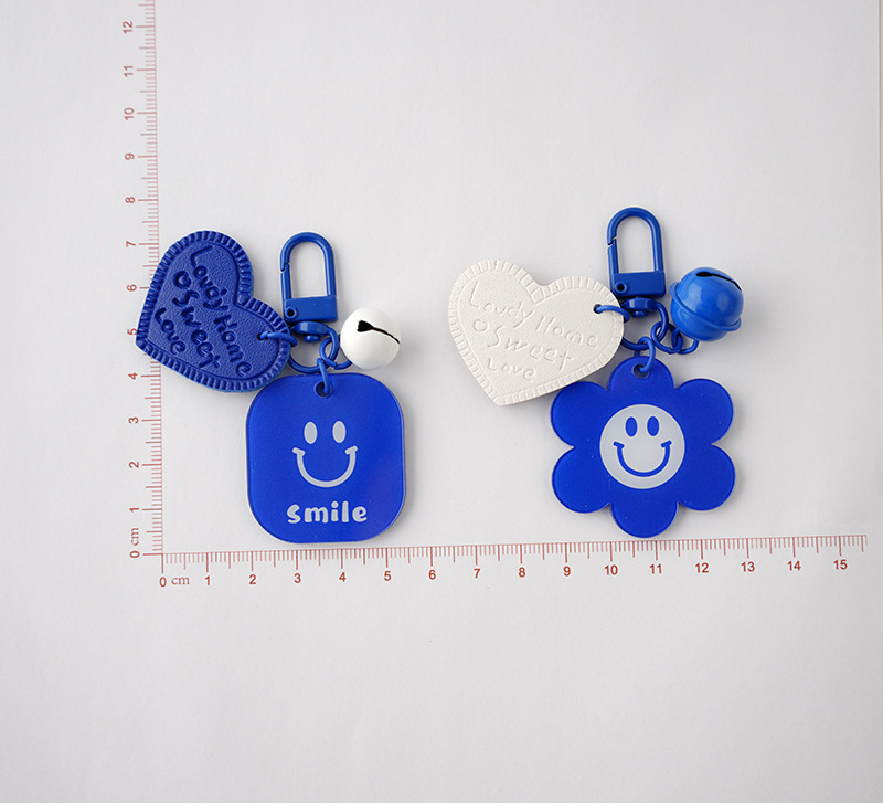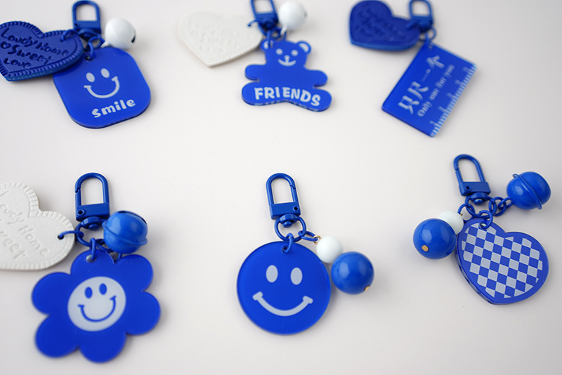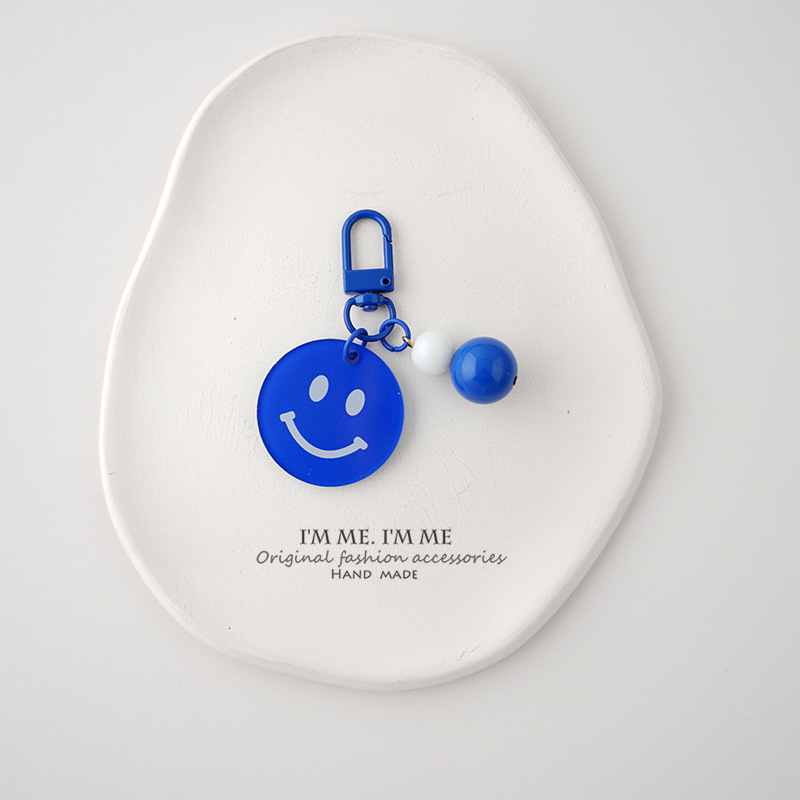 Ornamen tas liontin kunci biru ciche Pasangan gantungan kunci wajah tersenyum merek akrilik dua sisi