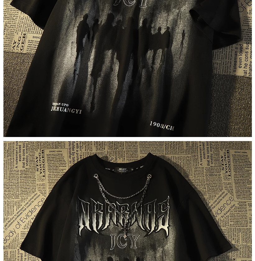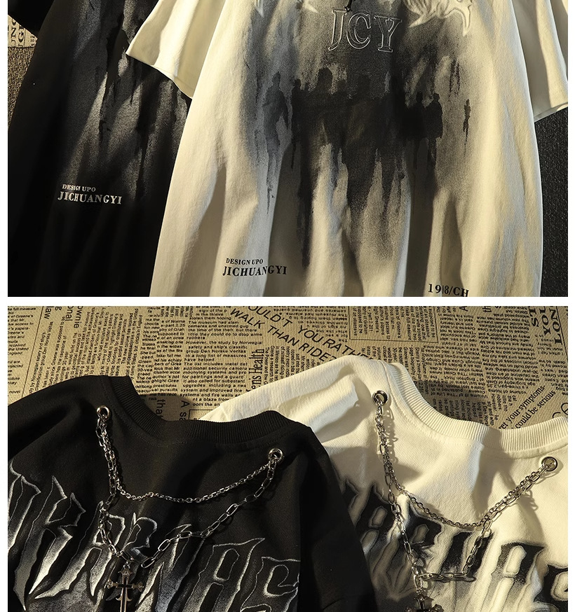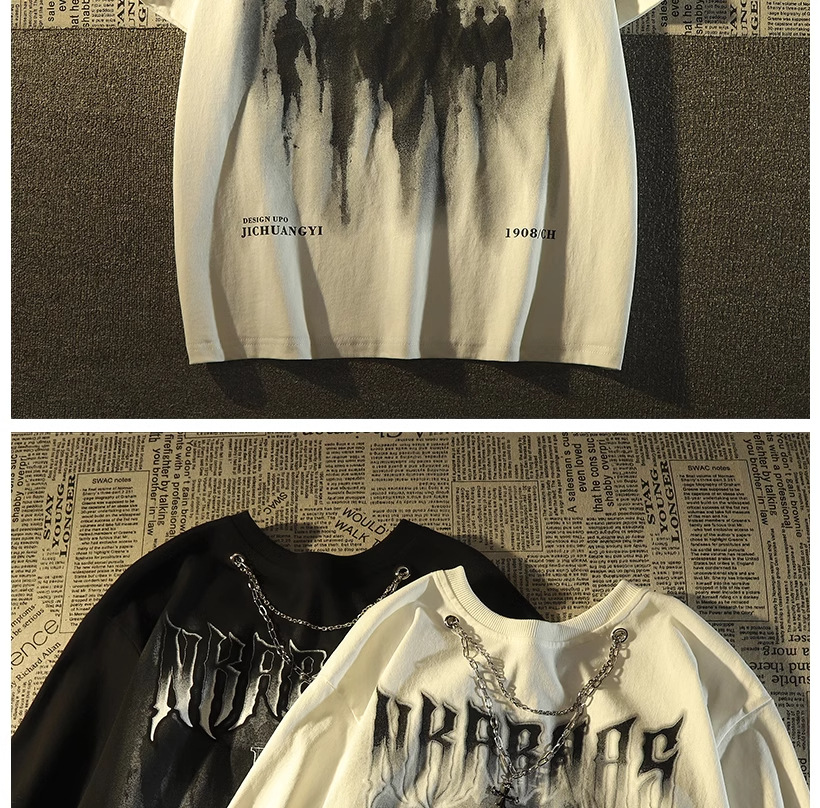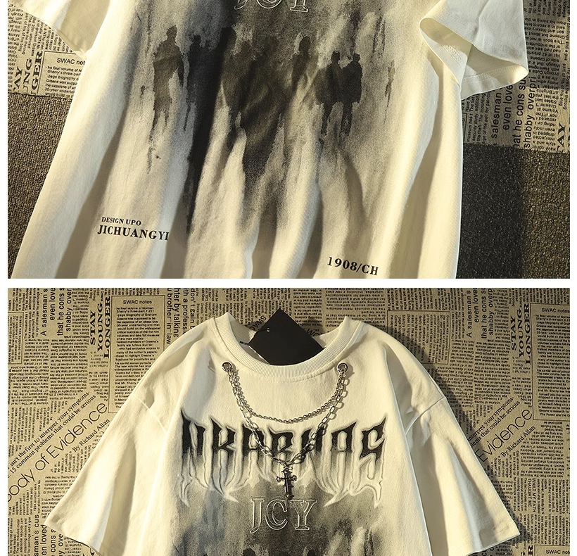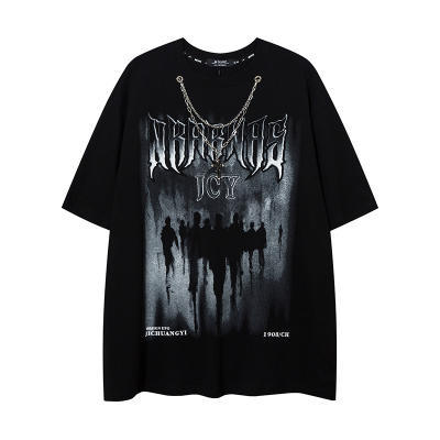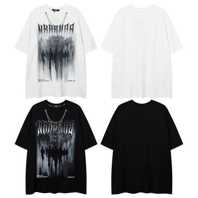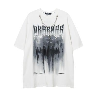 Kaos lengan pendek merek trendi gaya Amerika dengan kalung untuk pria, atasan pasangan hip-hop jalanan retro longgar yang trendi