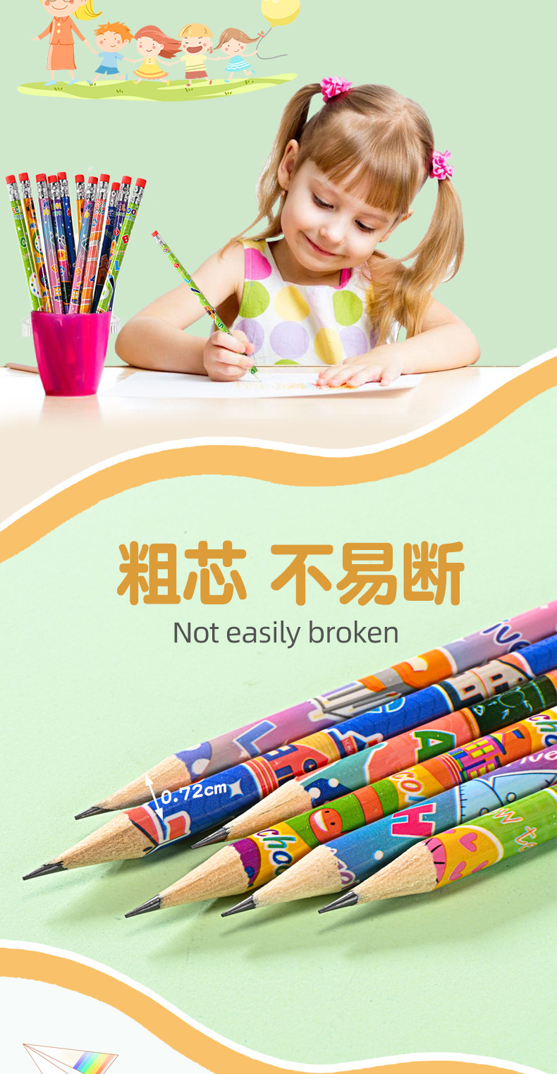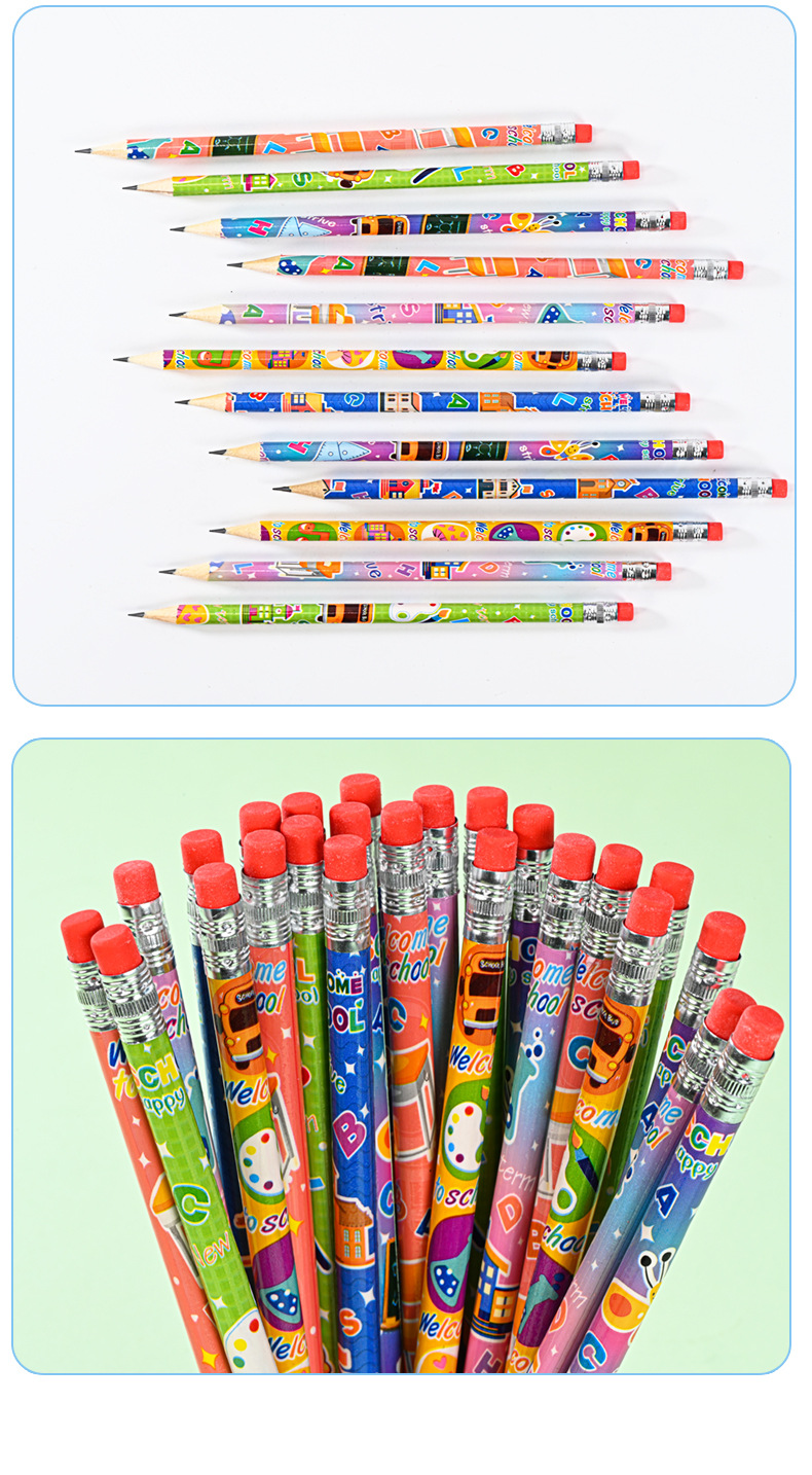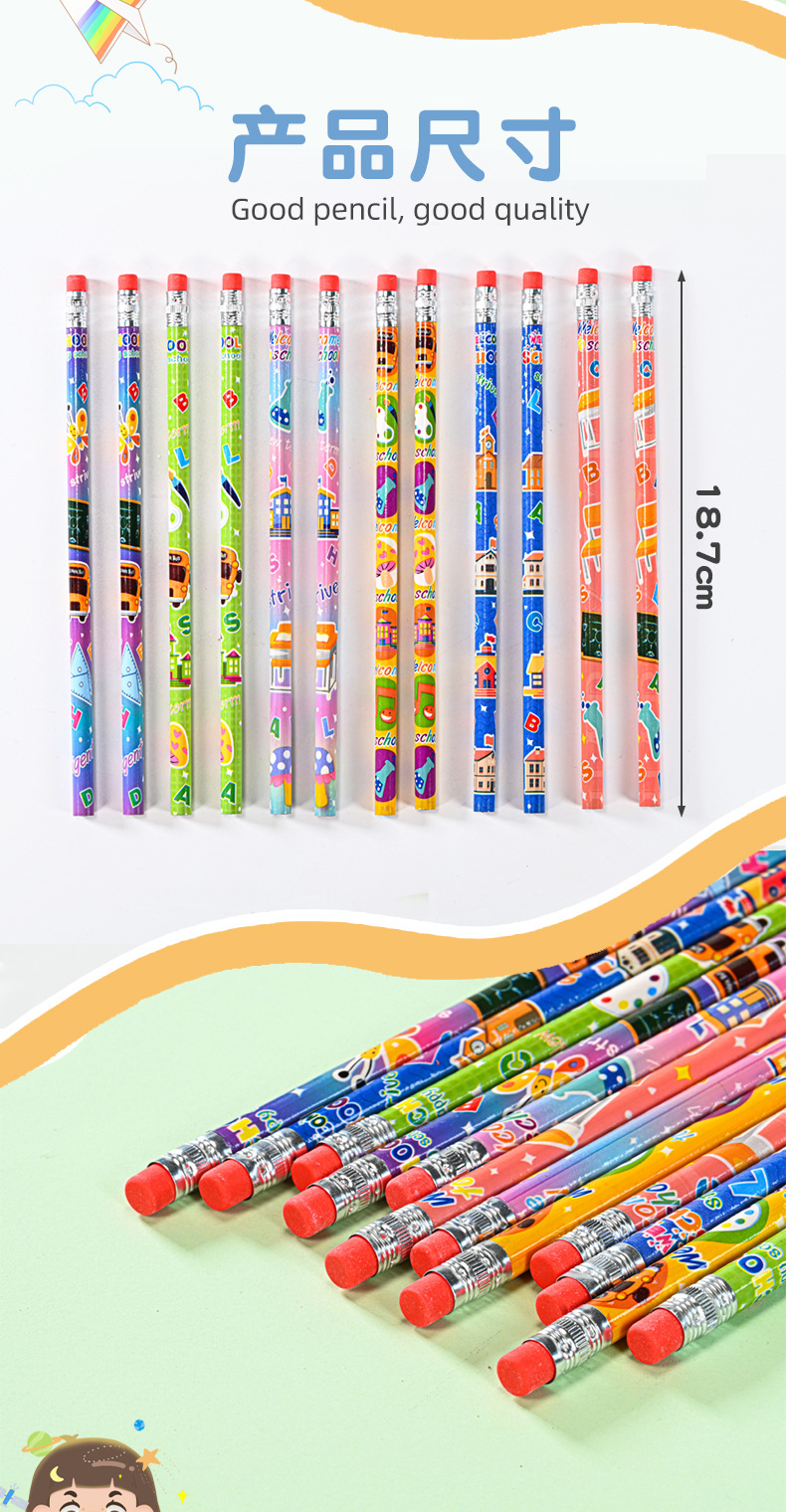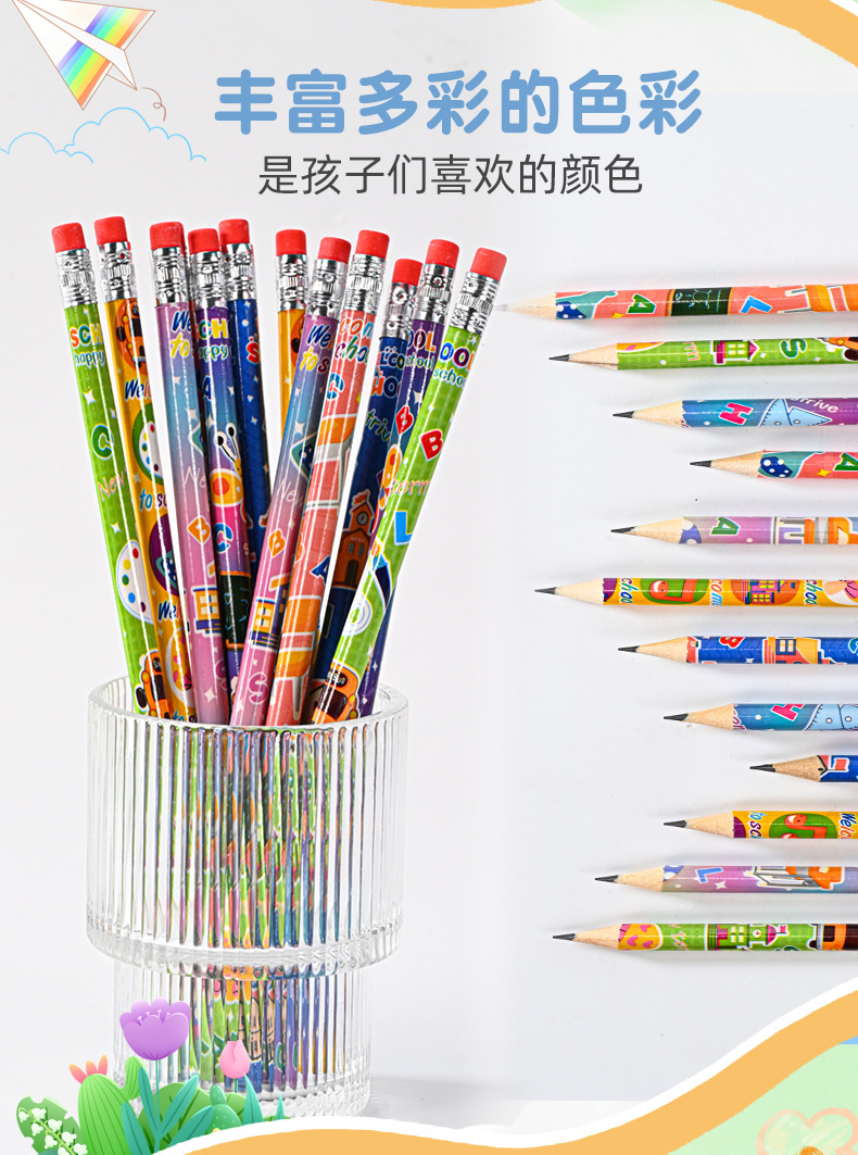 Pensil kartun HB tampilan tinggi 12 warna dapat dihapus seri tema kampus pensil kayu pabrik