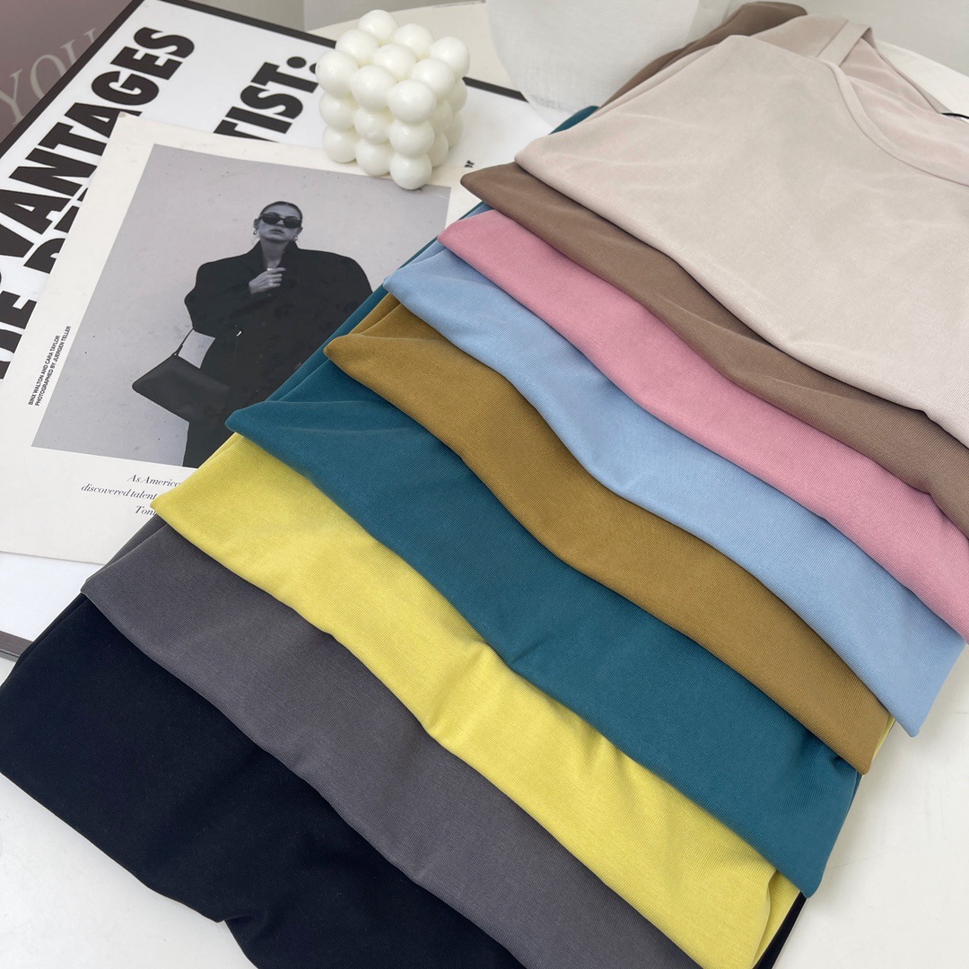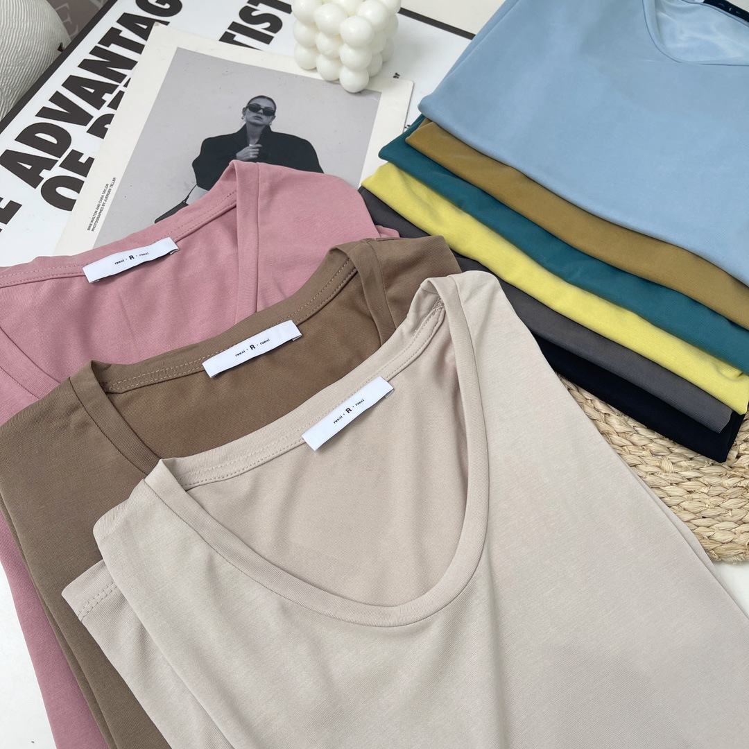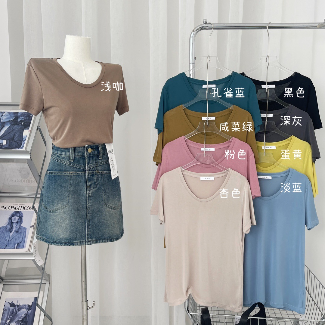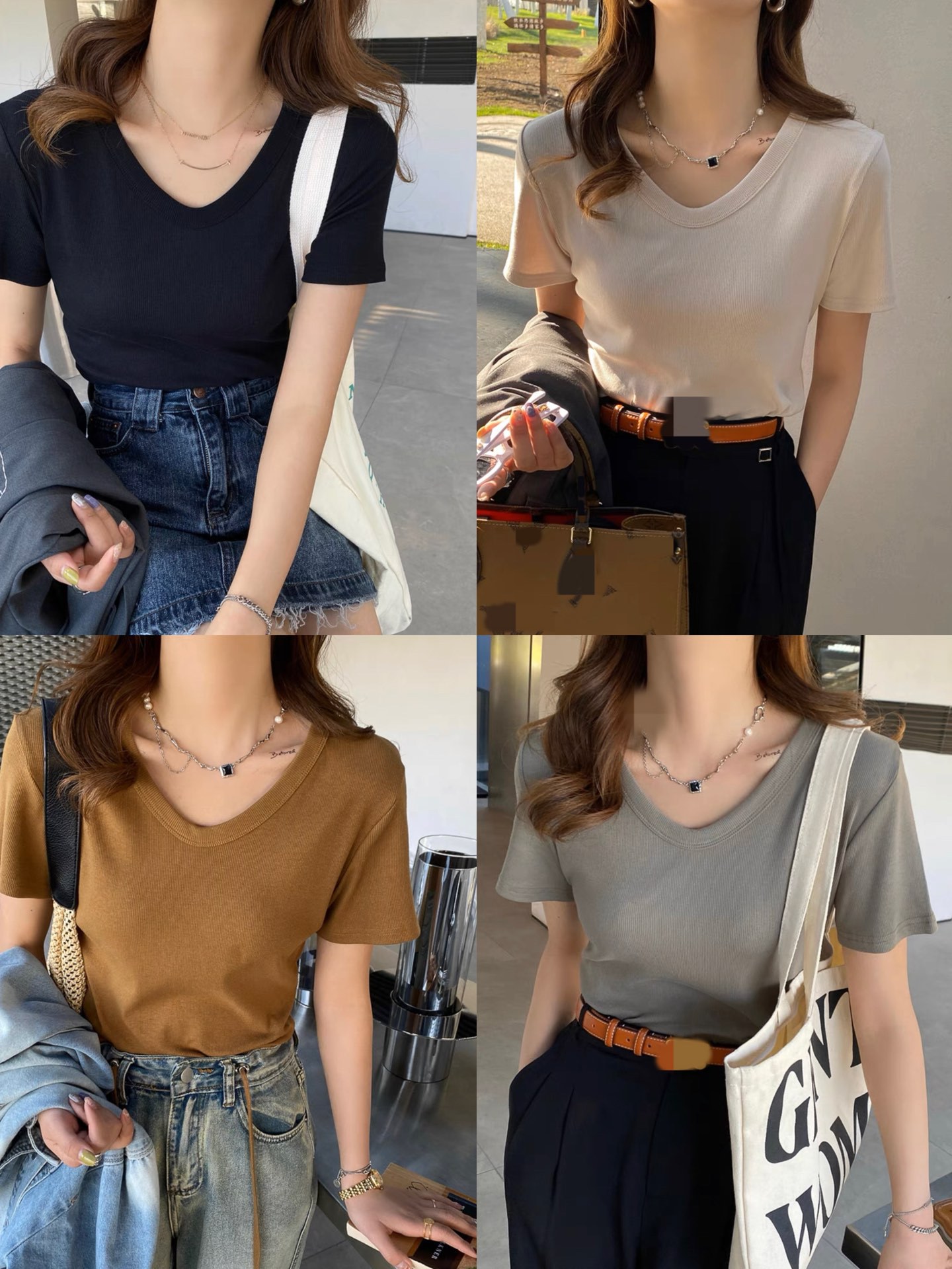 Kaus lengan pendek leher V W00579, kaus dasar tipis slim-fit musim panas 2023 dengan warna solid, atasan pelangsing