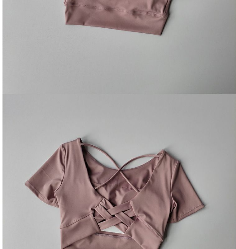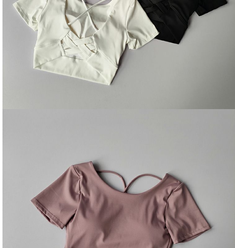 Kaus pakaian yoga wanita, baju olahraga lari fitness lengan pendek tipis berongga tali kecantikan