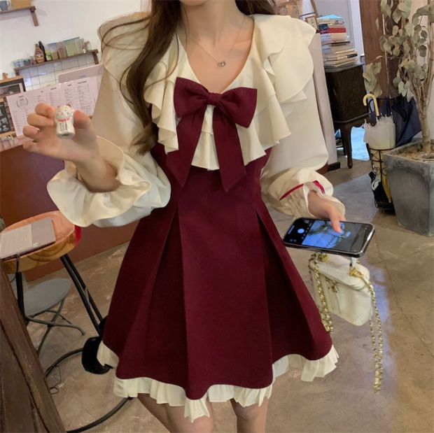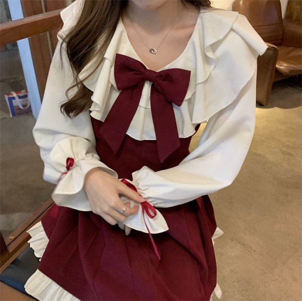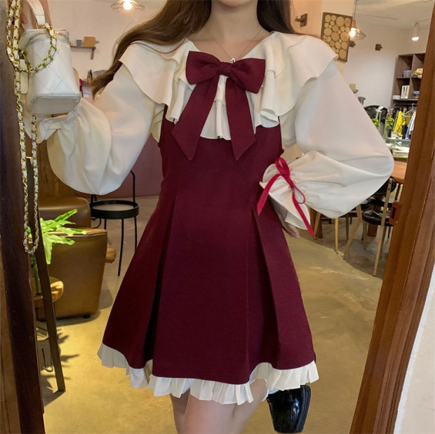 Gaun suspender pita merah wanita, baju olahraga gaya putri elegan lembut lucu baru