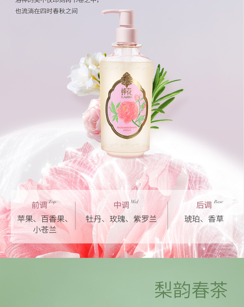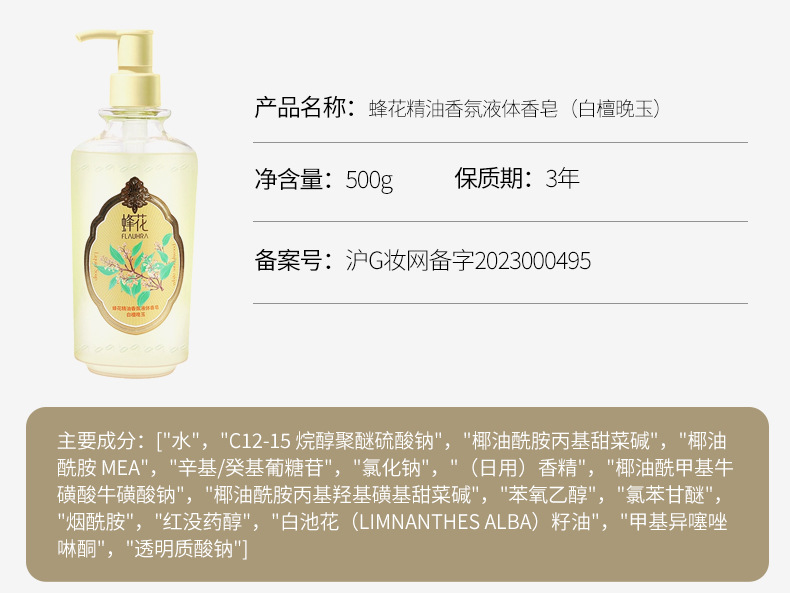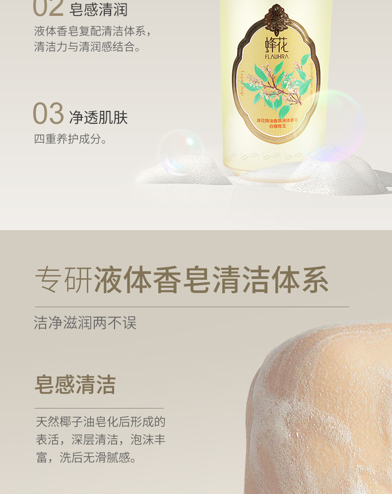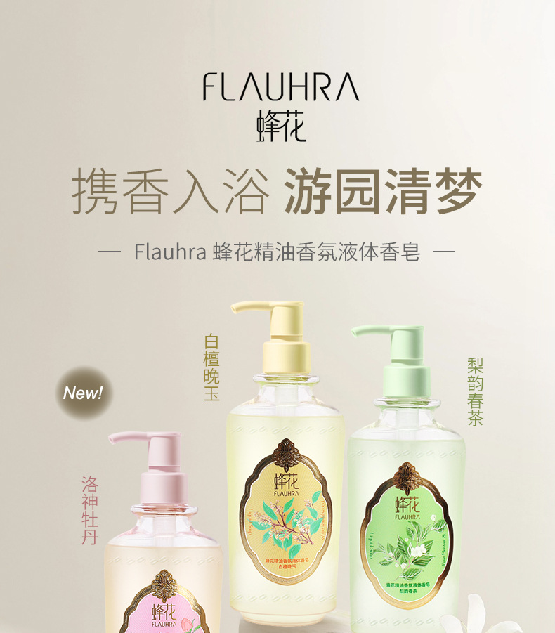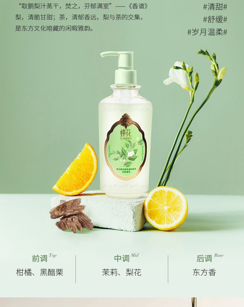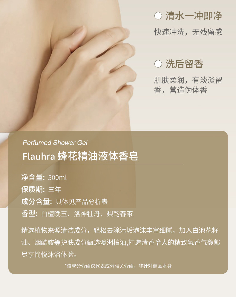 FLAUHRA sabun cair wangi bunga lebah, sabun mandi pria dan wanita giok malam kayu cendana putih 500g