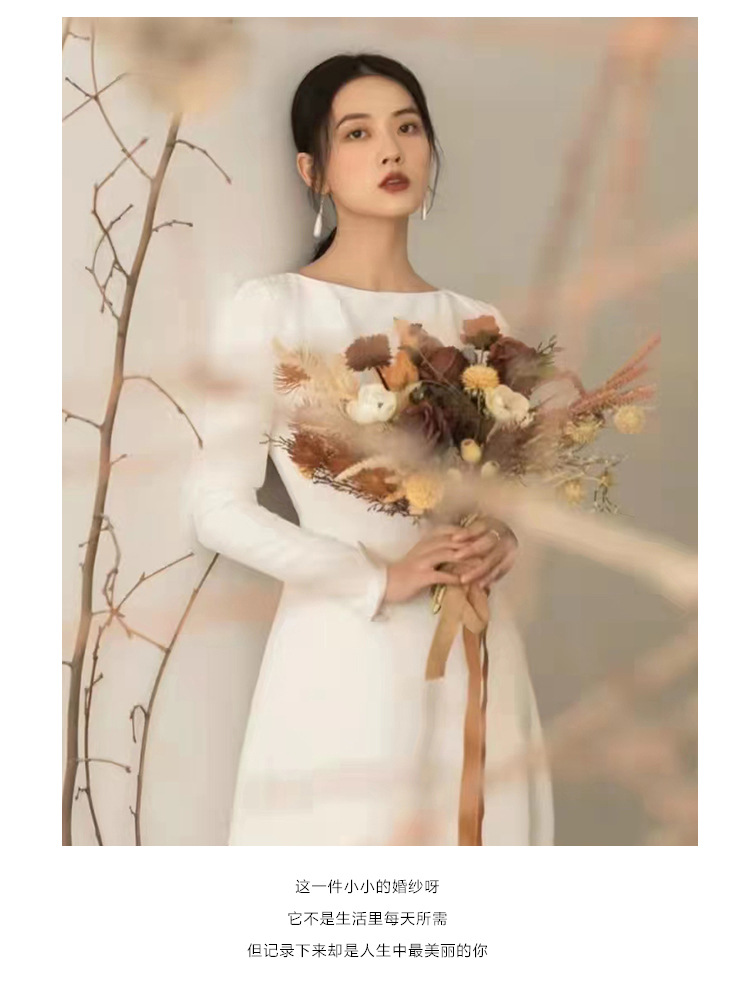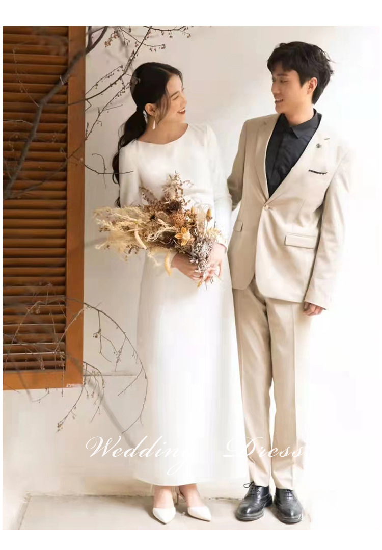 Gaun pernikahan ringan gaya perancis, gaun malam Mori lengan panjang elegan ramping nyaman pengantin luar ruangan satin putih