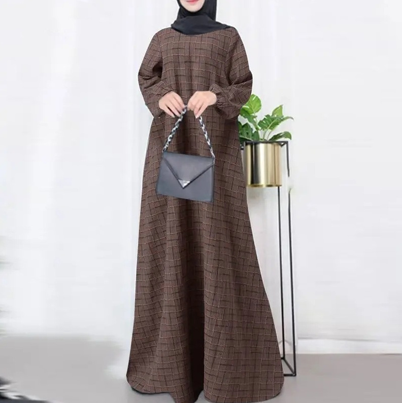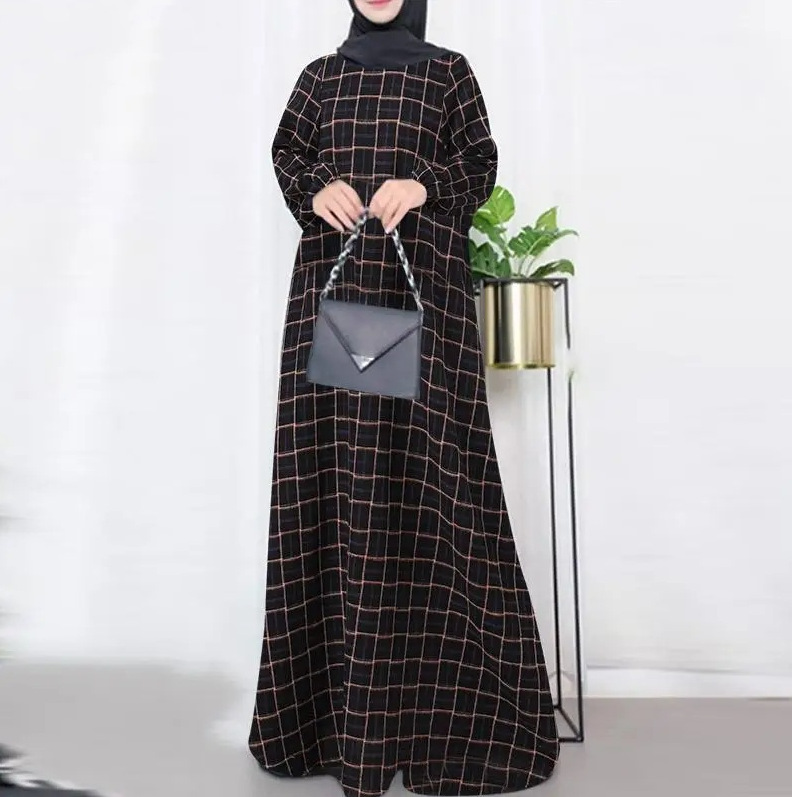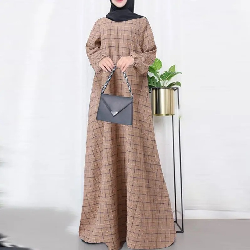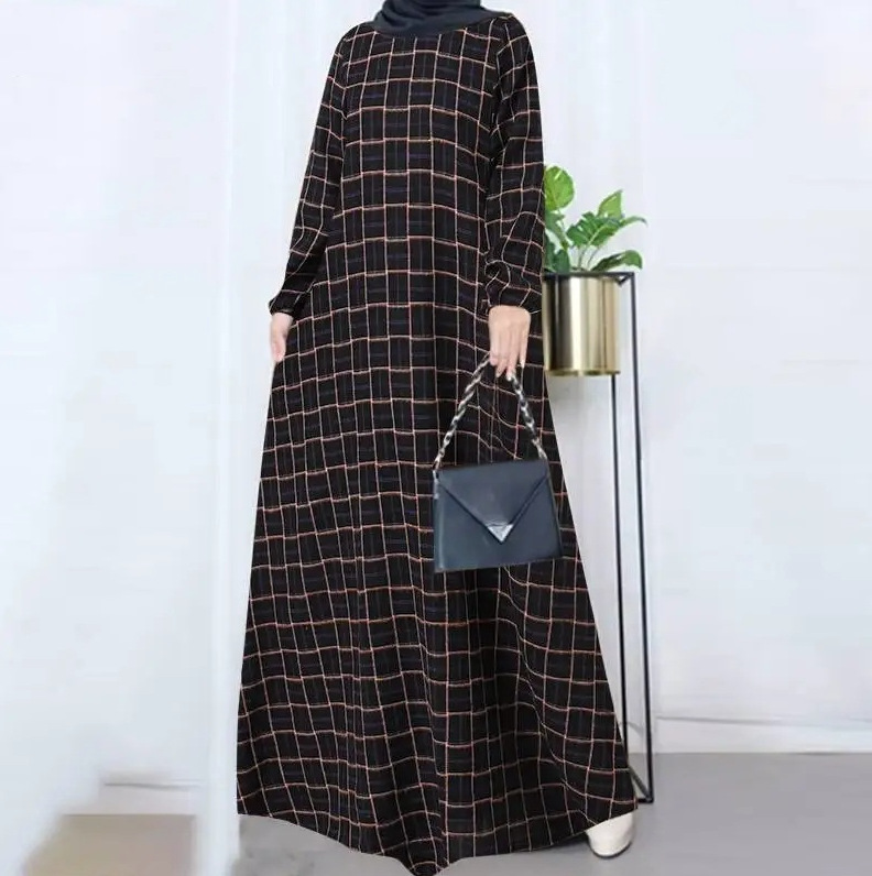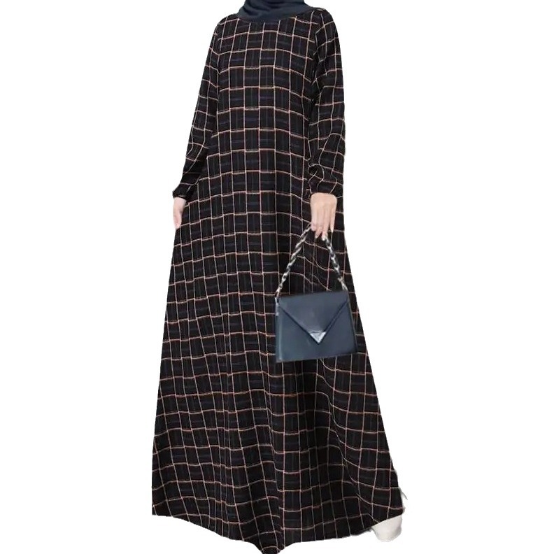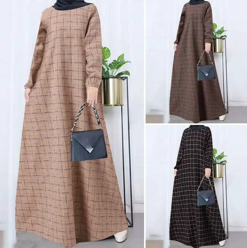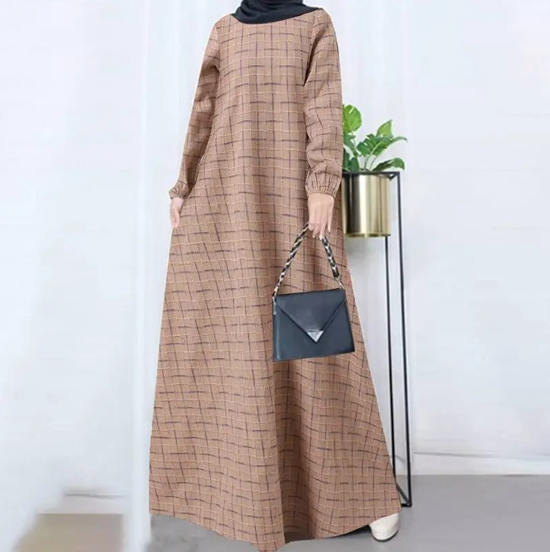 Baju Wanita Muslim lengan panjang, baju katun linen vintage Lengan Panjang kotak-kotak leher bulat kasual longgar musim gugur 2024