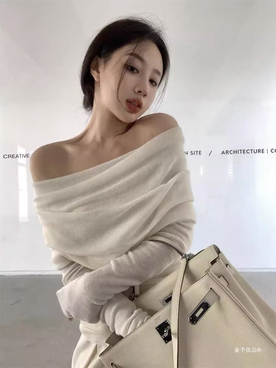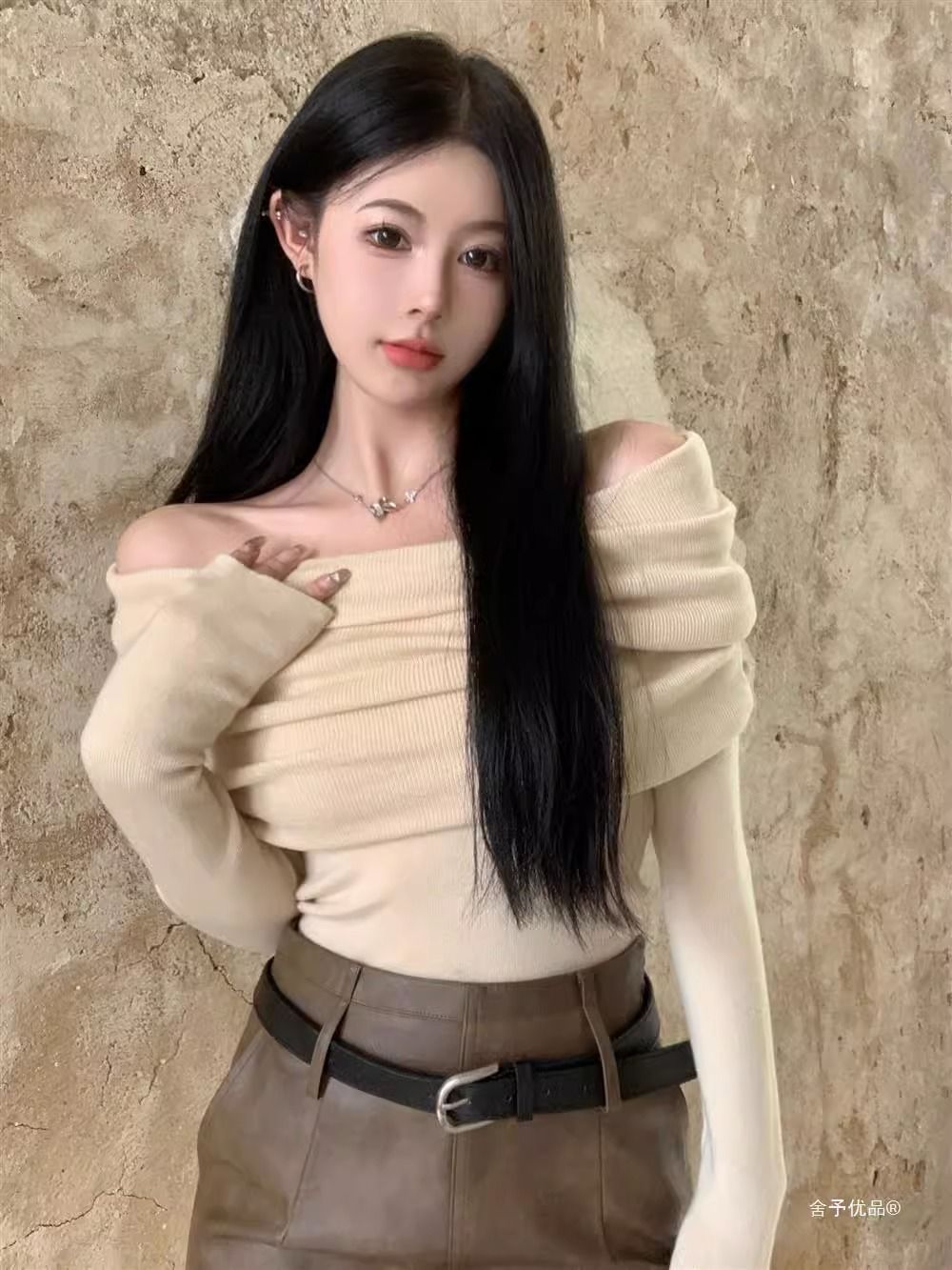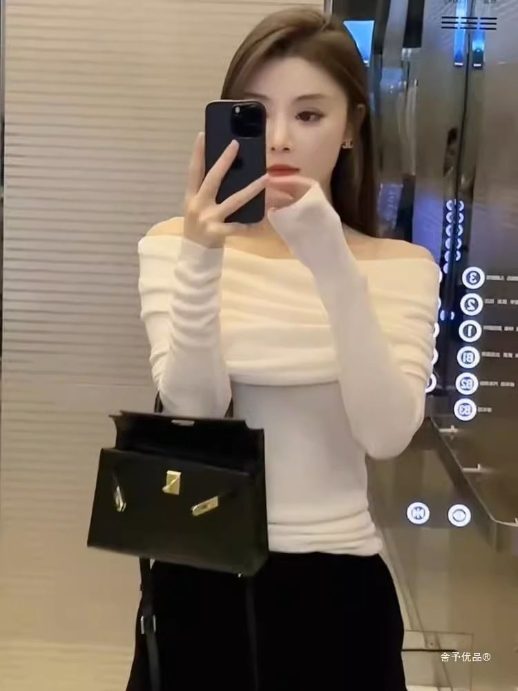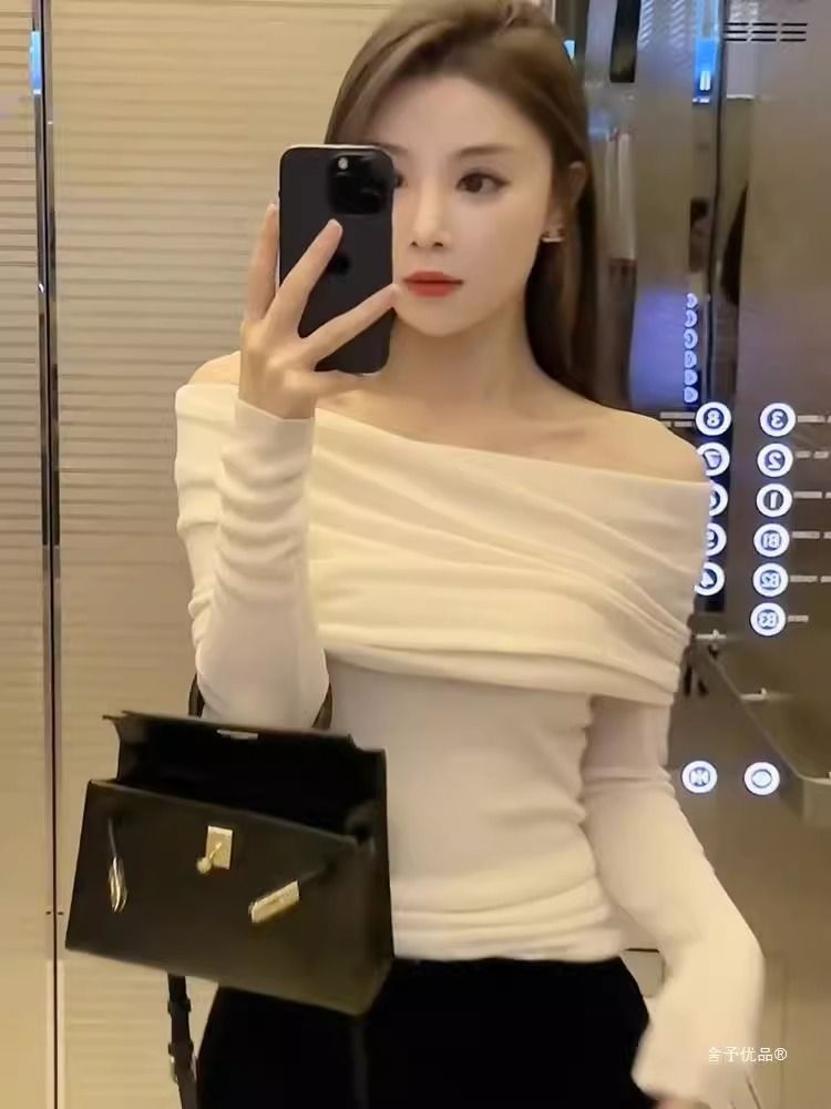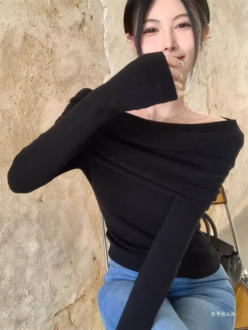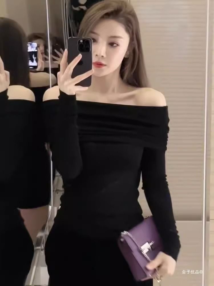 Sweater bahu terbuka wanita, Atasan kemeja Dalaman tulang selempang off-shoulder ramping lengan panjang musim gugur dan musim dingin