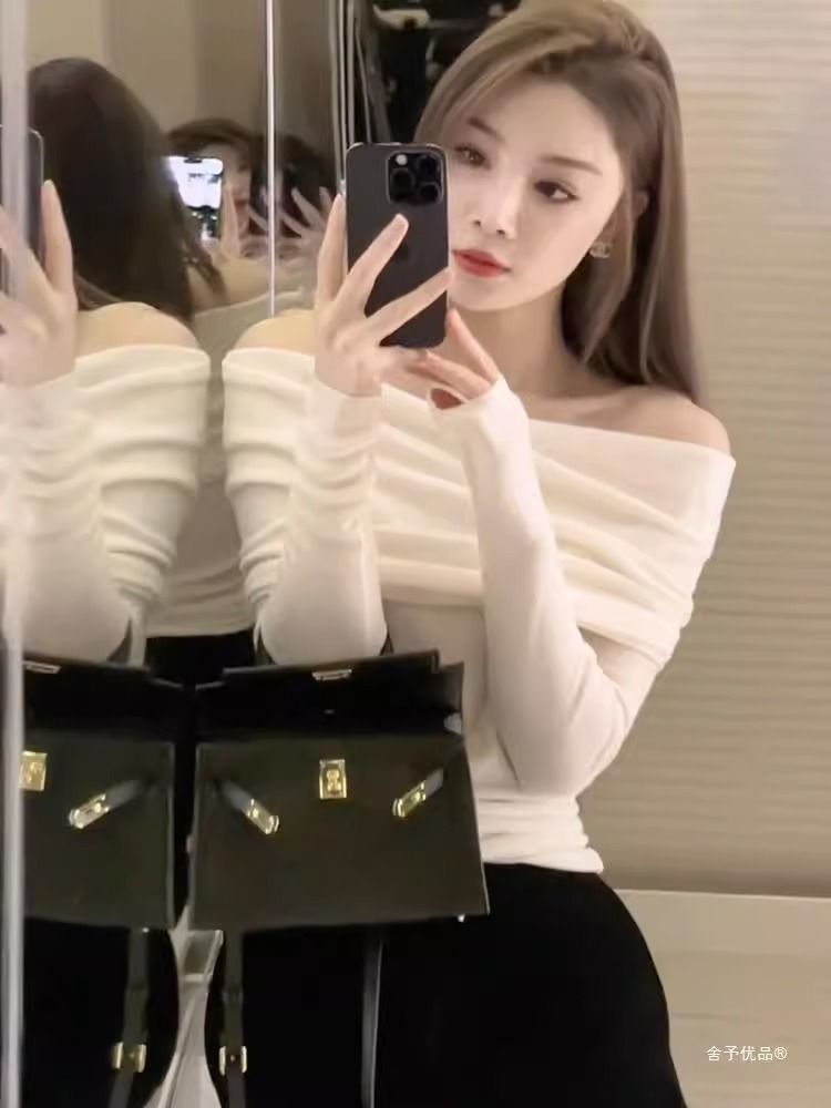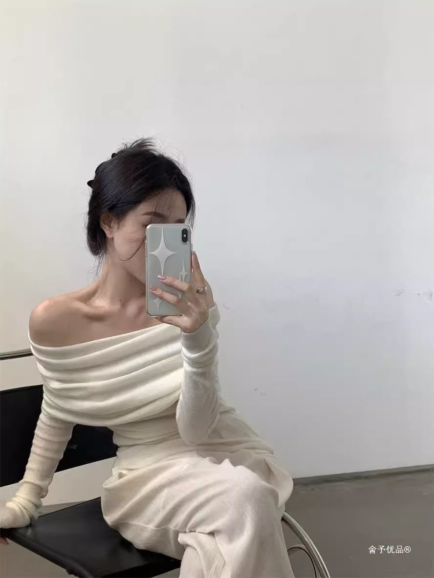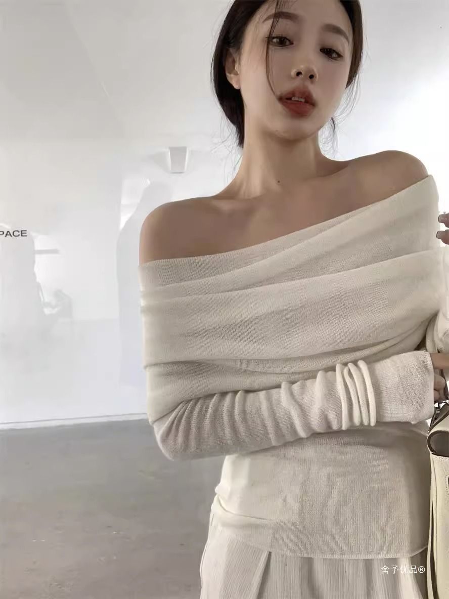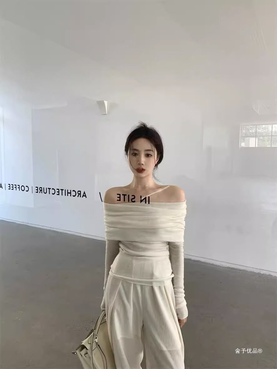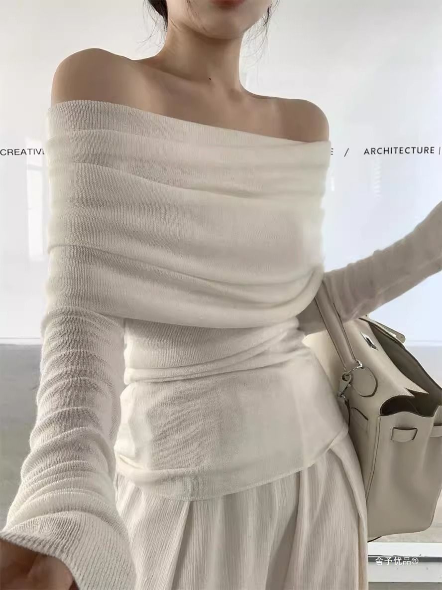 Sweater bahu terbuka wanita, Atasan kemeja Dalaman tulang selempang off-shoulder ramping lengan panjang musim gugur dan musim dingin