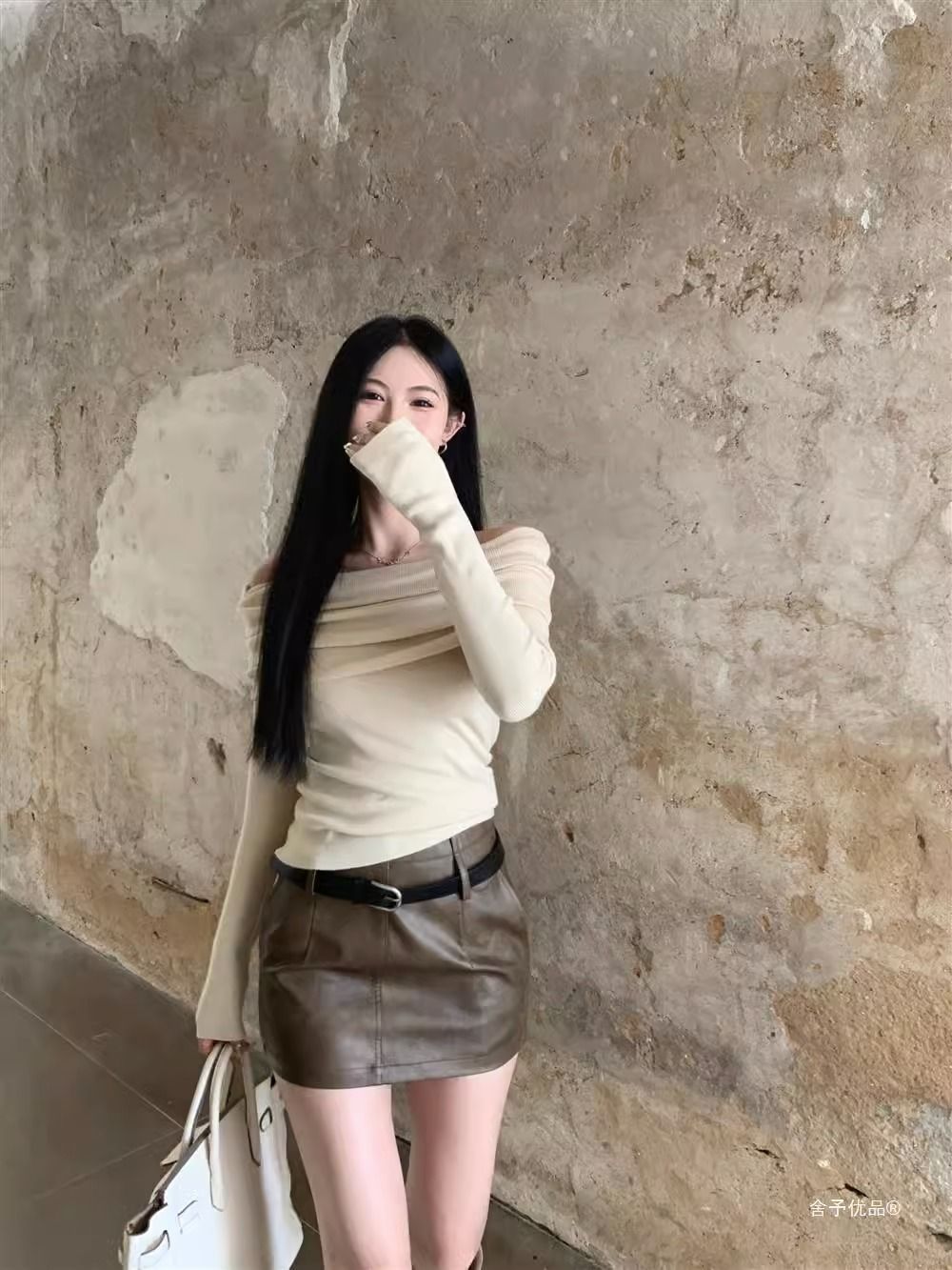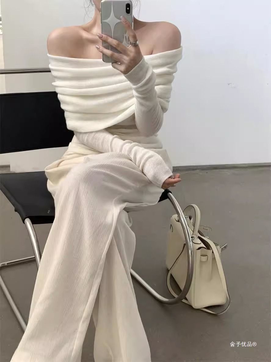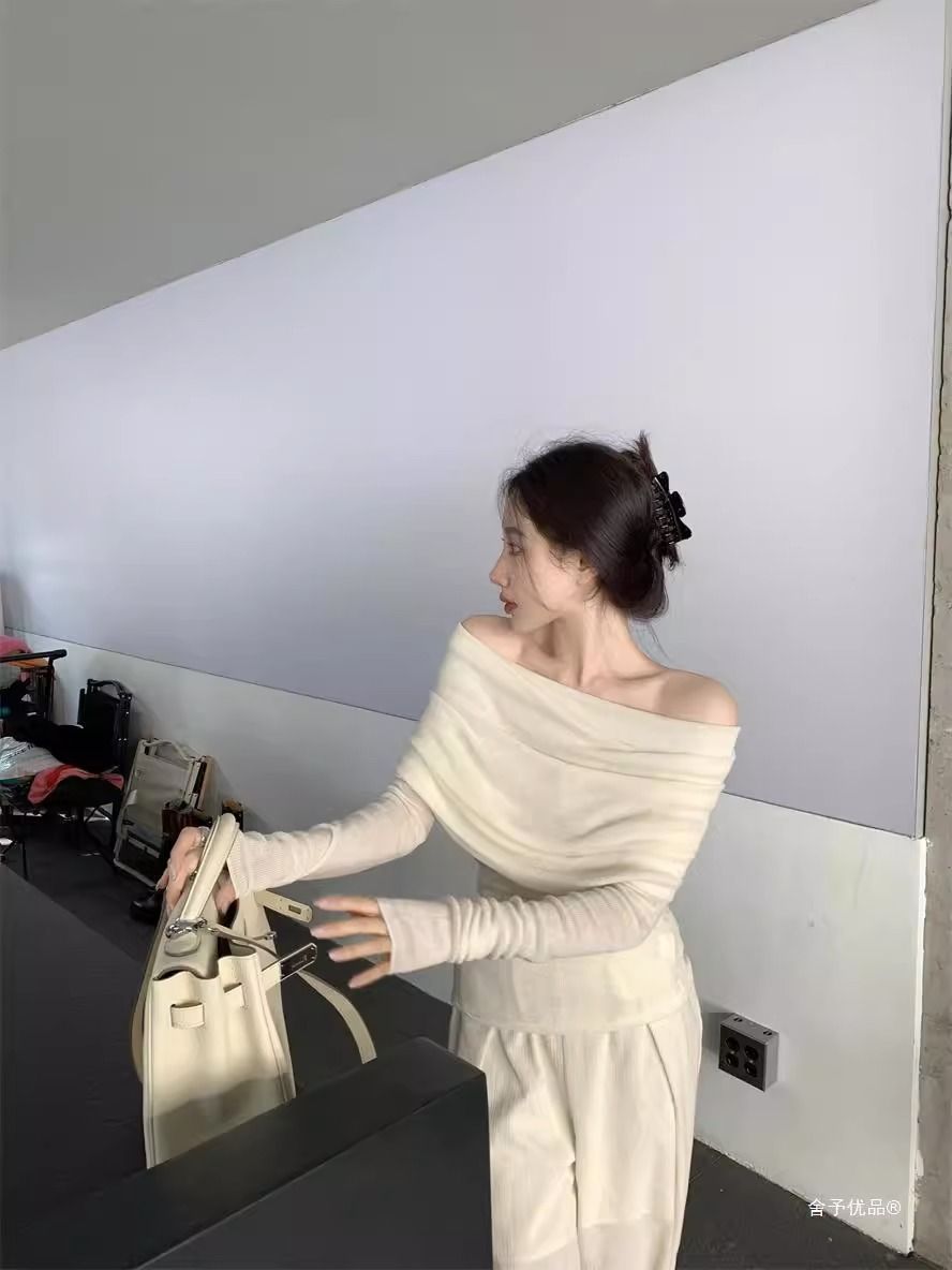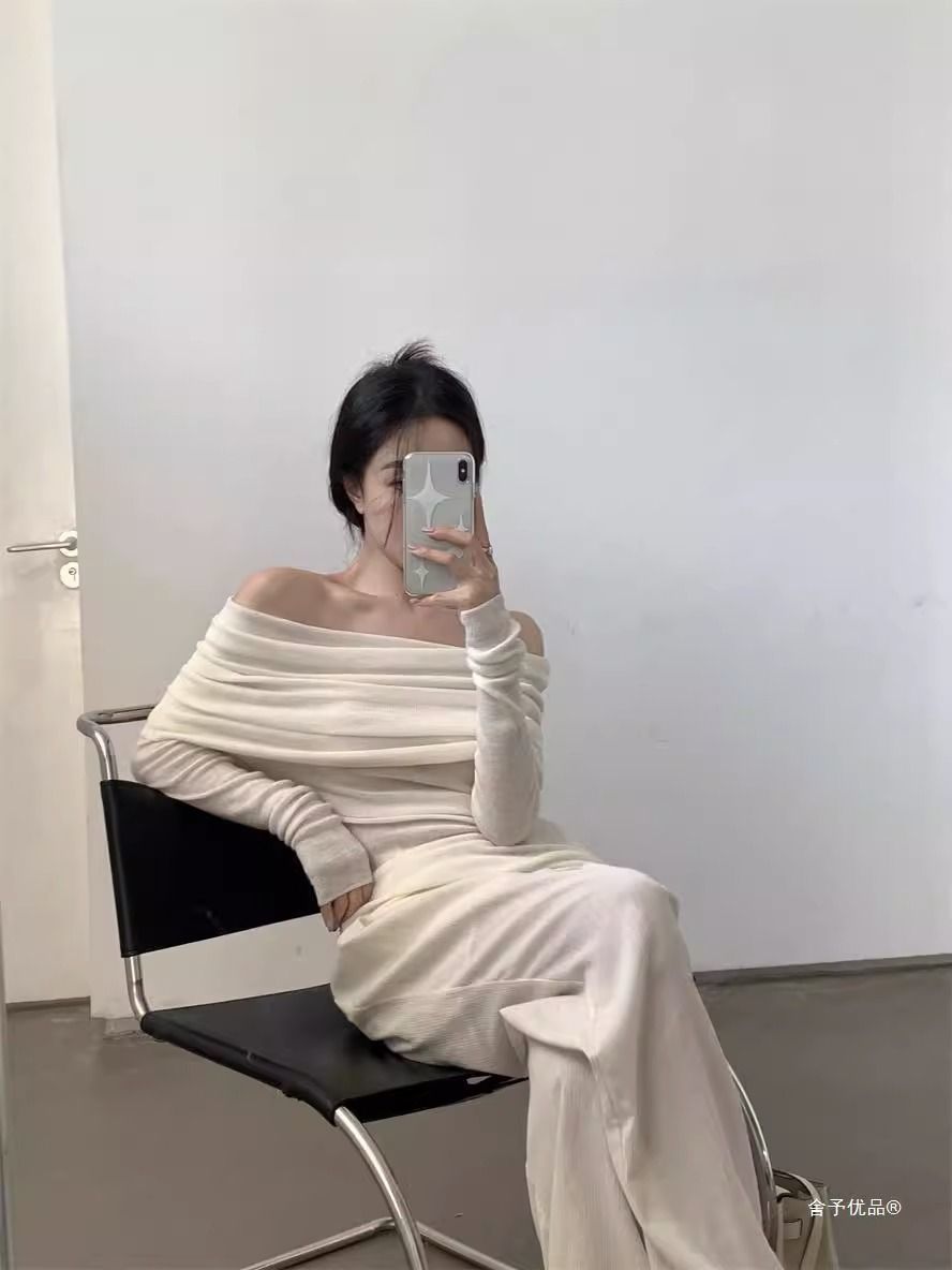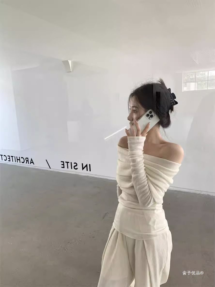Sweater bahu terbuka wanita, Atasan kemeja Dalaman tulang selempang off-shoulder ramping lengan panjang musim gugur dan musim dingin