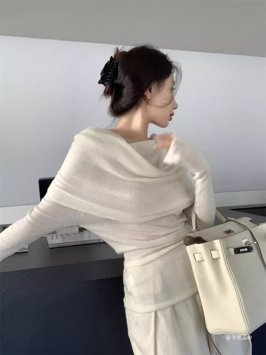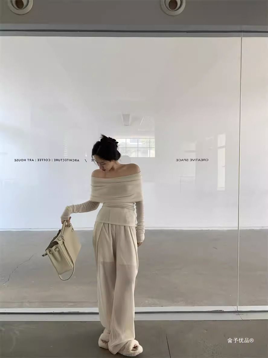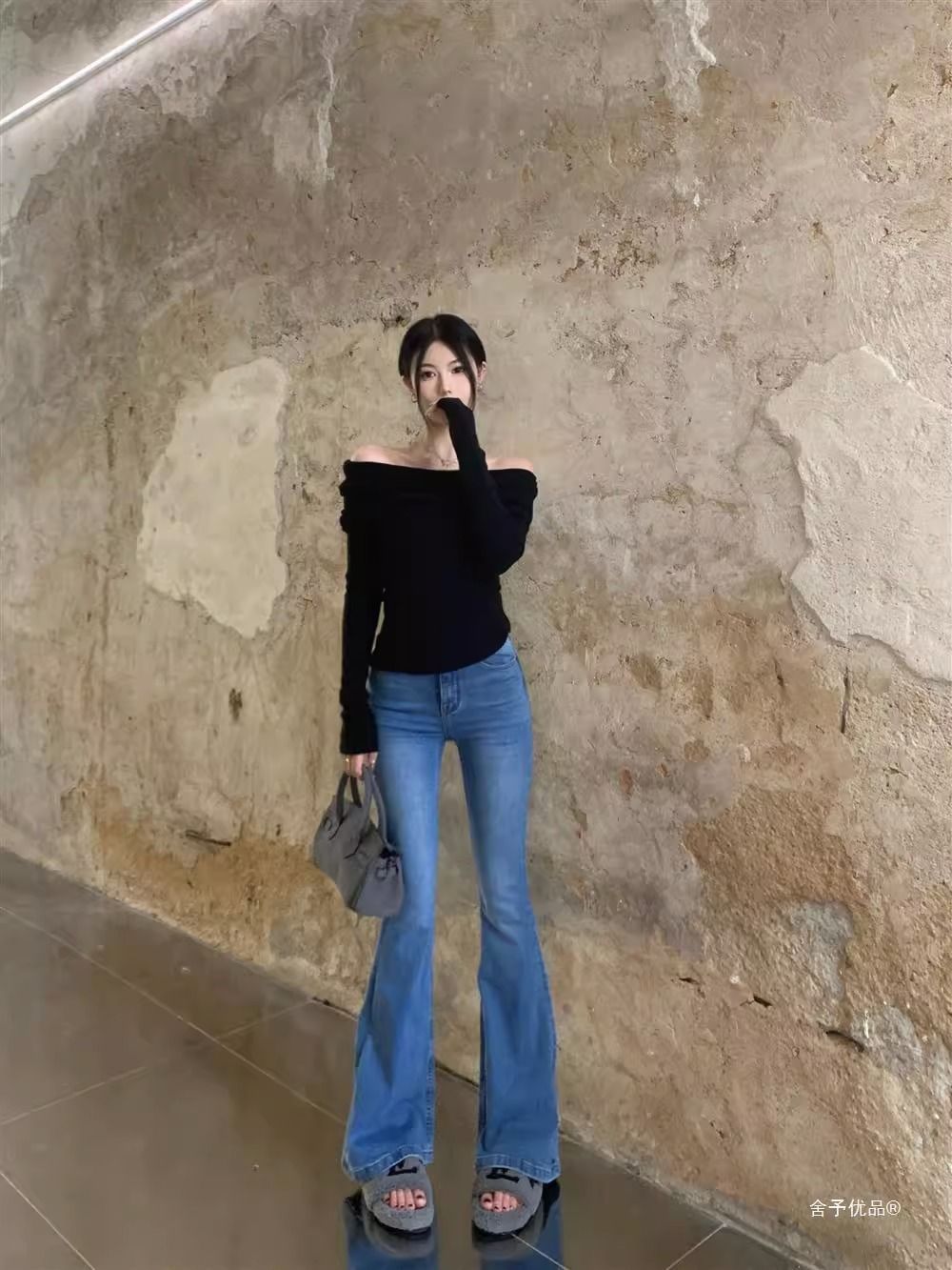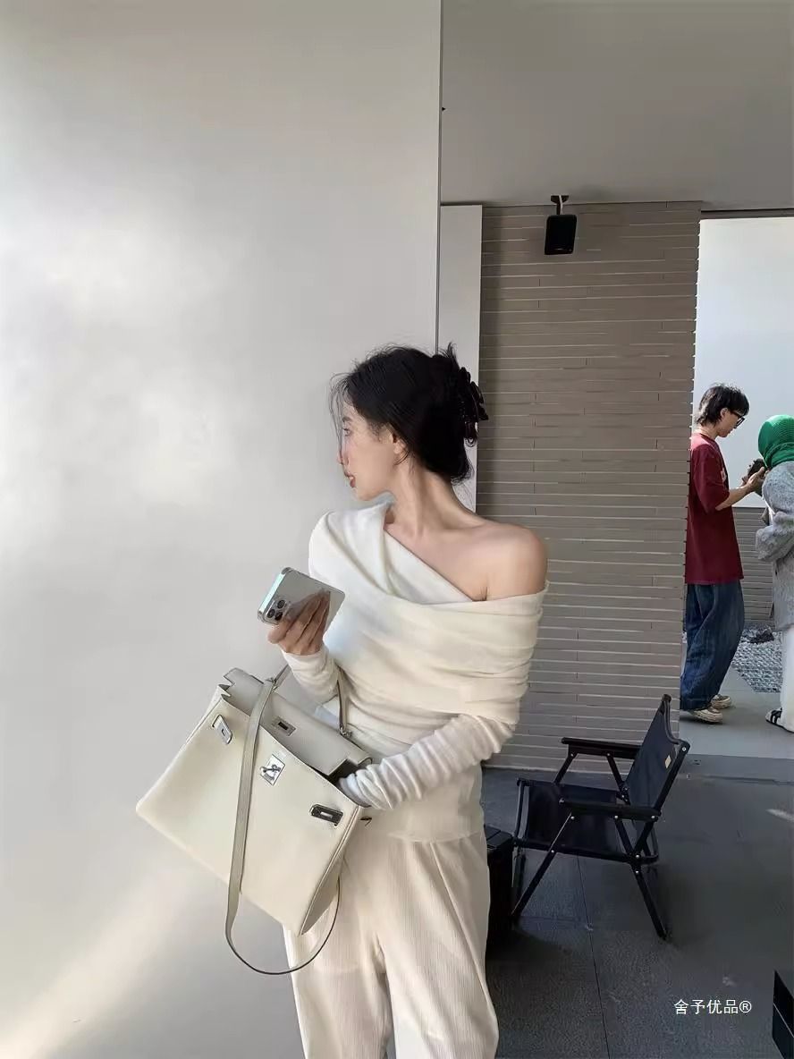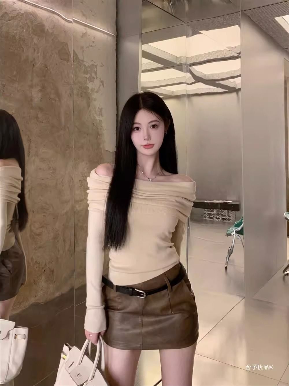 Sweater bahu terbuka wanita, Atasan kemeja Dalaman tulang selempang off-shoulder ramping lengan panjang musim gugur dan musim dingin