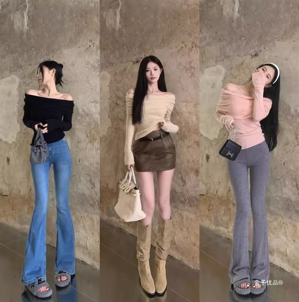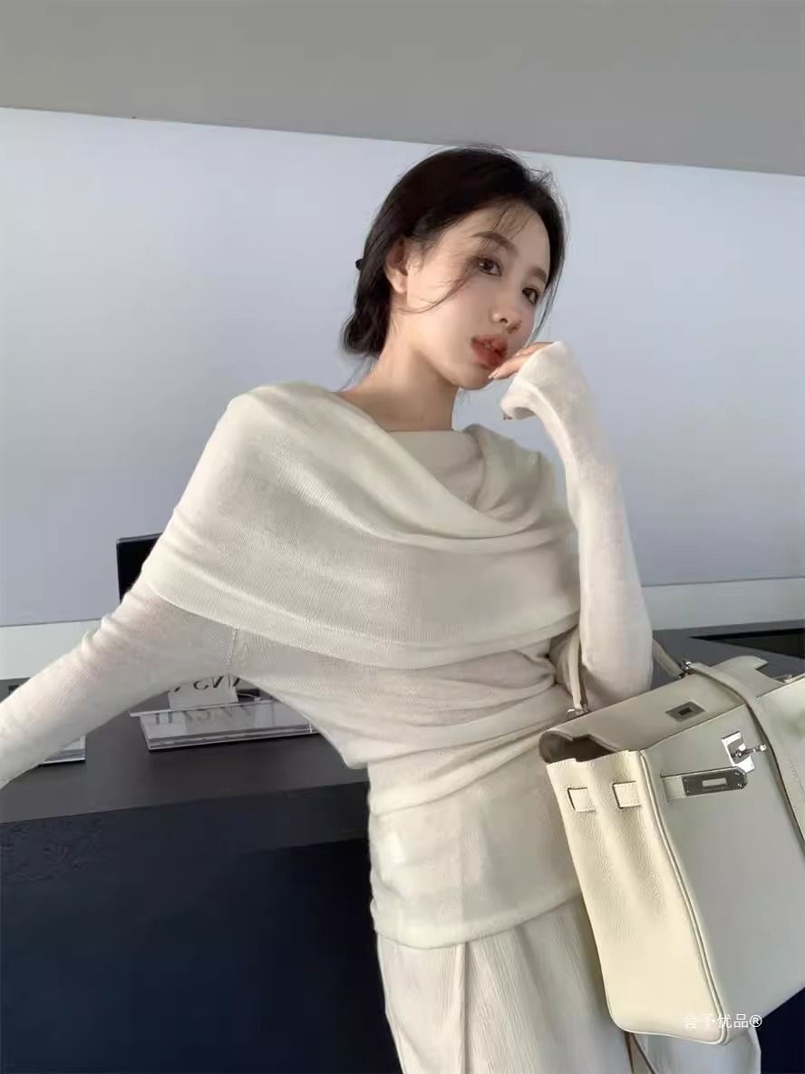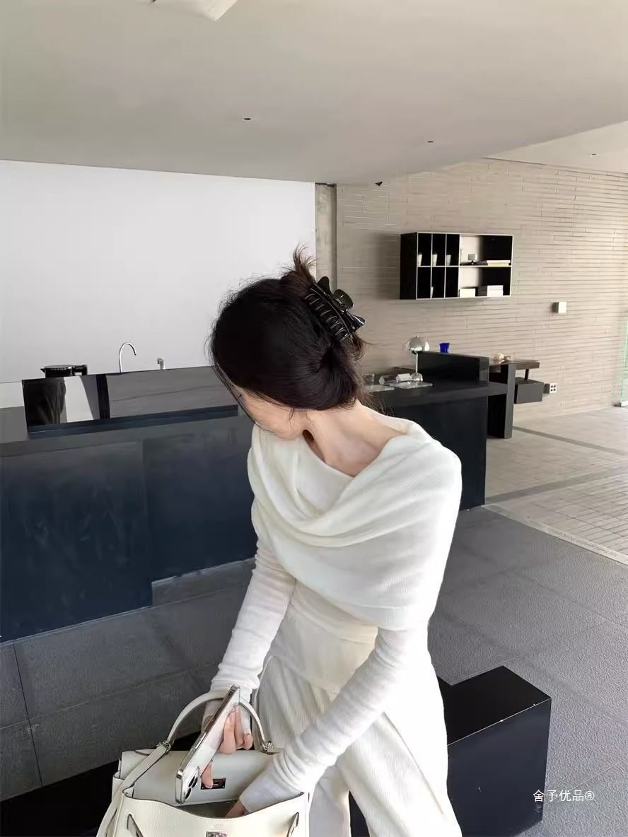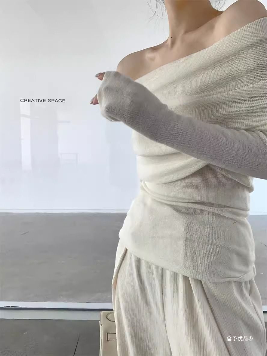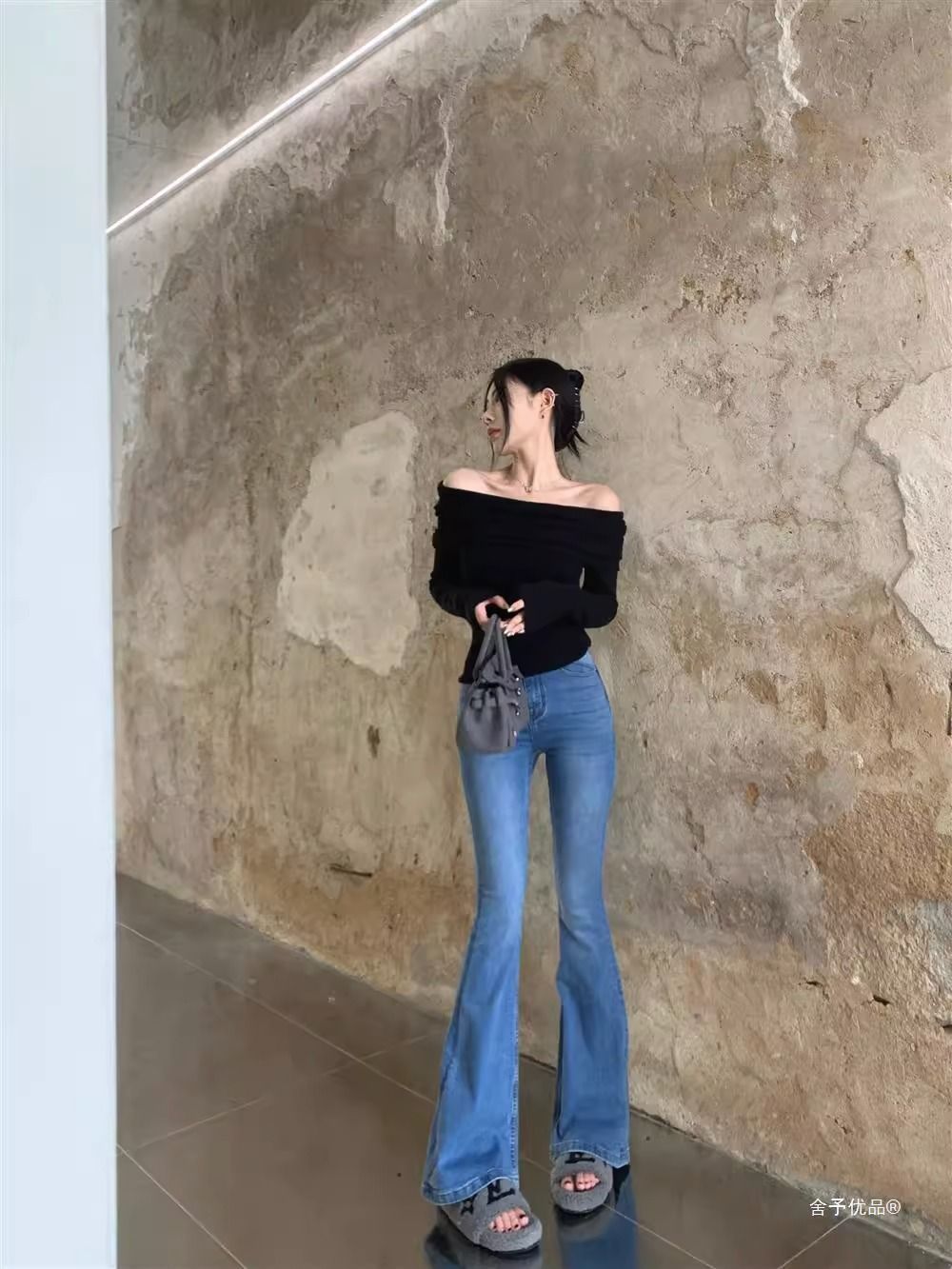Sweater bahu terbuka wanita, Atasan kemeja Dalaman tulang selempang off-shoulder ramping lengan panjang musim gugur dan musim dingin