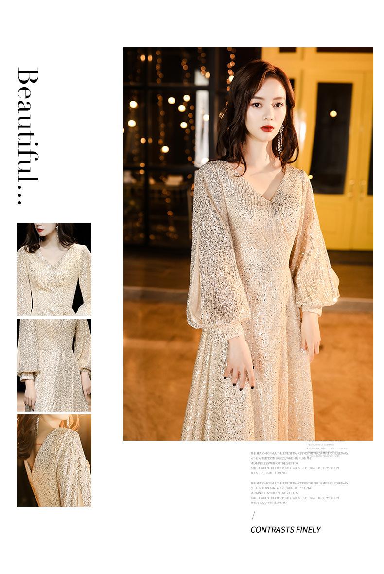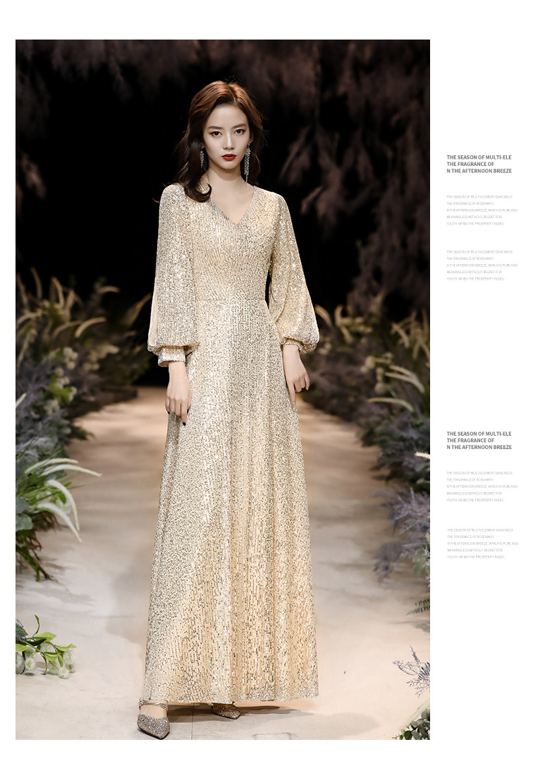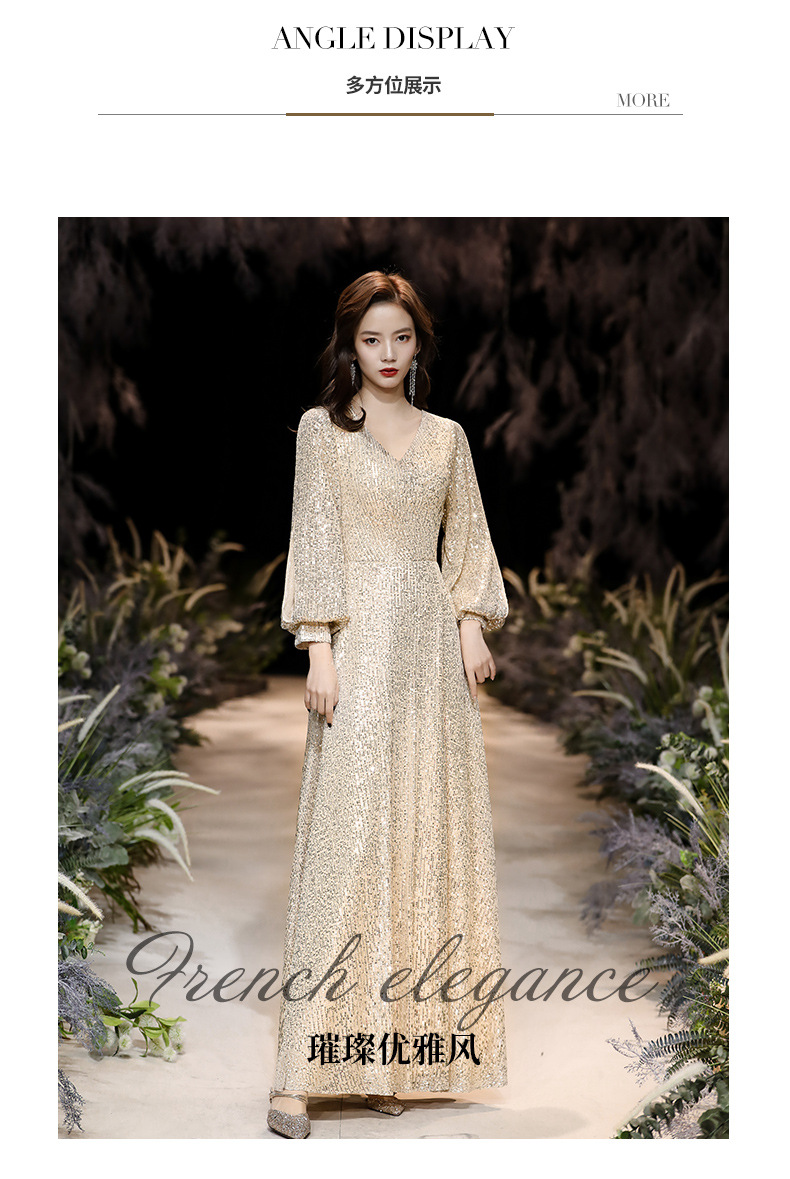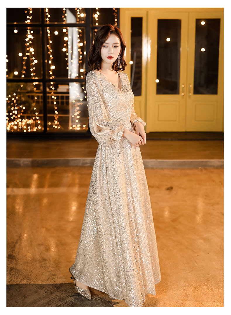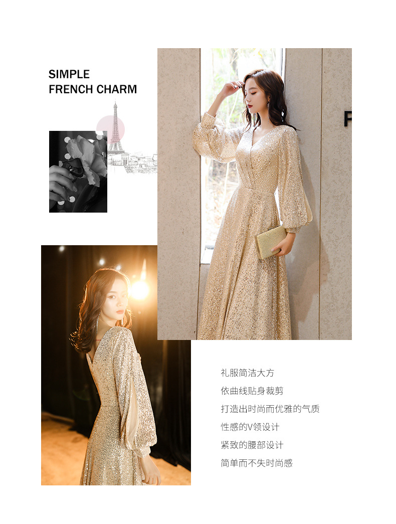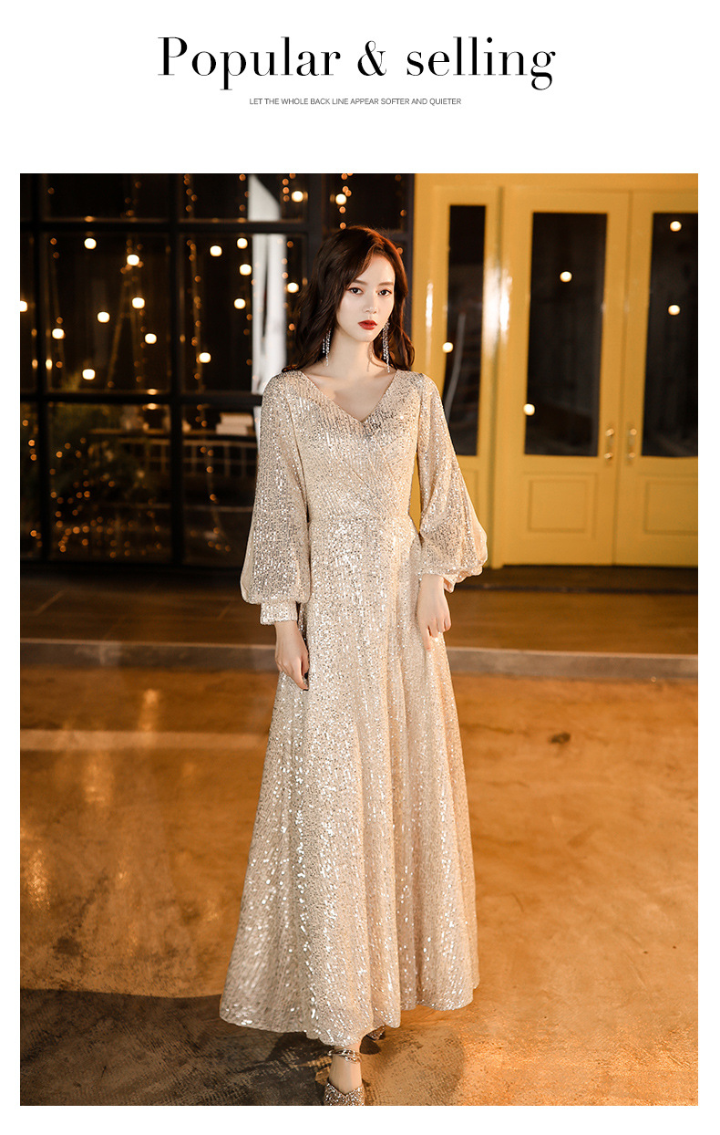 Gaun malam pesta tahunan warna champagne berpayet, kerah V, lengan panjang, model baru musim dingin 2026, pasokan pabrik.
