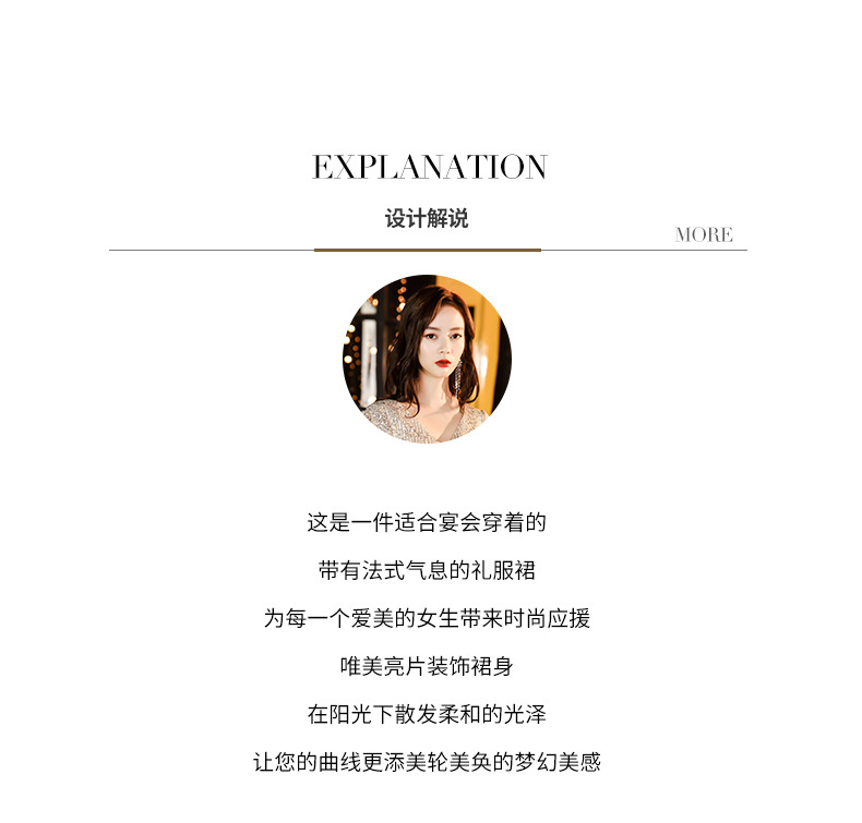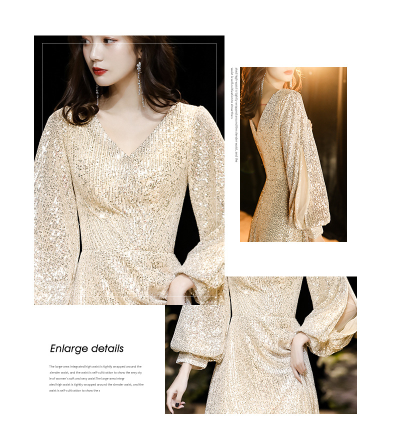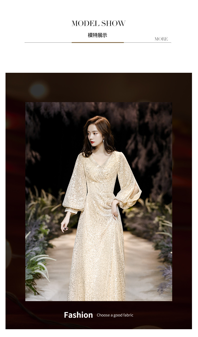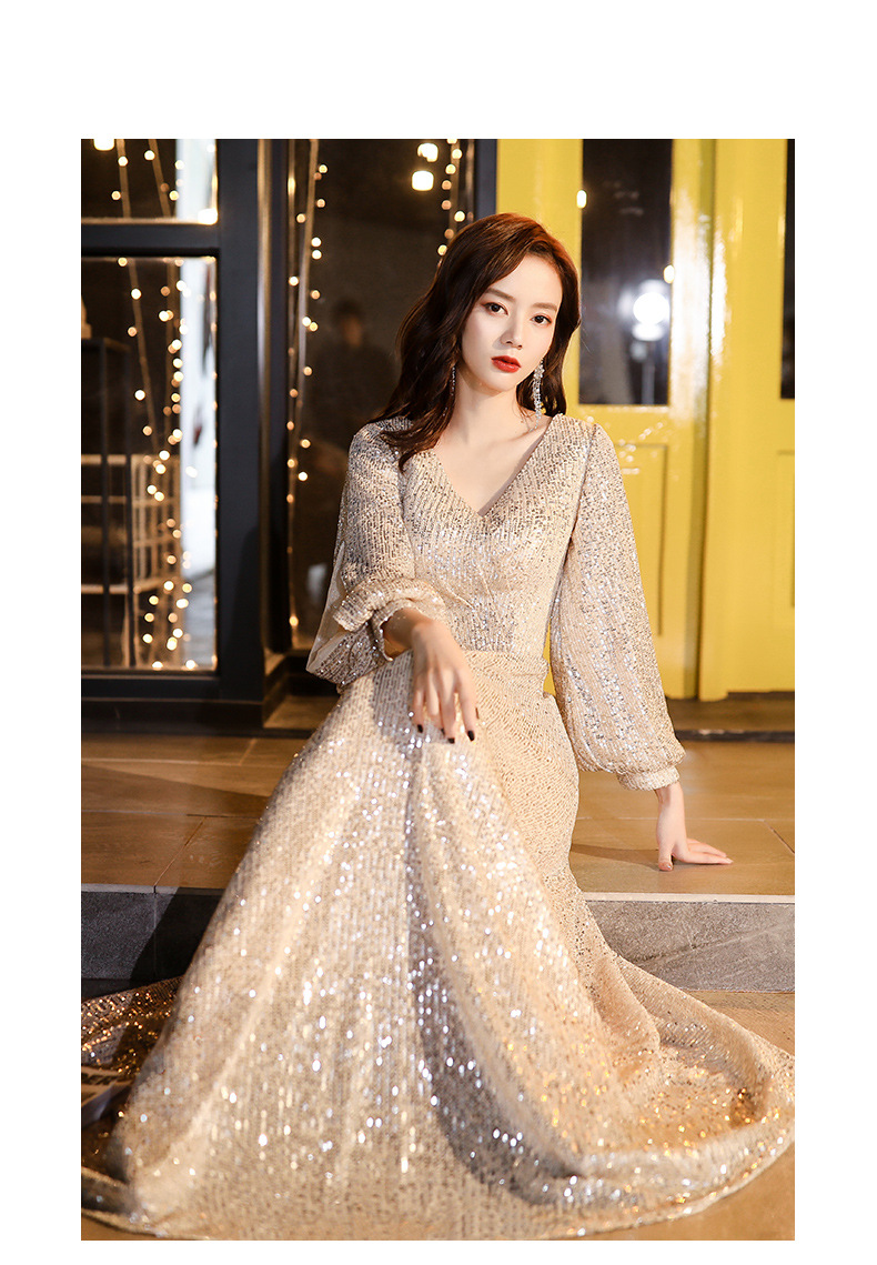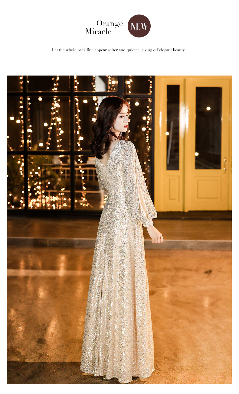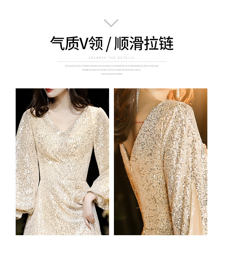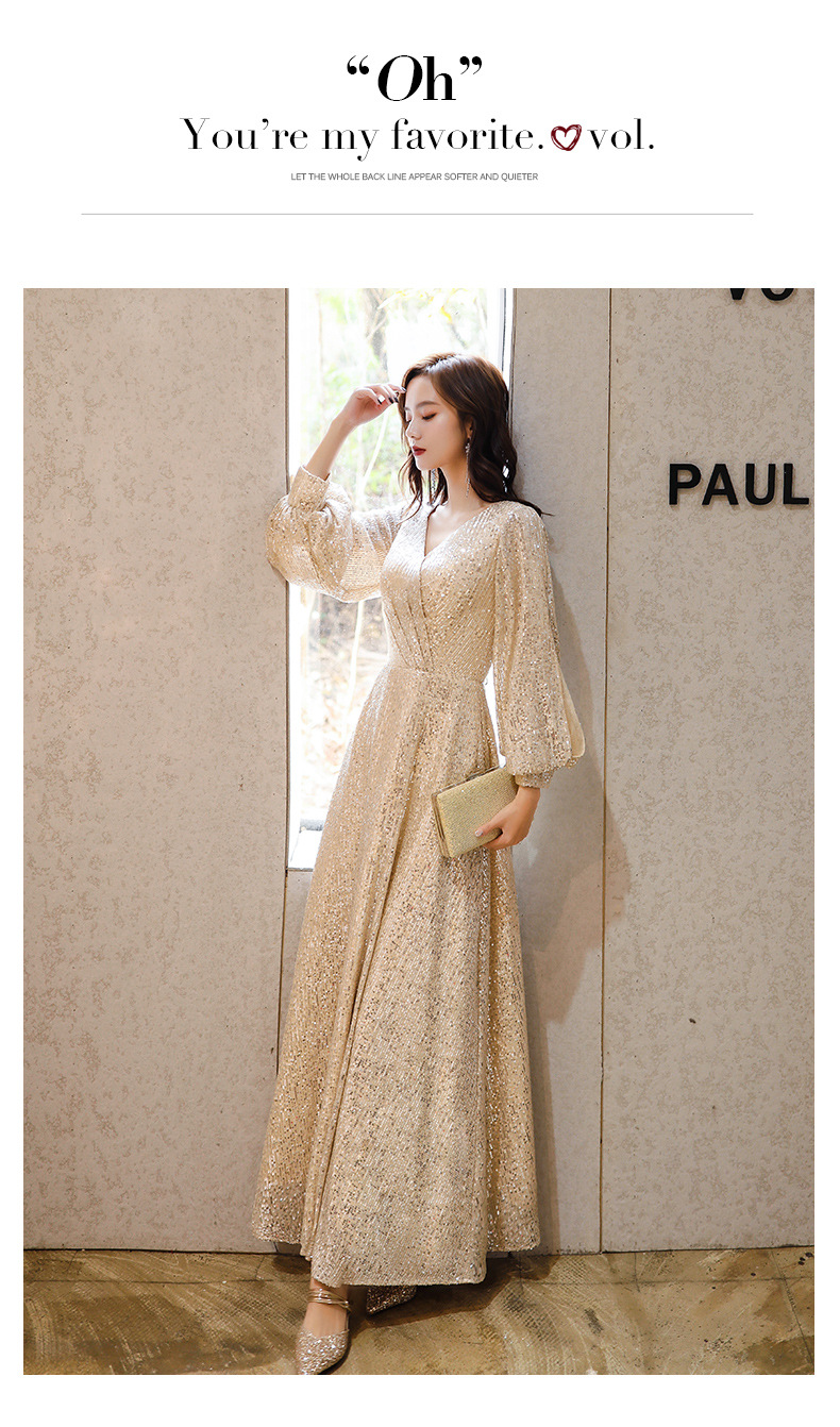Gaun malam pesta tahunan warna champagne berpayet, kerah V, lengan panjang, model baru musim dingin 2026, pasokan pabrik.