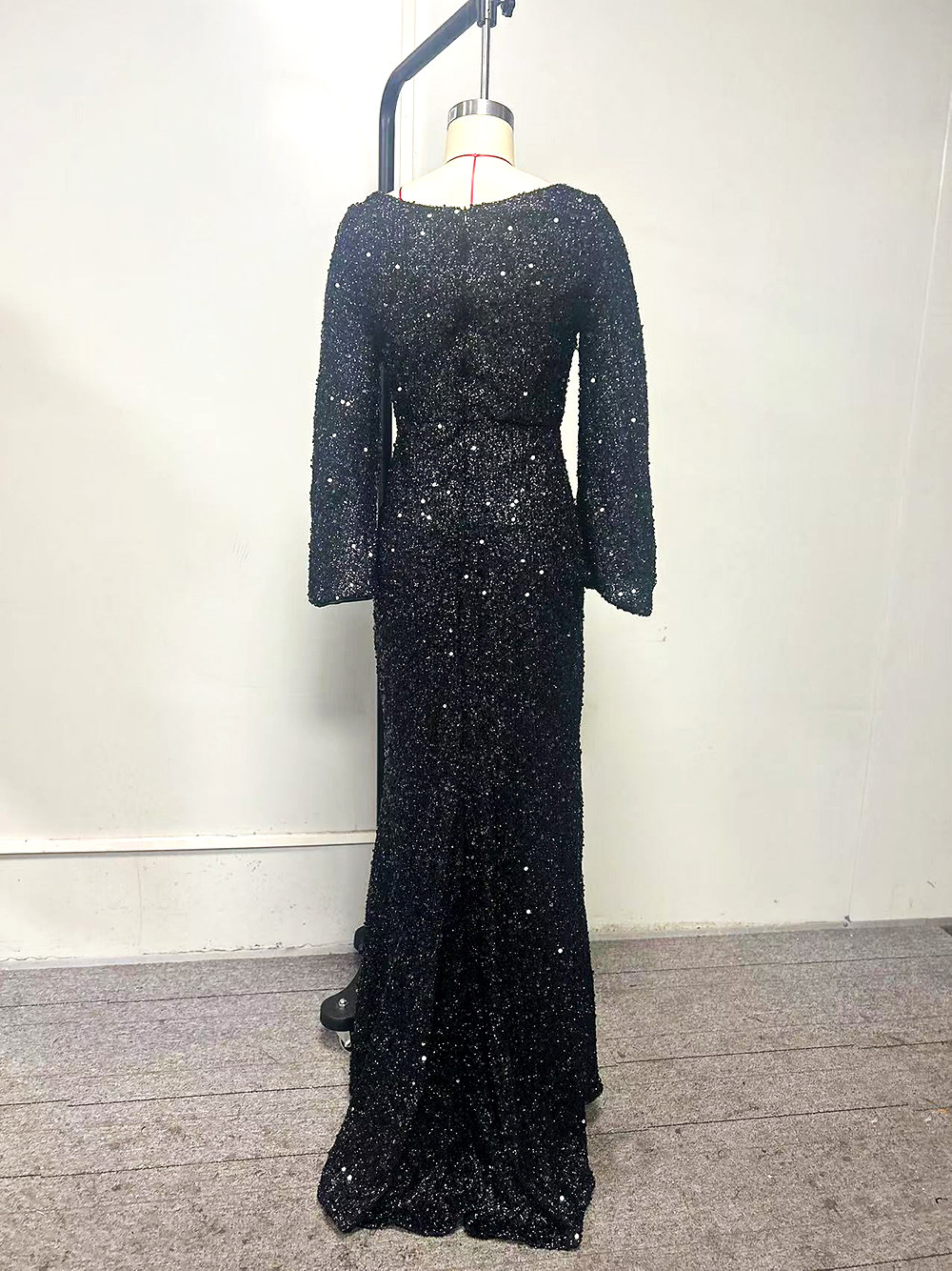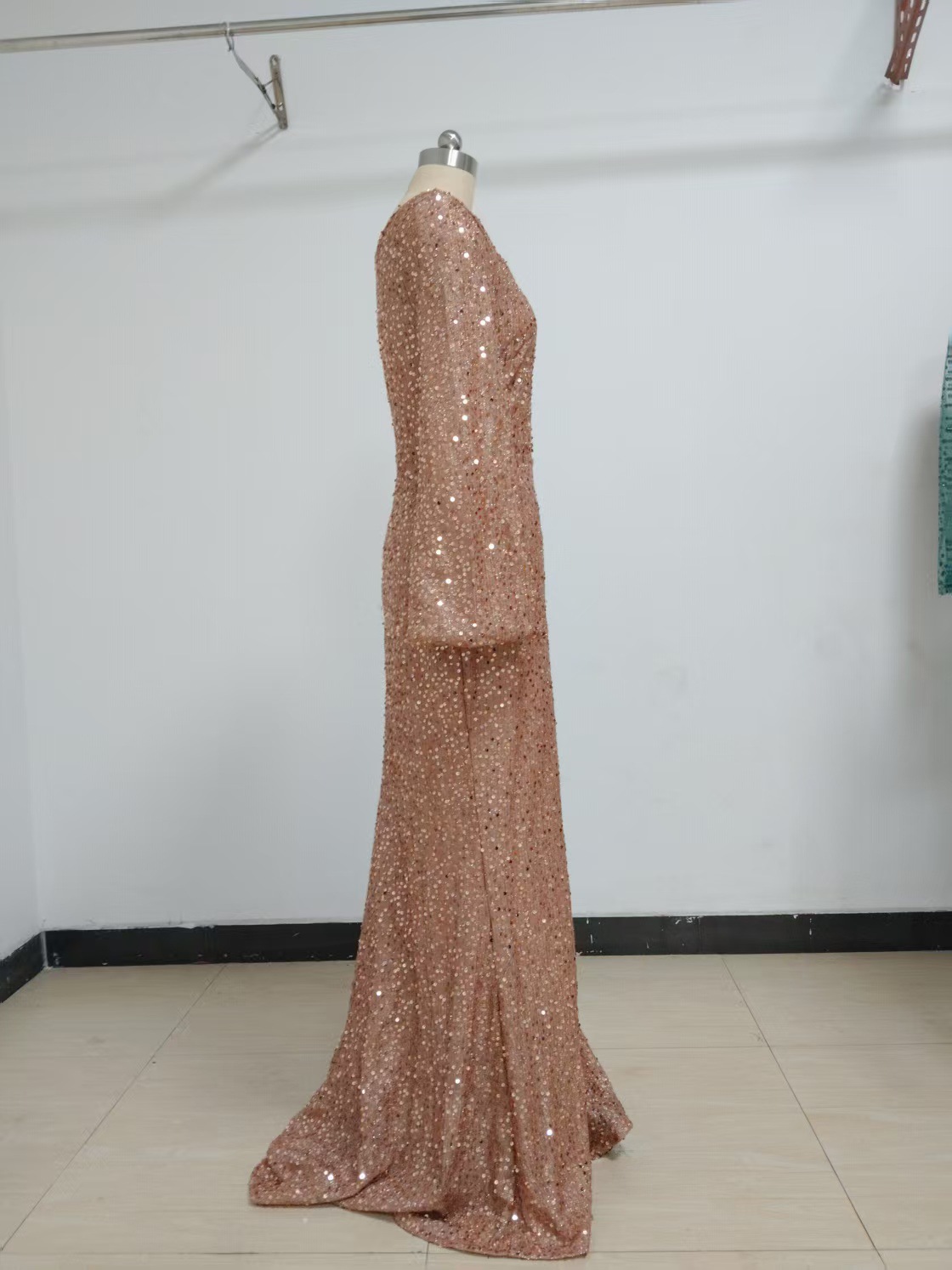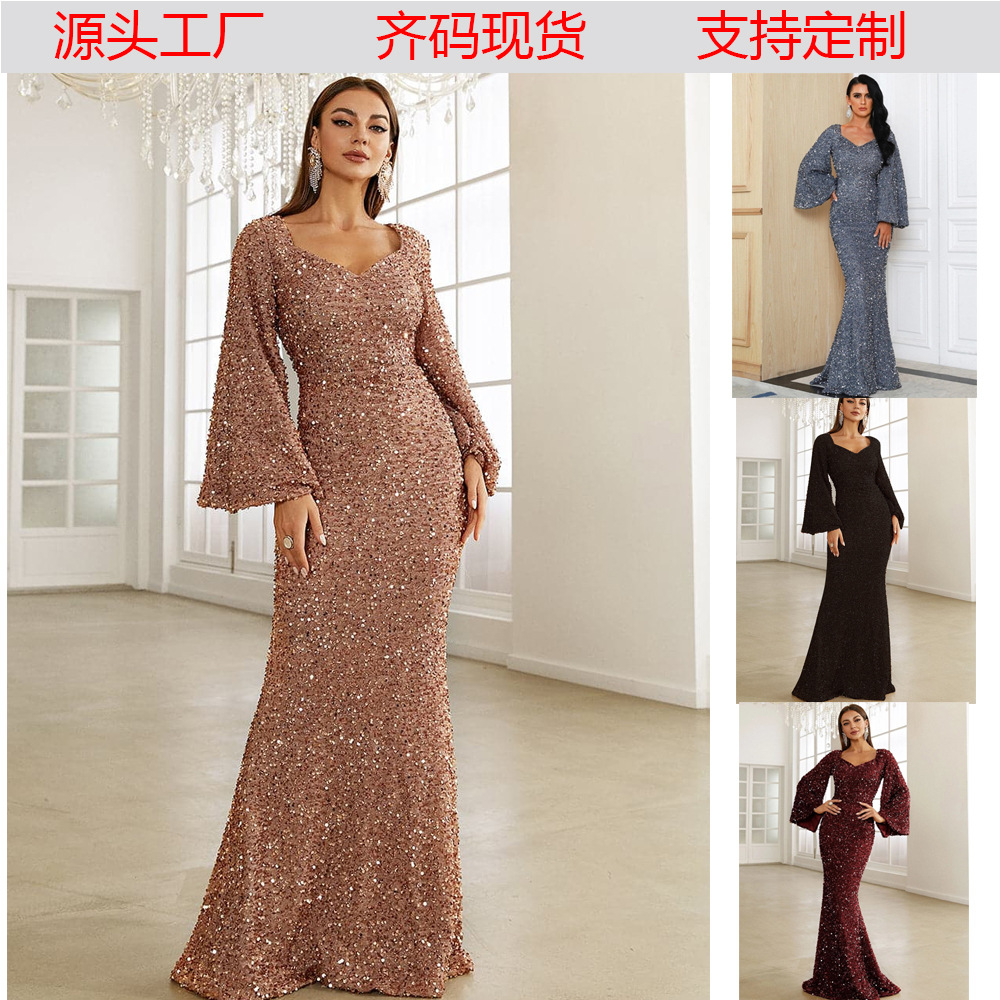 Gaun malam panjang model bodycon berpayet, kerah V, lengan melebar, potongan pinggang sedang, gaya Eropa dan Amerika, tren terbaru lintas batas tahun 2026.