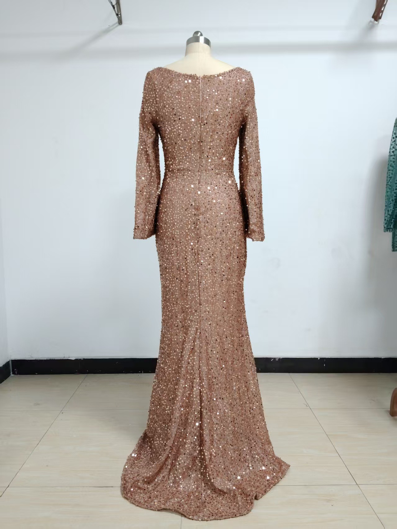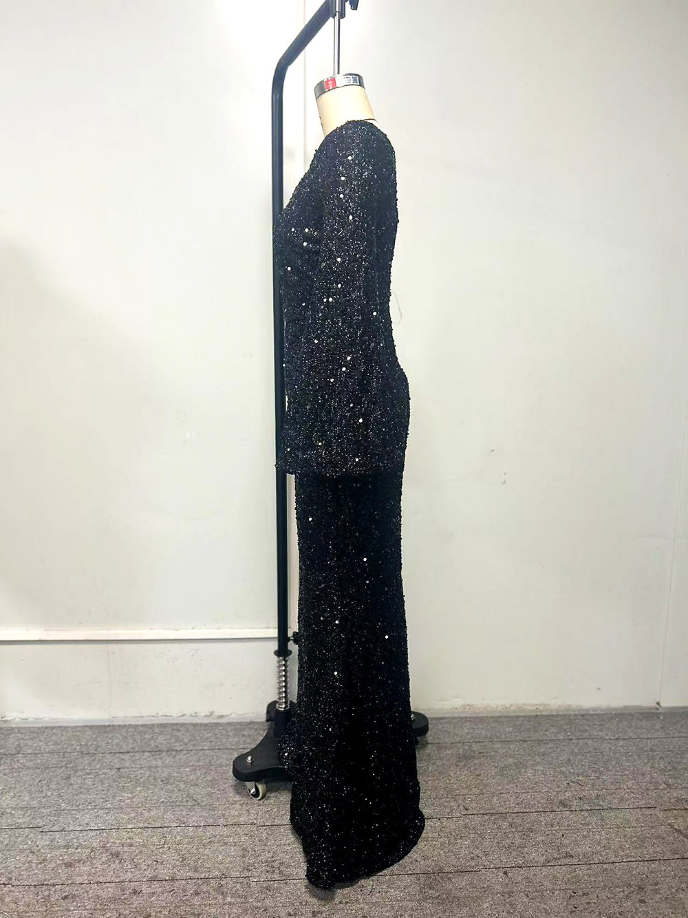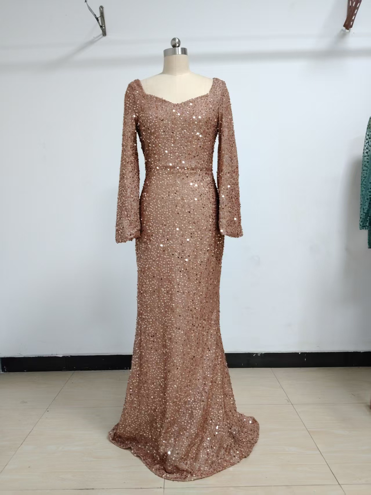 Gaun malam panjang model bodycon berpayet, kerah V, lengan melebar, potongan pinggang sedang, gaya Eropa dan Amerika, tren terbaru lintas batas tahun 2026.