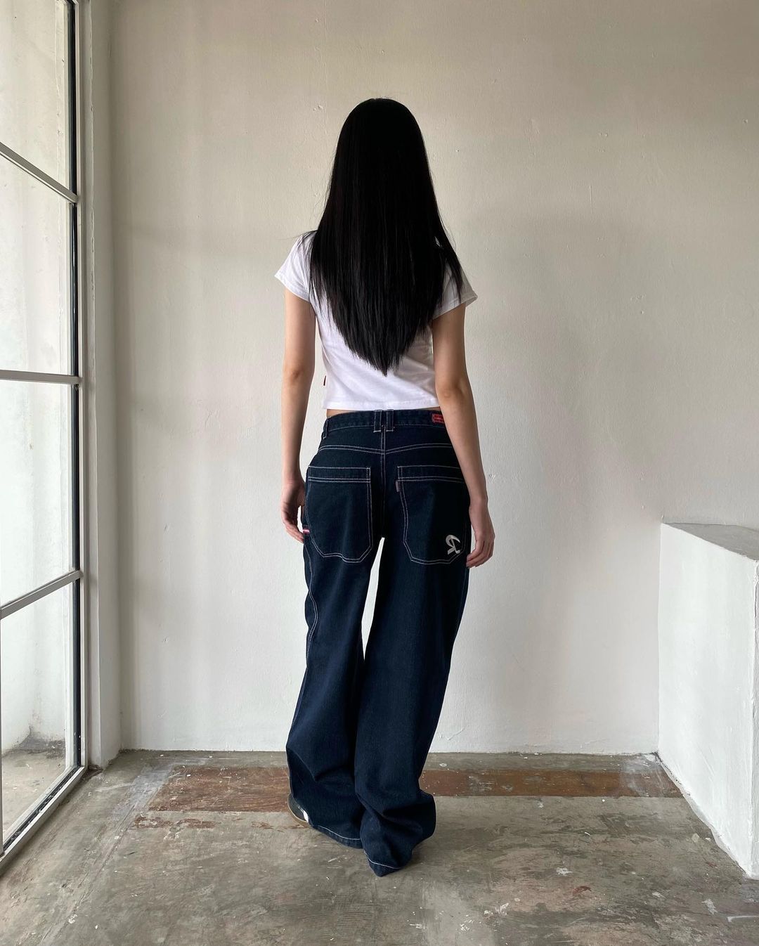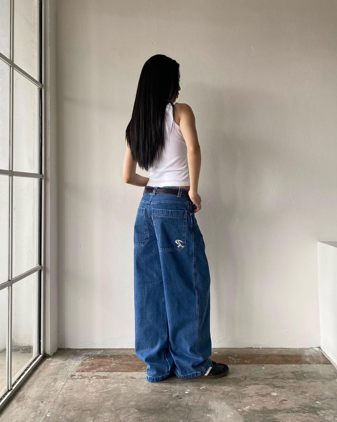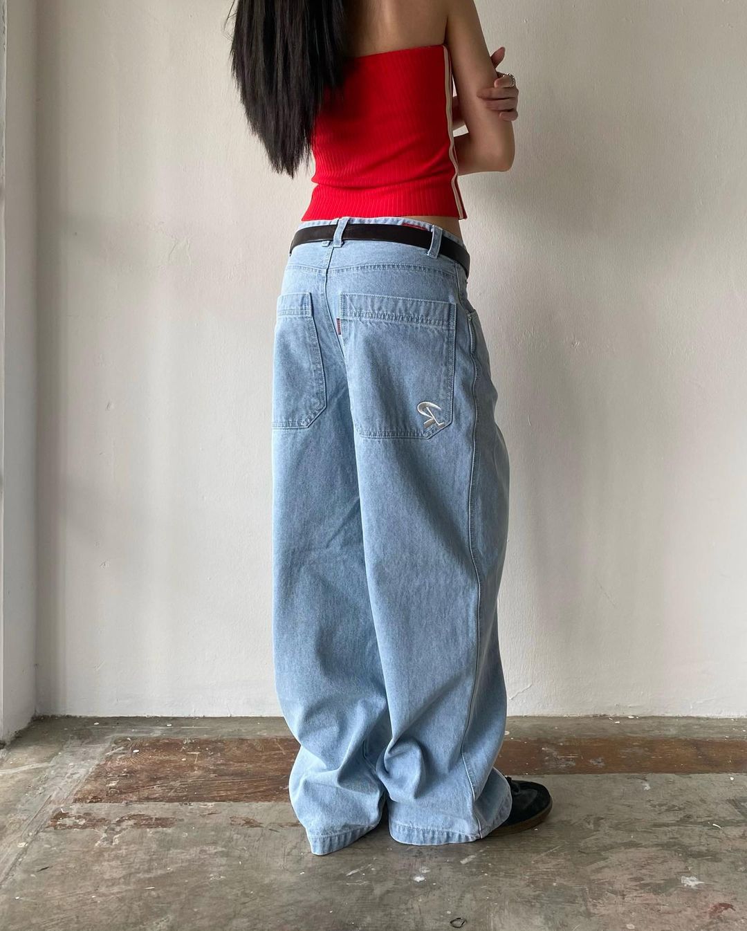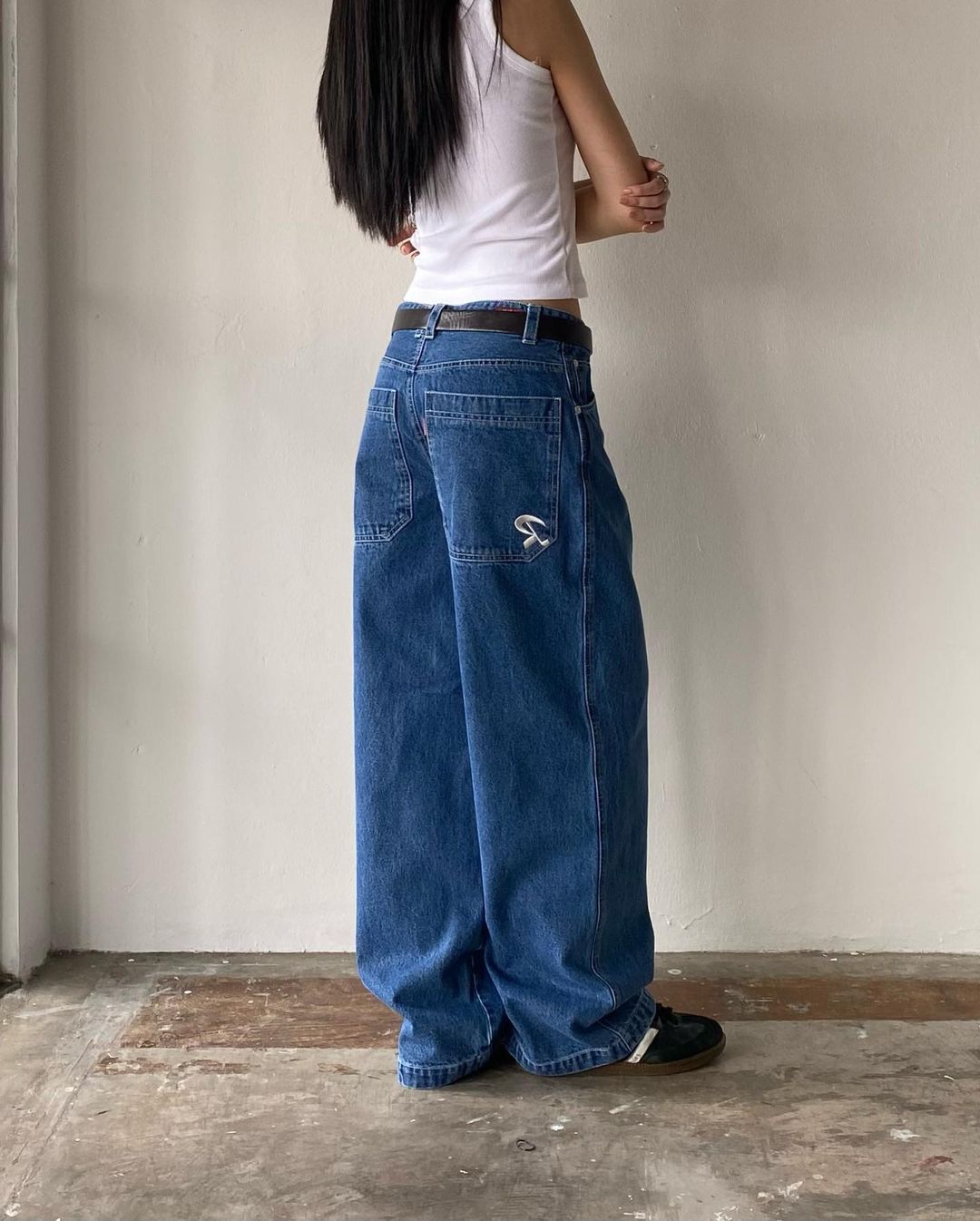 Celana panjang Denim kasual jalanan Amerika kaus kaki lebar ramping longgar Semua cocok berbordir wanita populer modis