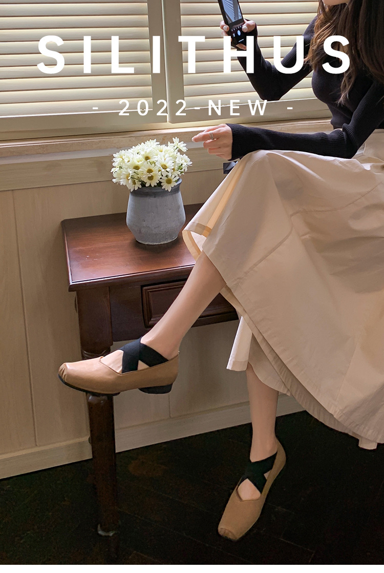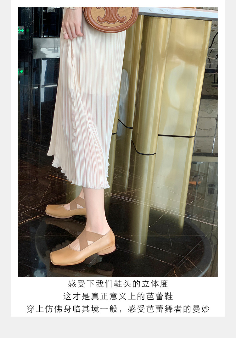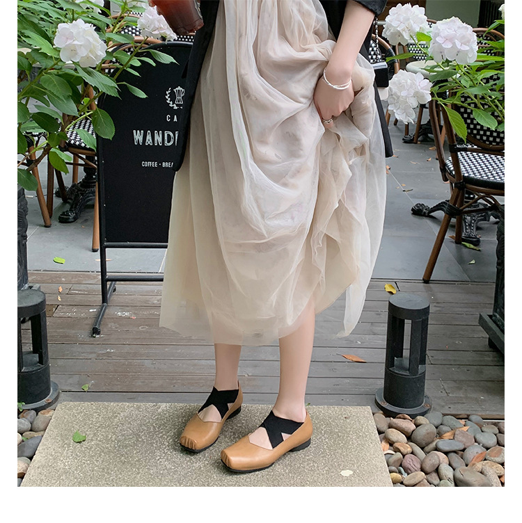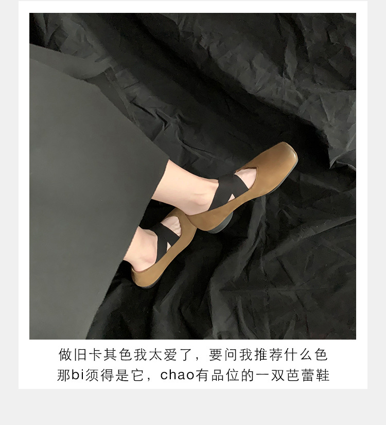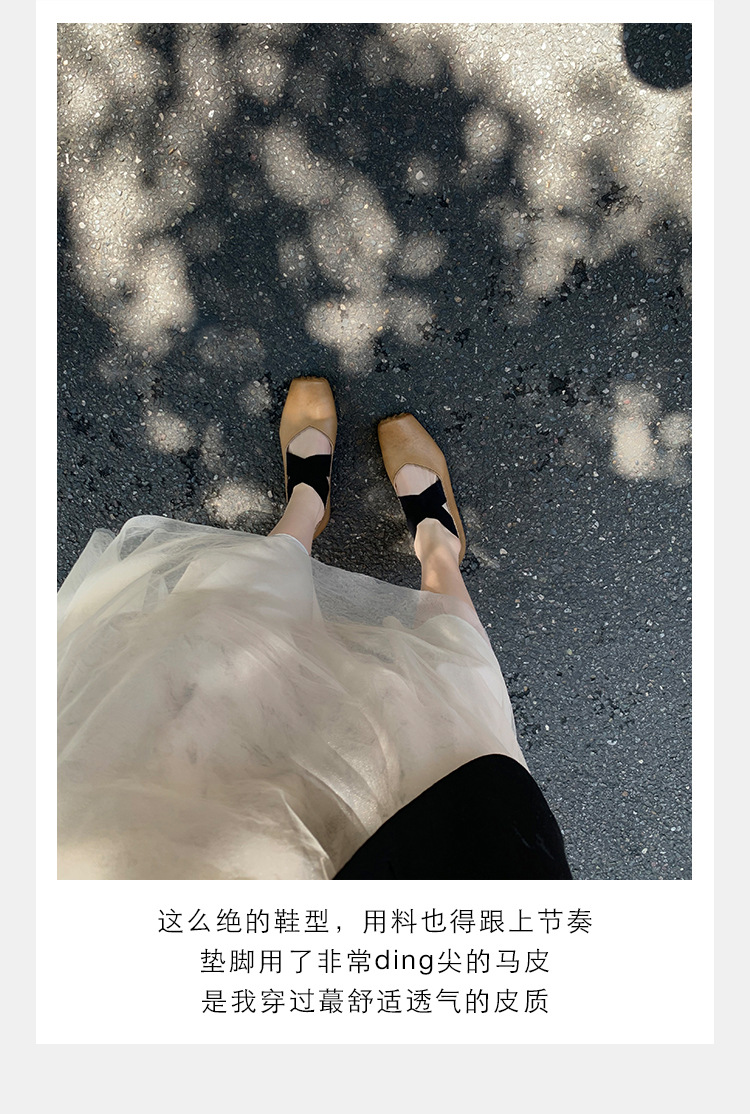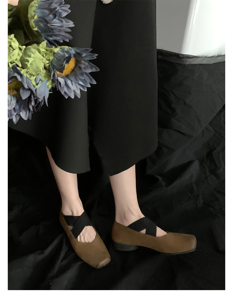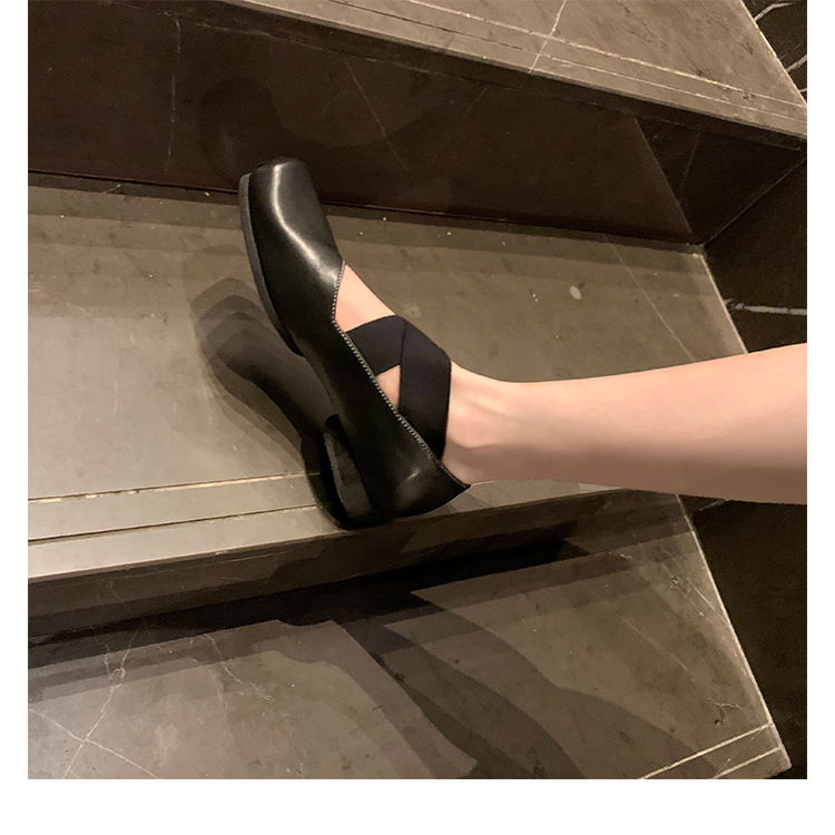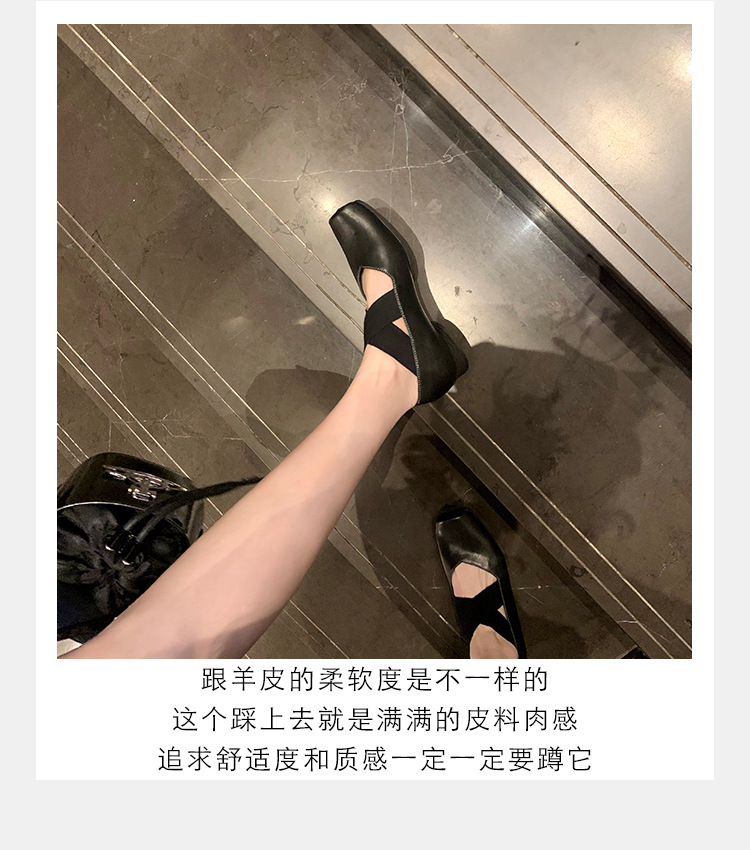 Sepatu lapisan tunggal sepatu balet wanita kulit asli ujung persegi retro Prancis tali silang mulut dangkal sepatu hidung babi sol lembut sepatu Mary Jane
