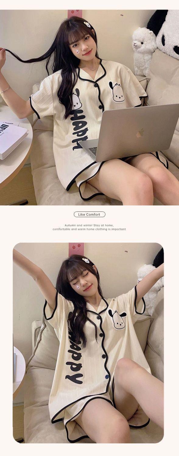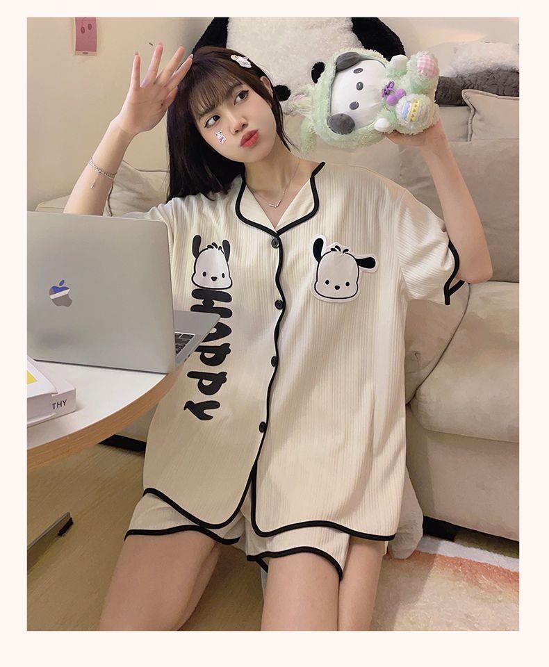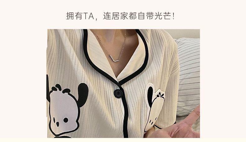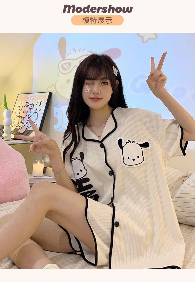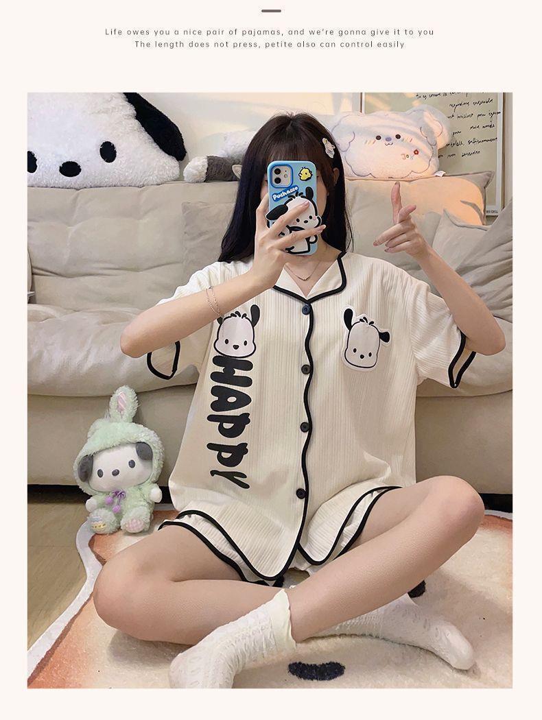 Piyama wanita lengan pendek, pakaian rumah kardigan celana pendek lengan pendek tipis imut musim panas dua potong kartun manis