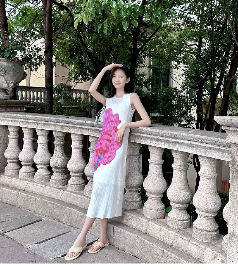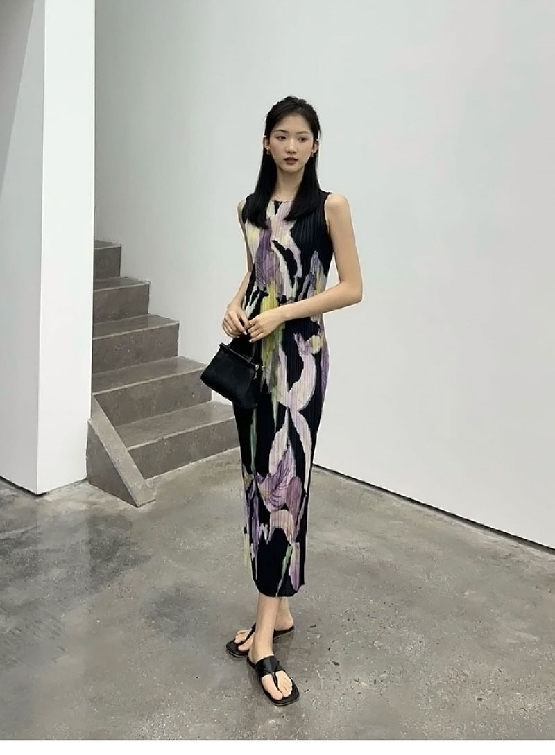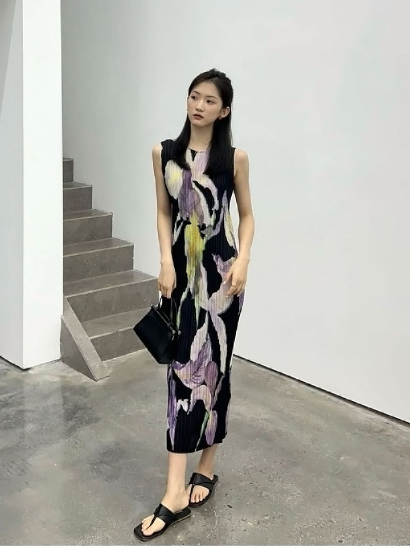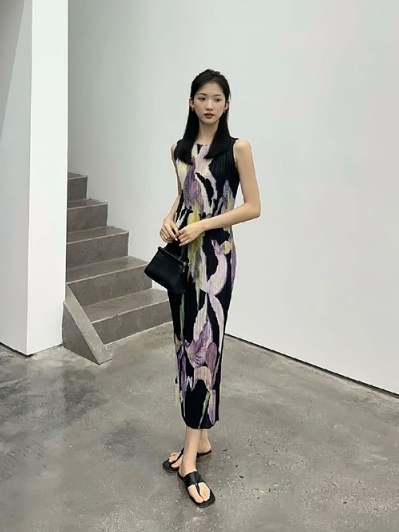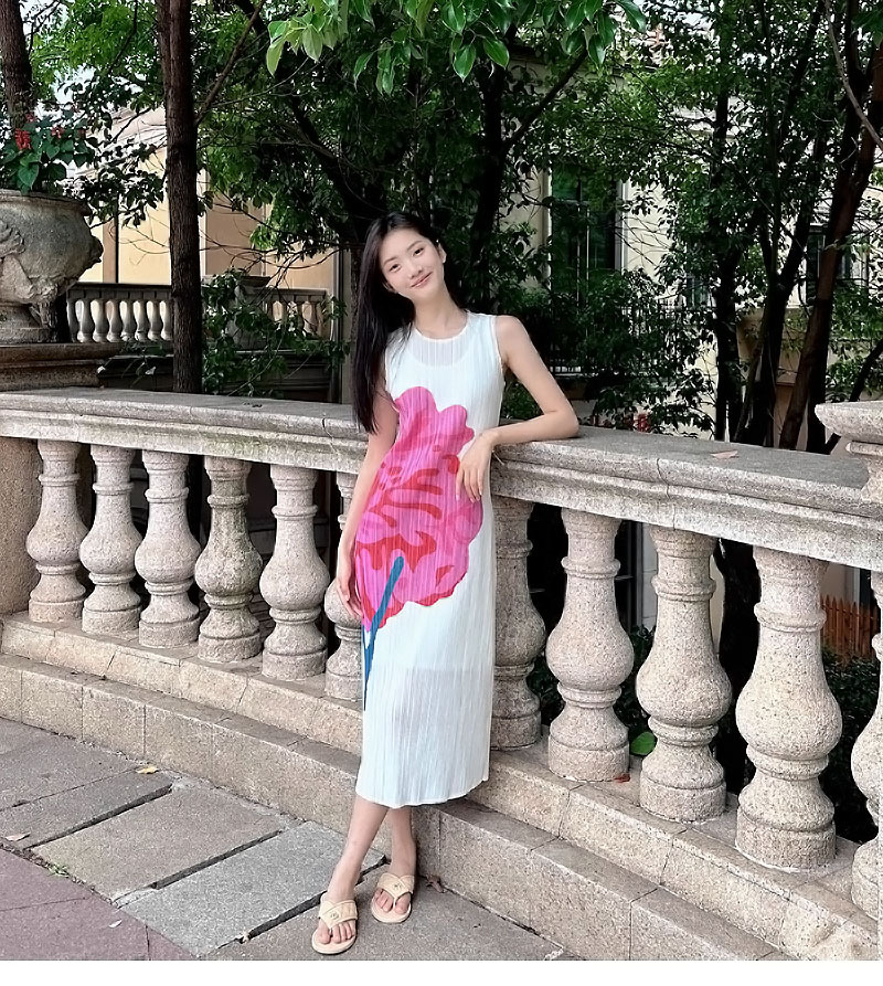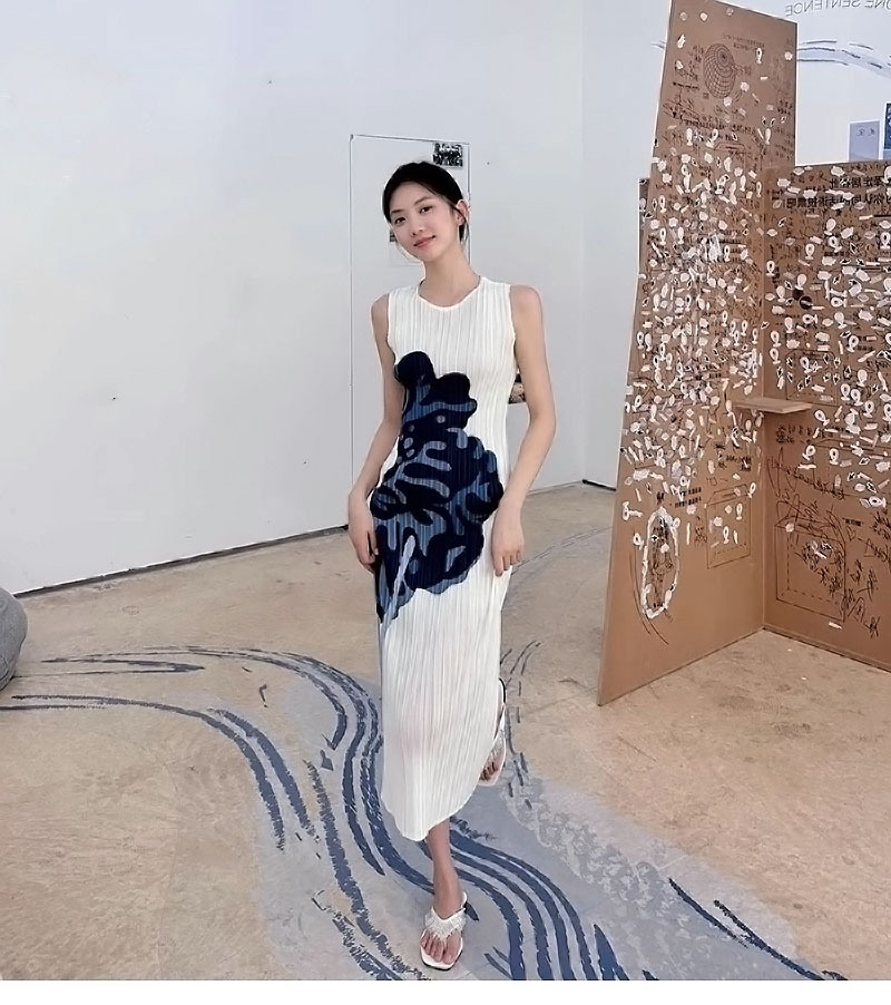 Gaun Sanzhai motif gaun elegan untuk wanita, Rok lipit tanpa lengan leher bulat elegan pelangsing longgar kelas tinggi elegan motif cetak