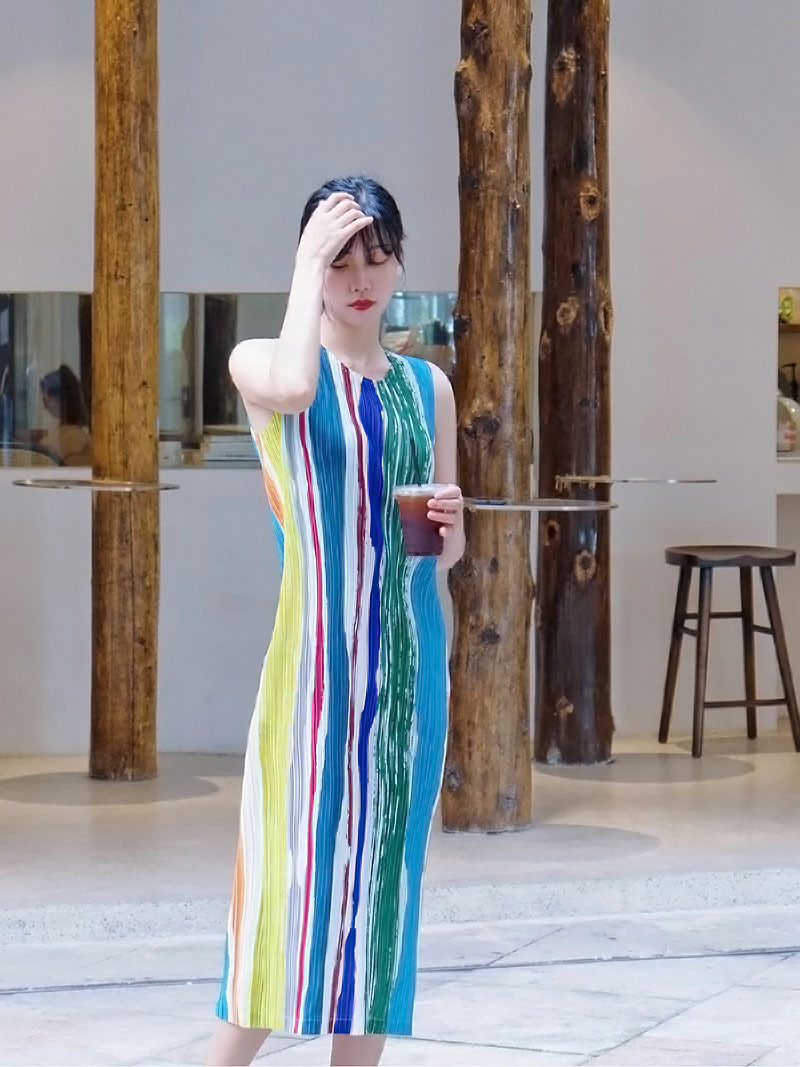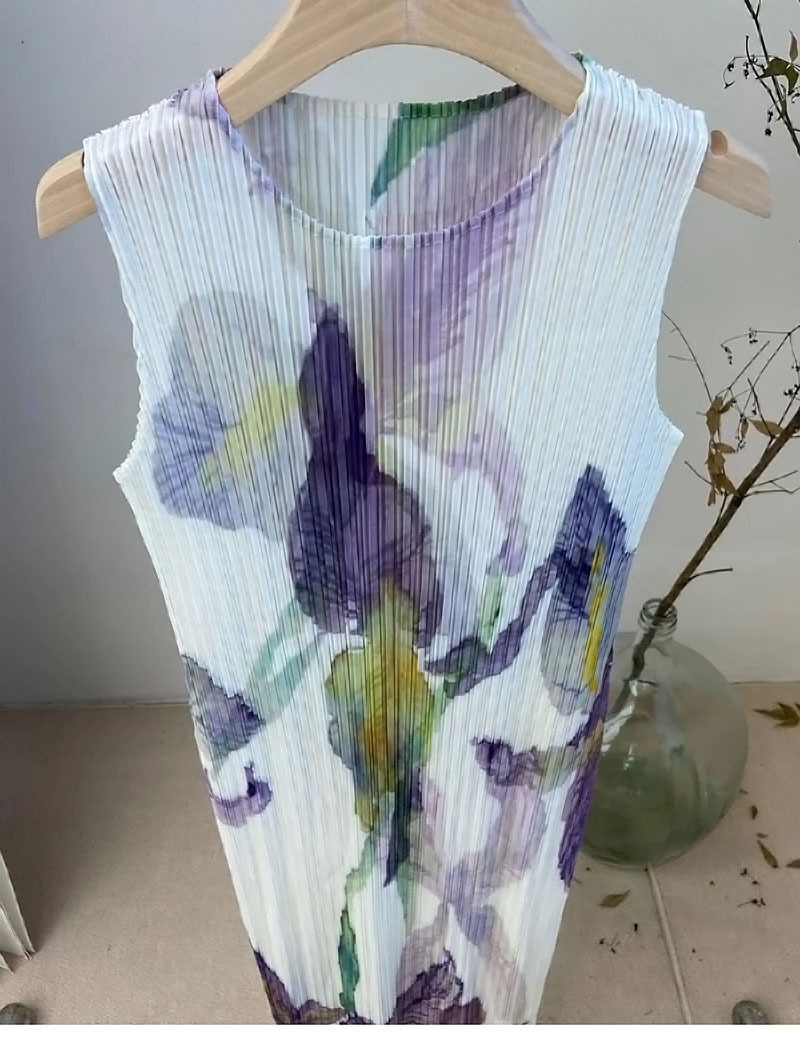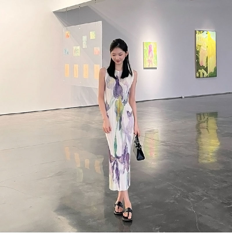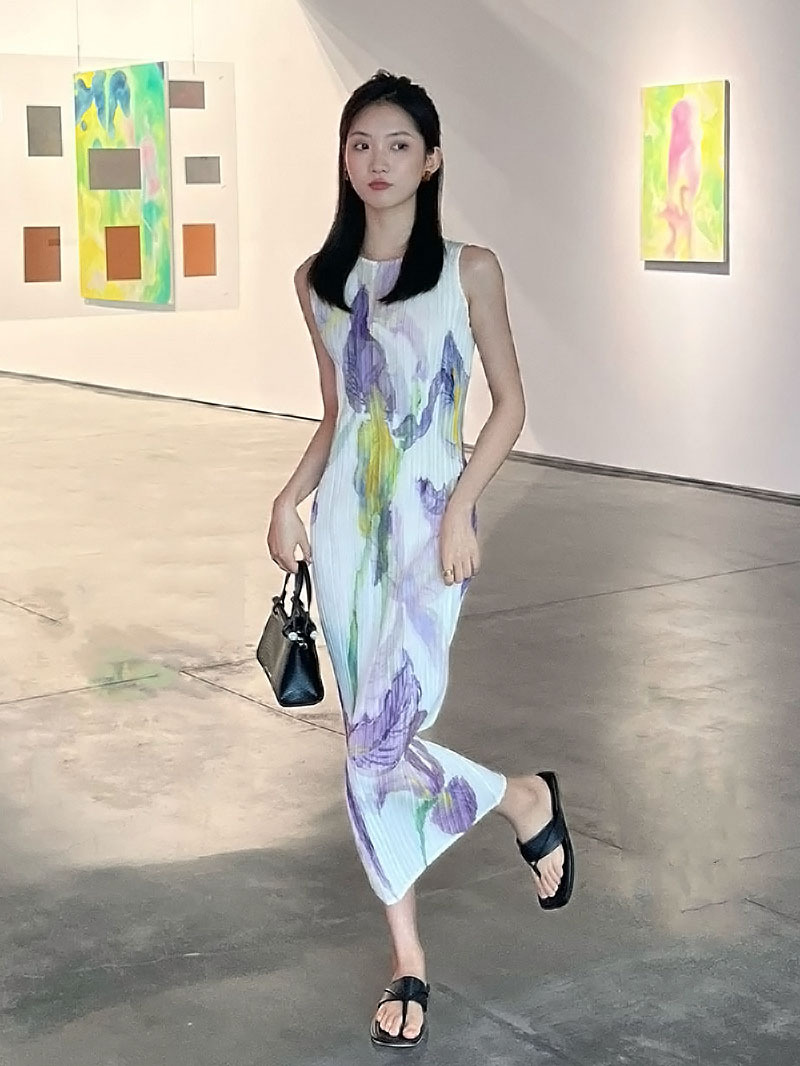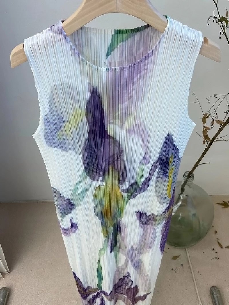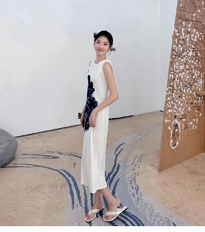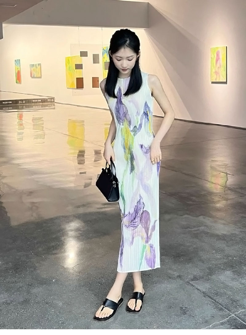 Gaun Sanzhai motif gaun elegan untuk wanita, Rok lipit tanpa lengan leher bulat elegan pelangsing longgar kelas tinggi elegan motif cetak