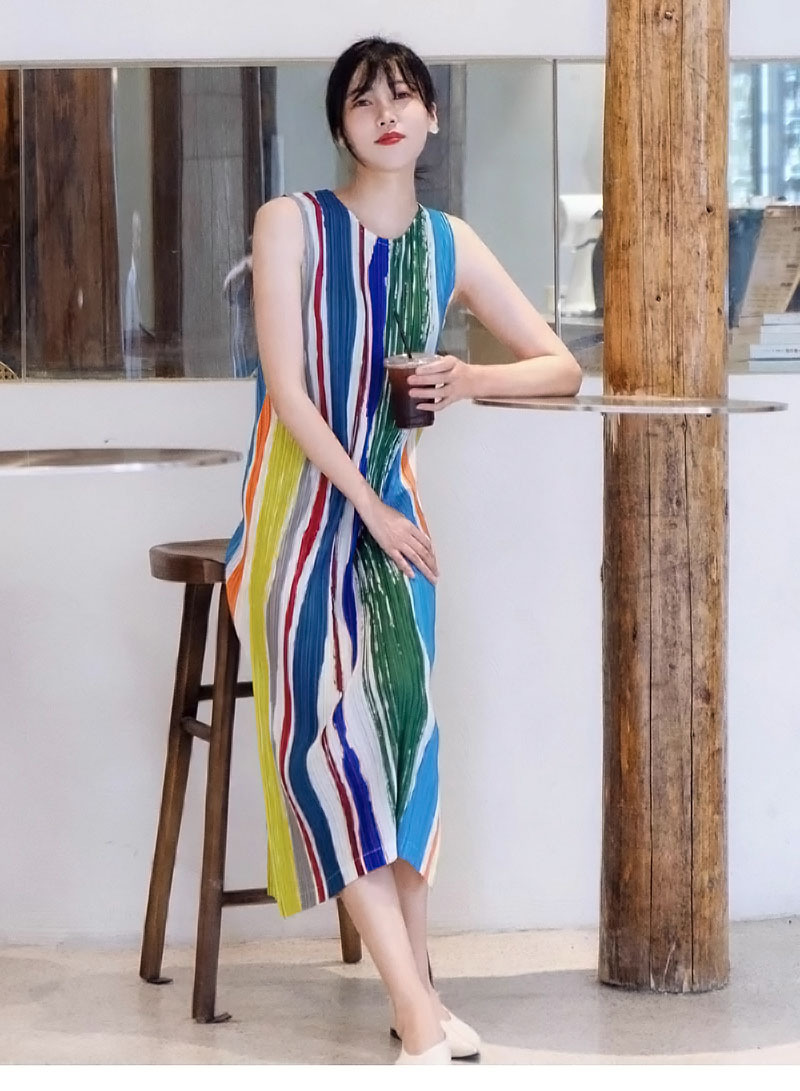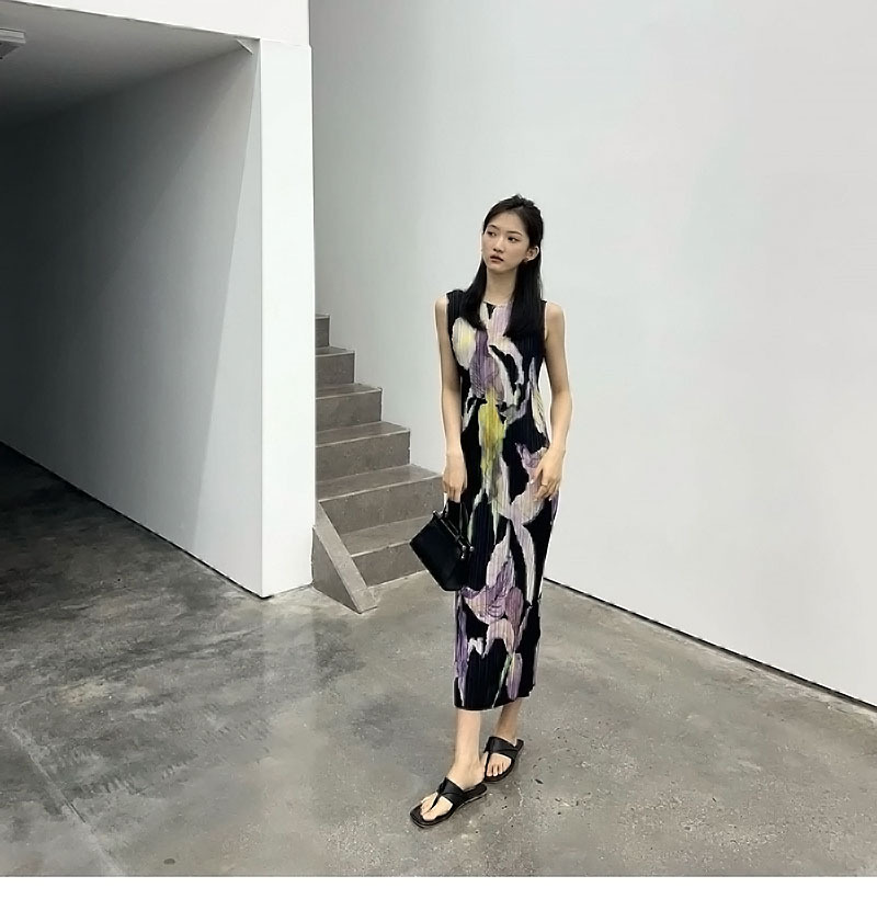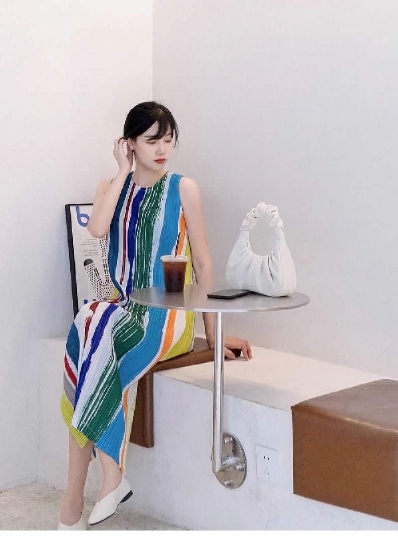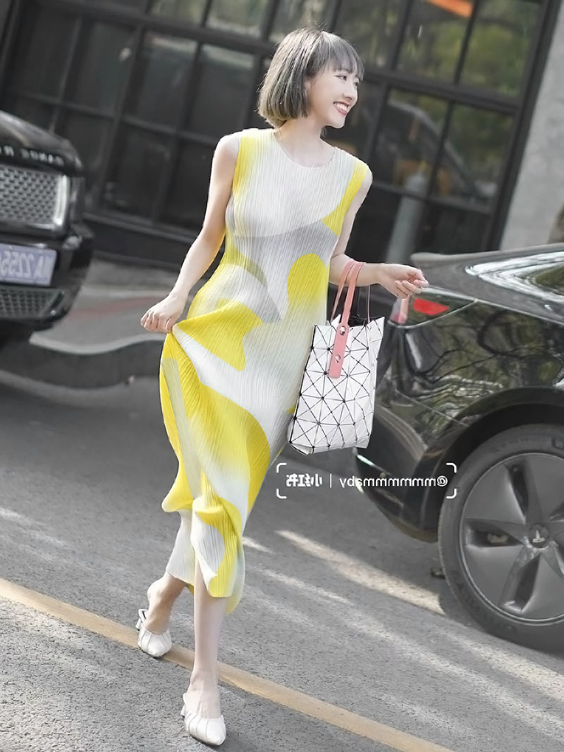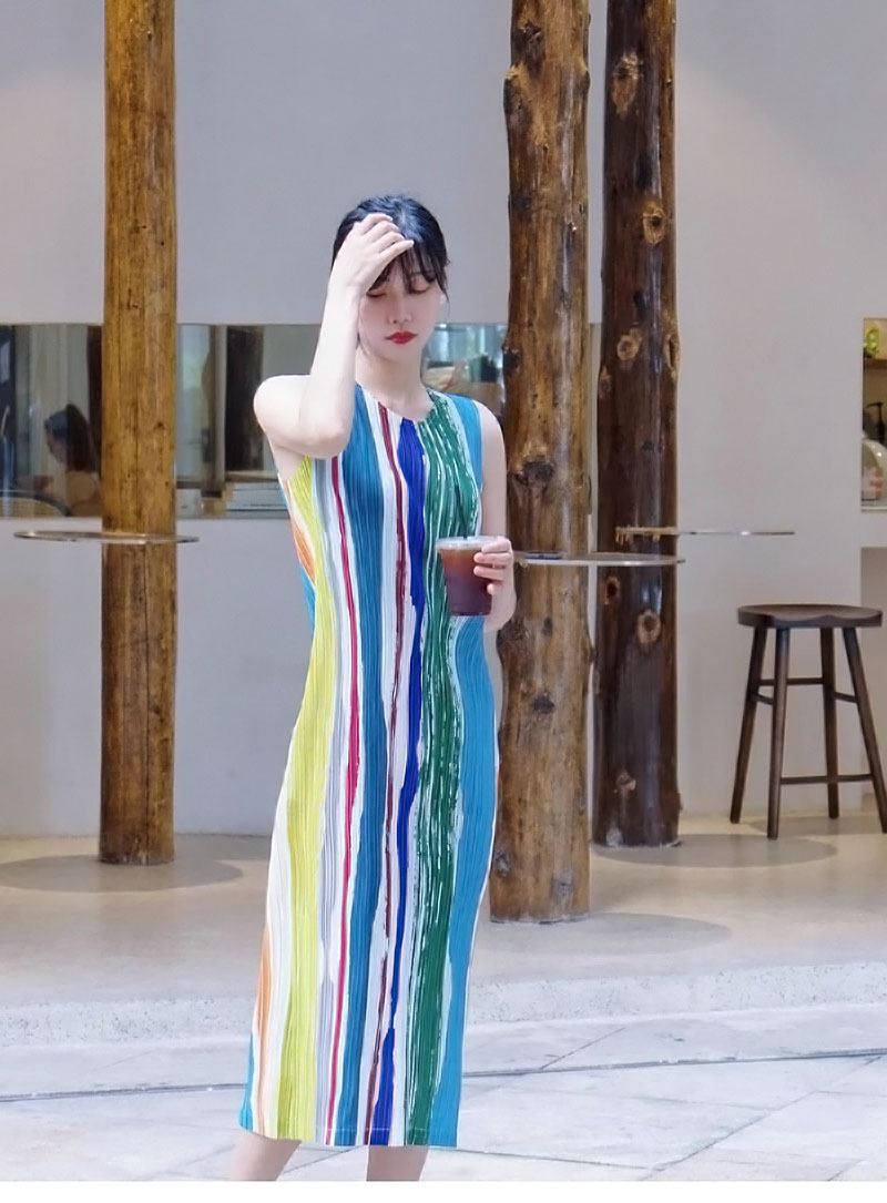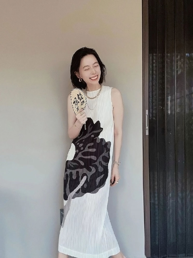 Gaun Sanzhai motif gaun elegan untuk wanita, Rok lipit tanpa lengan leher bulat elegan pelangsing longgar kelas tinggi elegan motif cetak