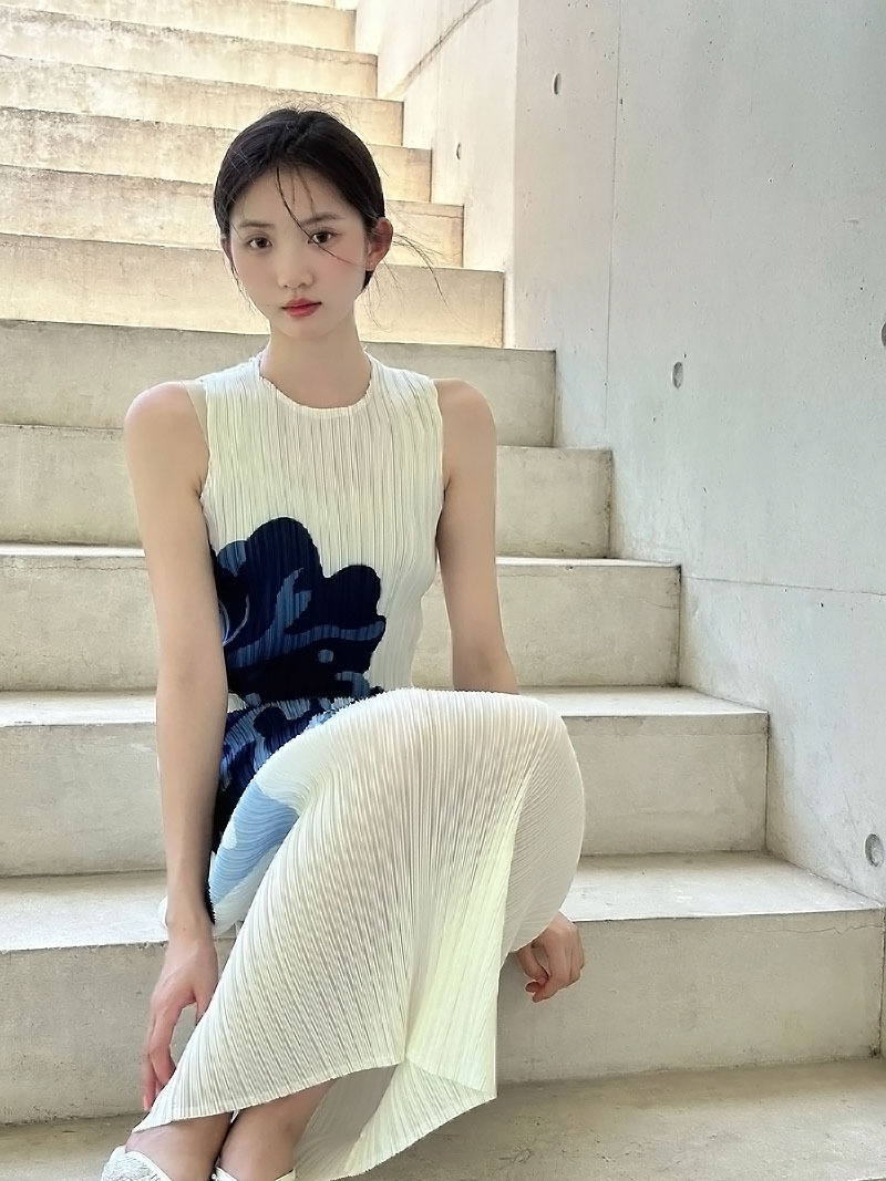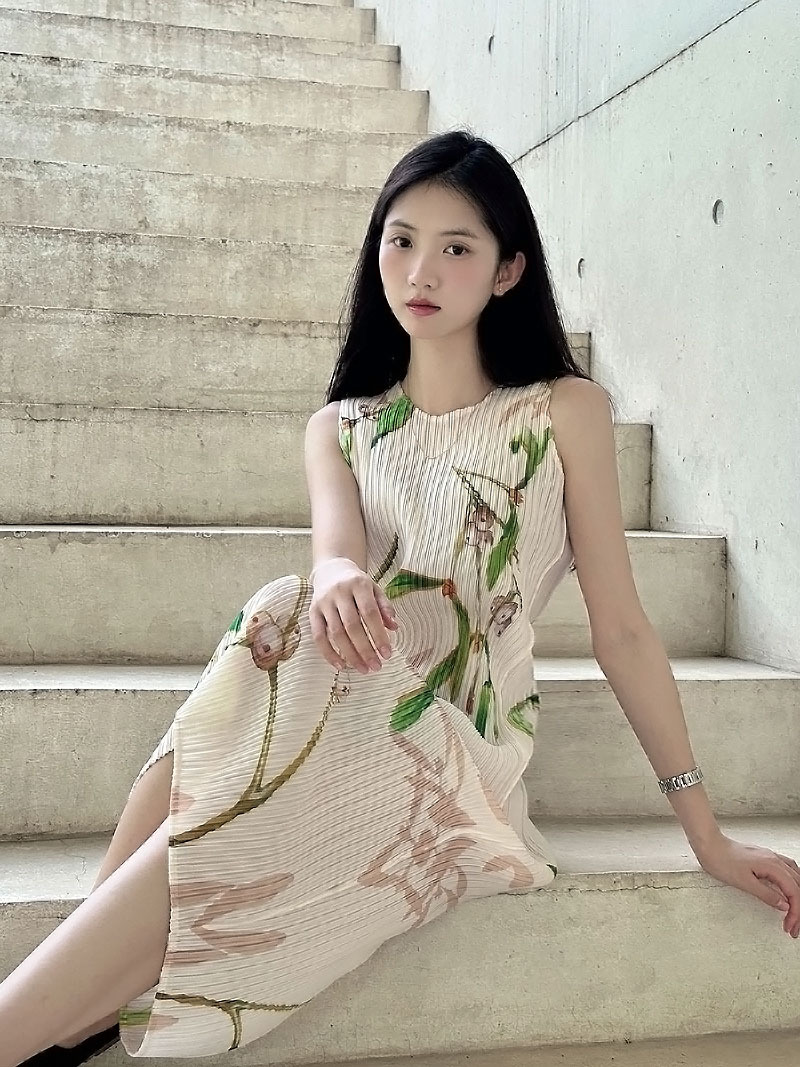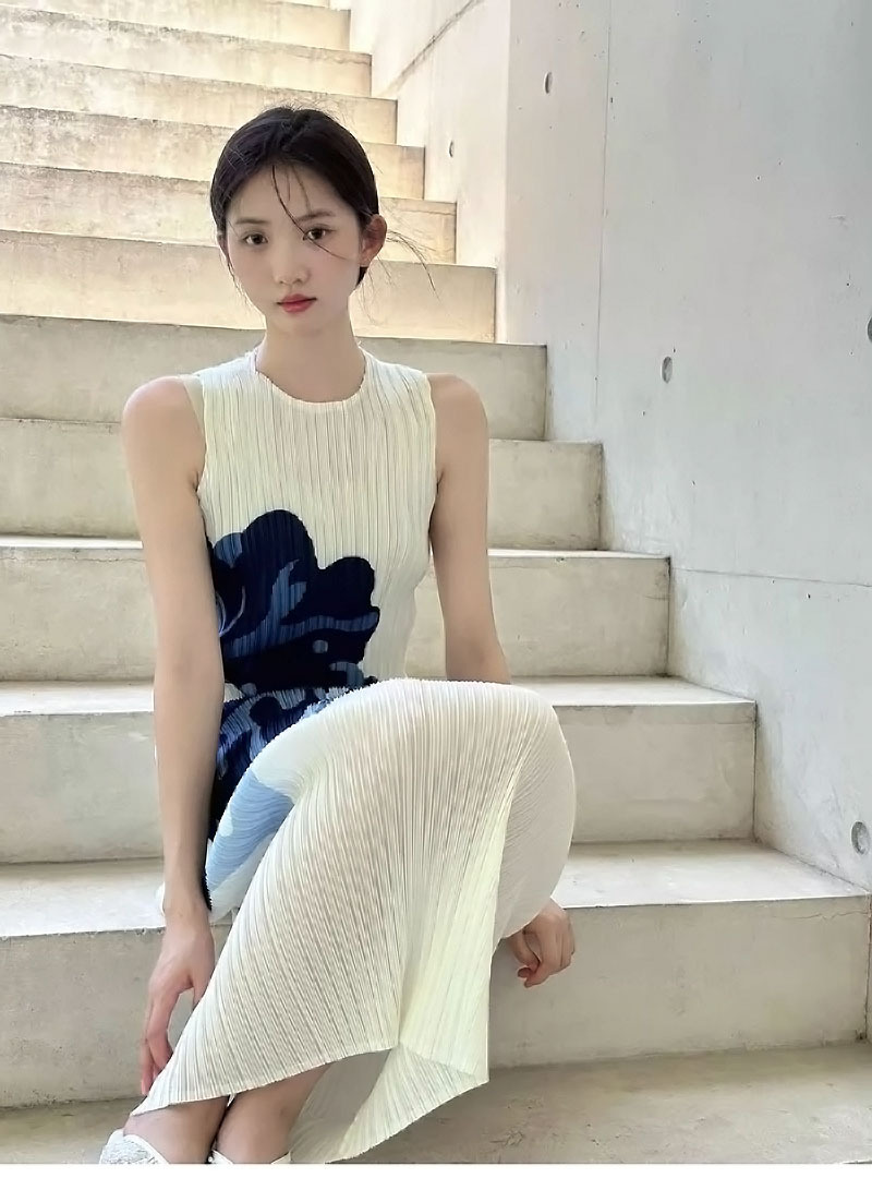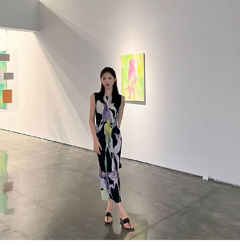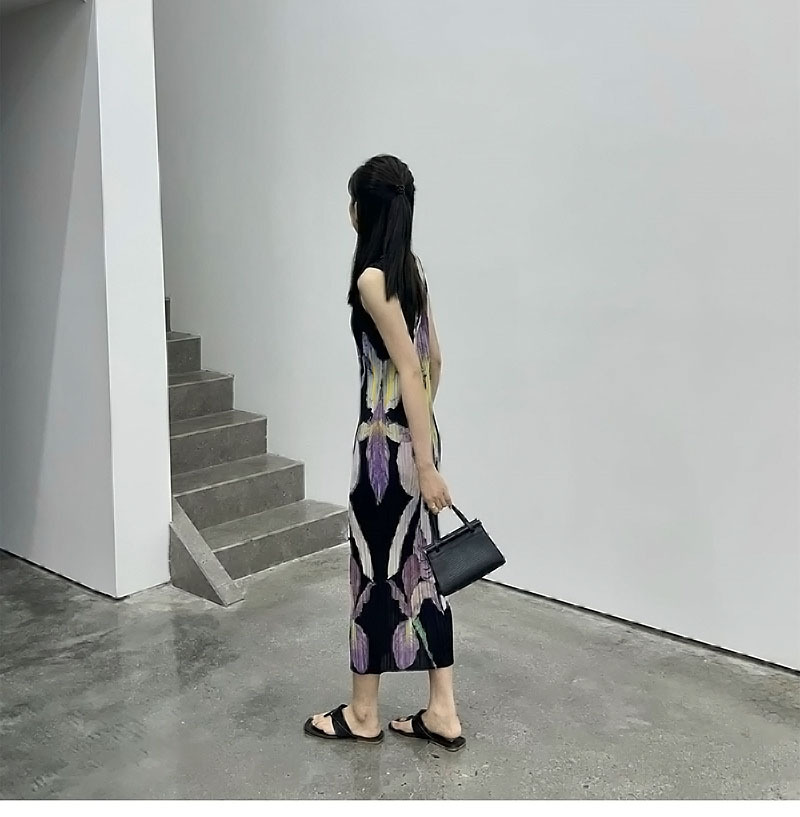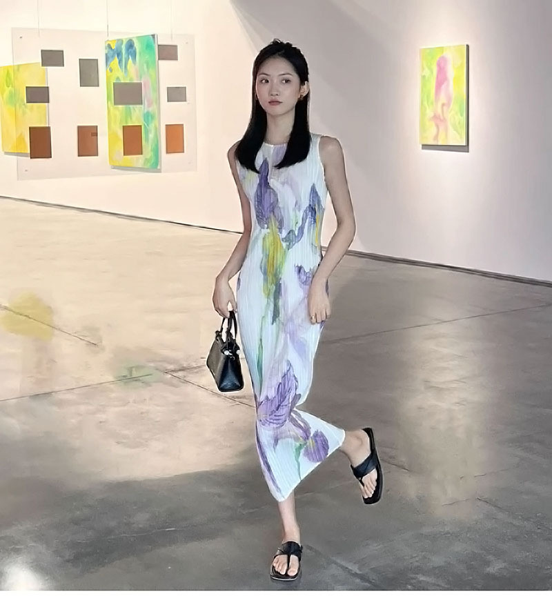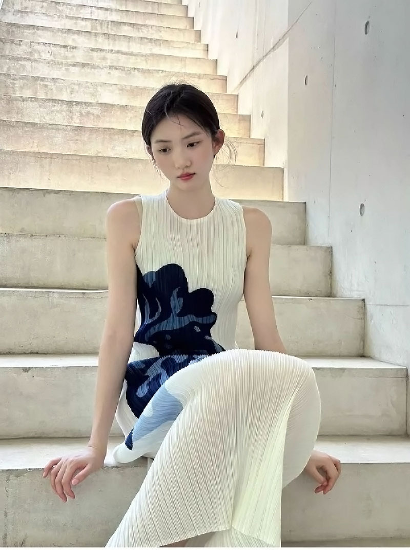 Gaun Sanzhai motif gaun elegan untuk wanita, Rok lipit tanpa lengan leher bulat elegan pelangsing longgar kelas tinggi elegan motif cetak