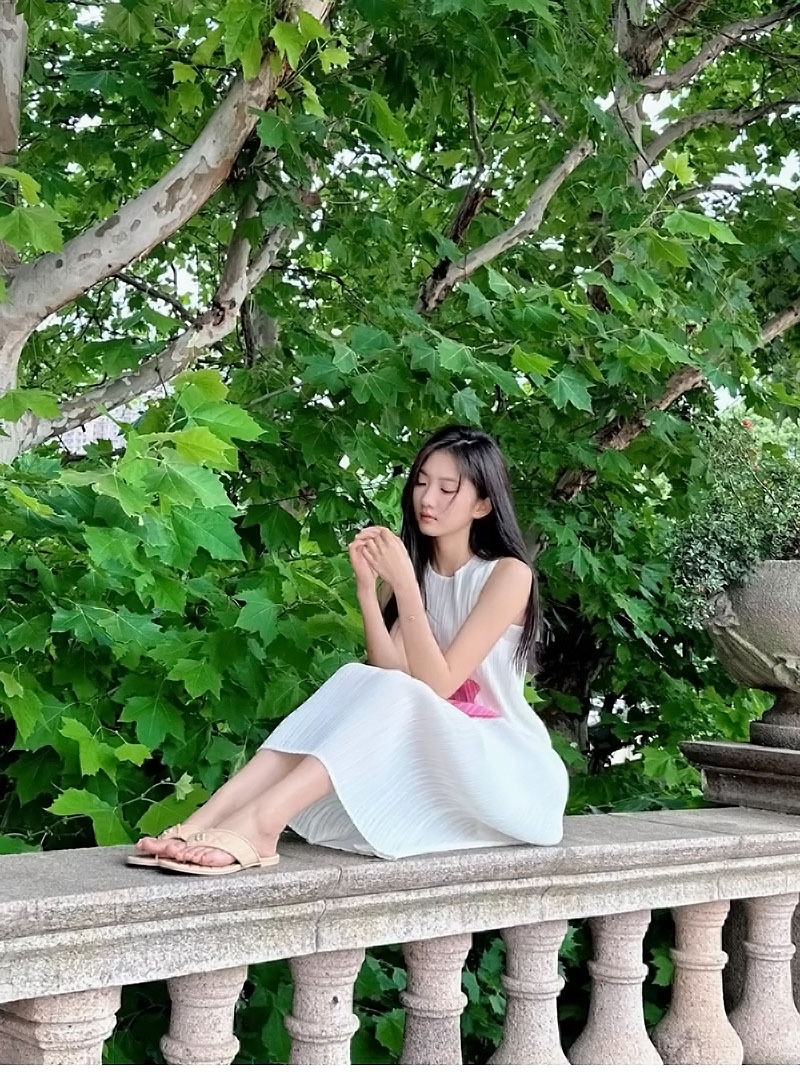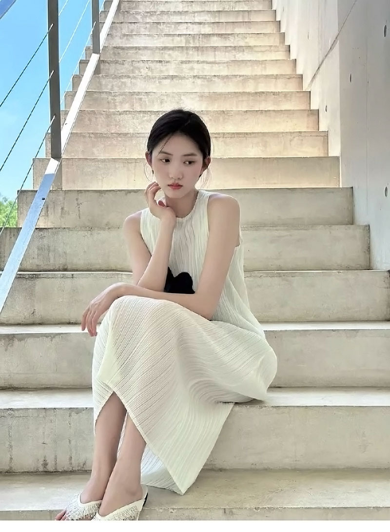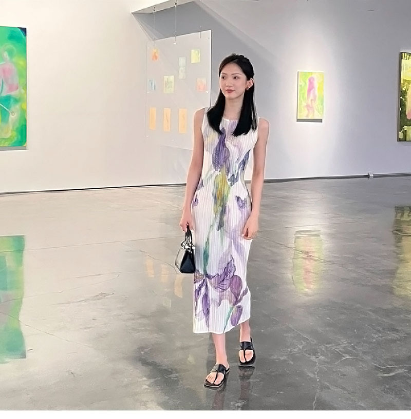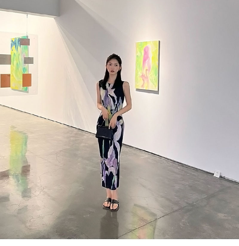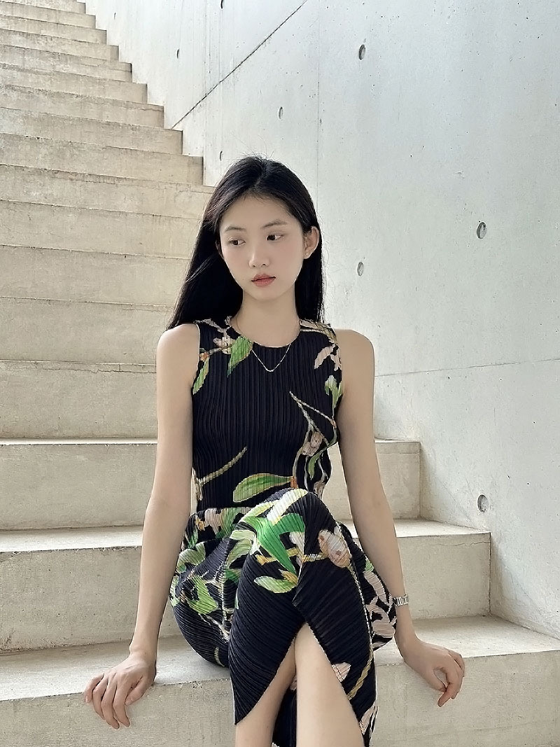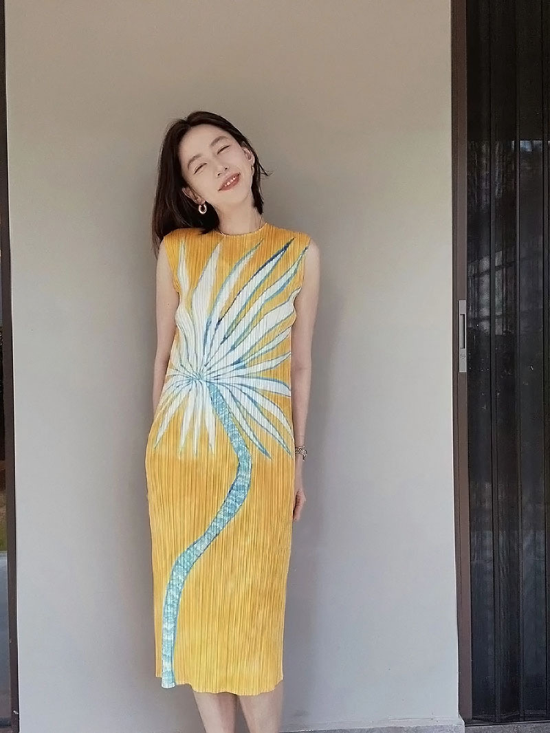 Gaun Sanzhai motif gaun elegan untuk wanita, Rok lipit tanpa lengan leher bulat elegan pelangsing longgar kelas tinggi elegan motif cetak