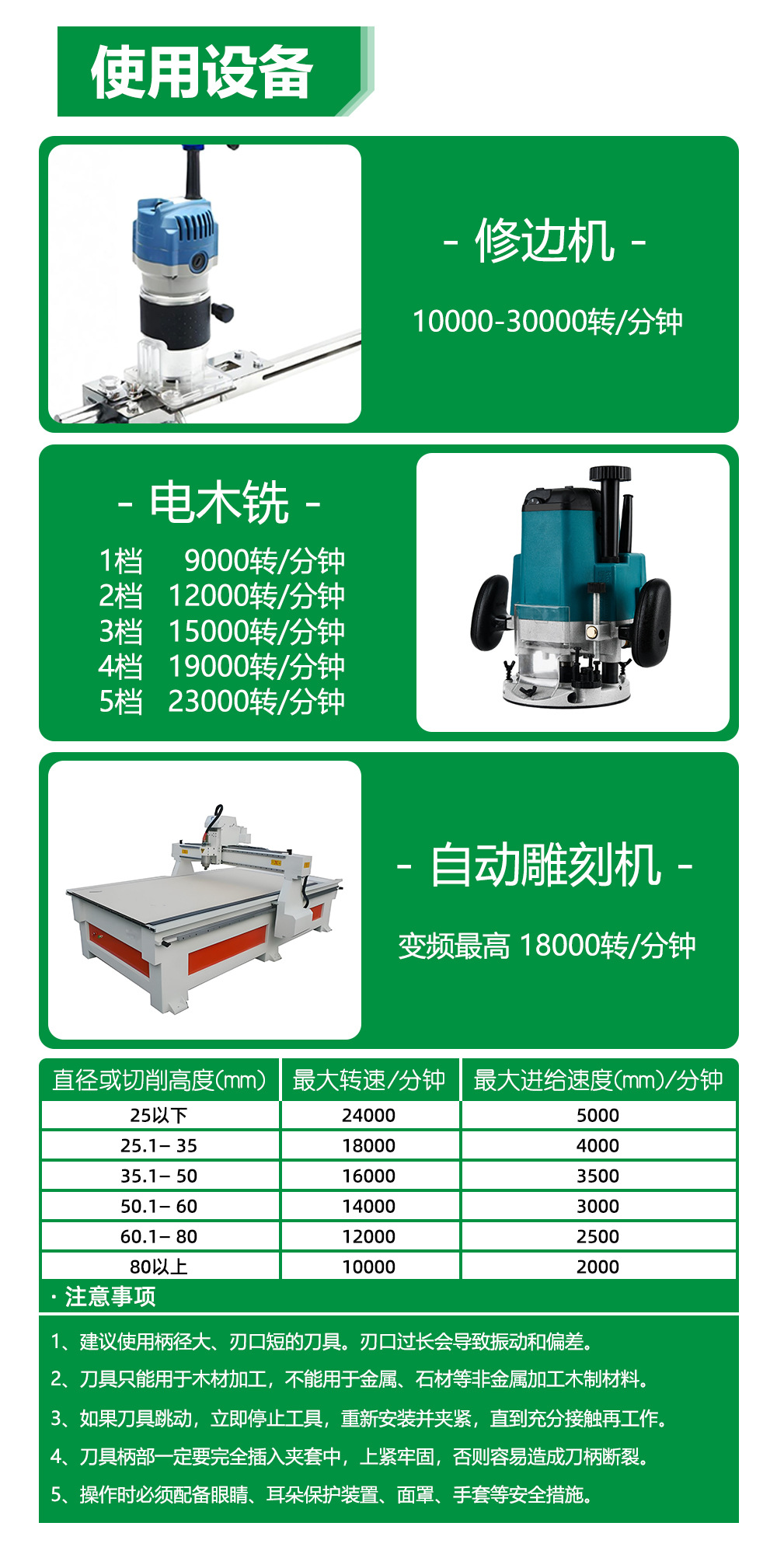 木工铣刀柄部分有:3mm, 6mm, 1/4"(6.35mm), 8mm, 12mm, 1/2"(12.7mm)