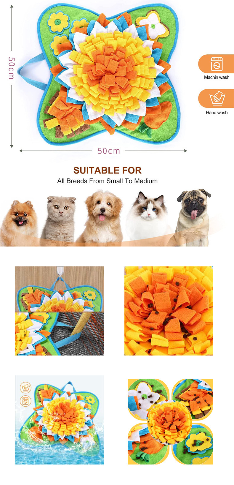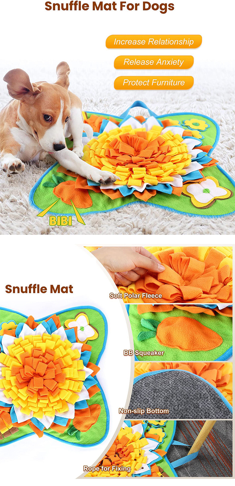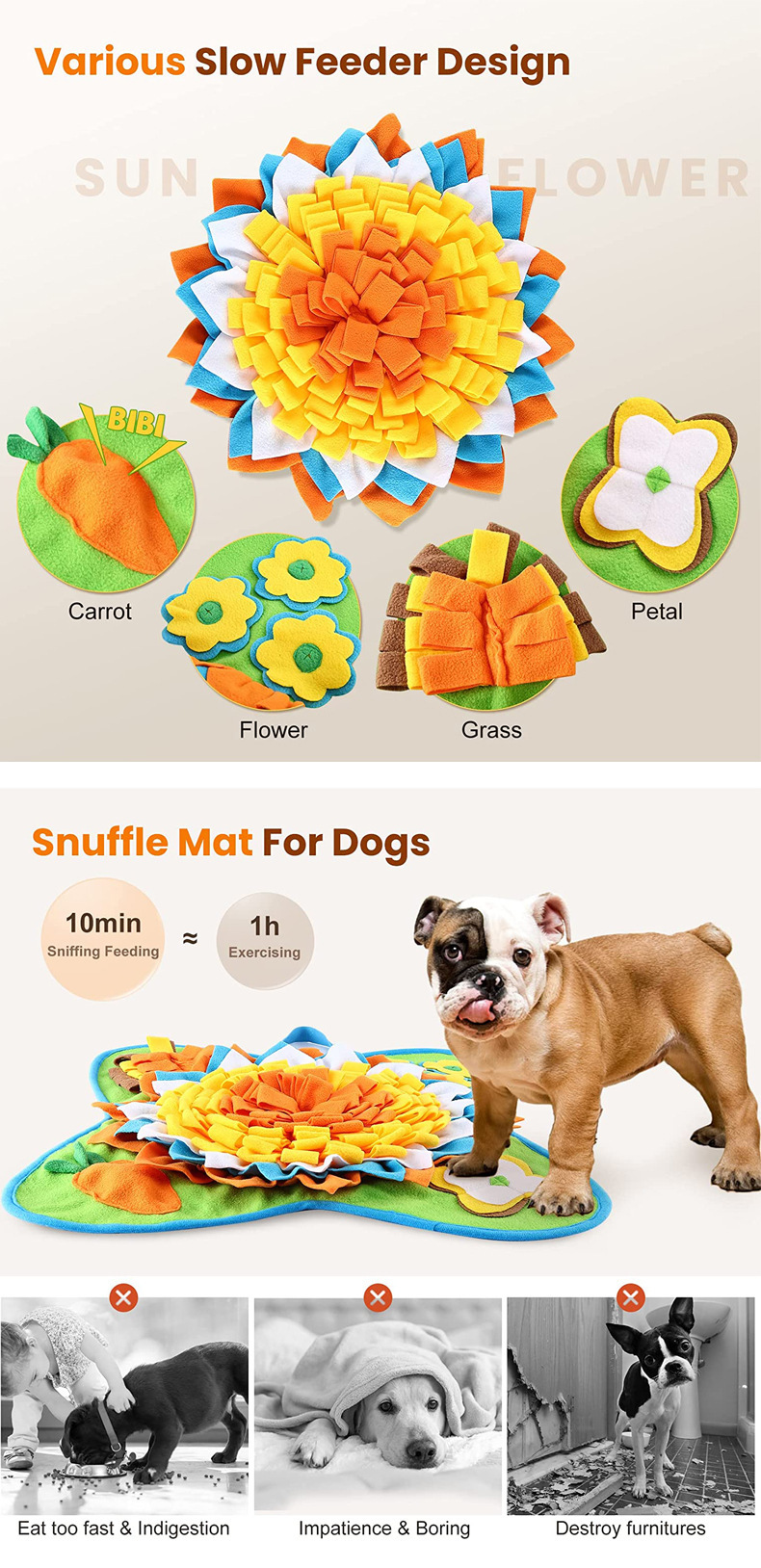 嗅闻所消耗的精气神远比散步高。还能刺激脑力提高嗅觉灵敏度。嗅闻十分钟相当于散步半小时。花脑袋的累可比身体的累更让狗乏力疲倦。相当于通过游戏的方式锻炼脑力和消耗多余精力。也能当做慢食碗。让狗狗因为要通过嗅闻找食物从而放慢进食速度。利用嗅闻垫增加宠物与饲主之间的互动。