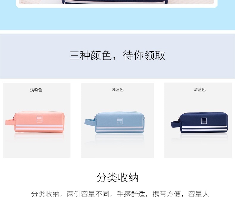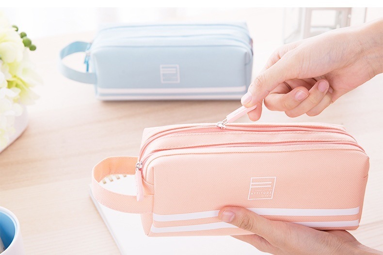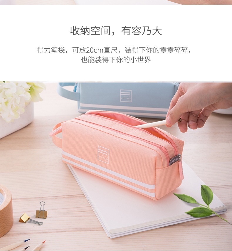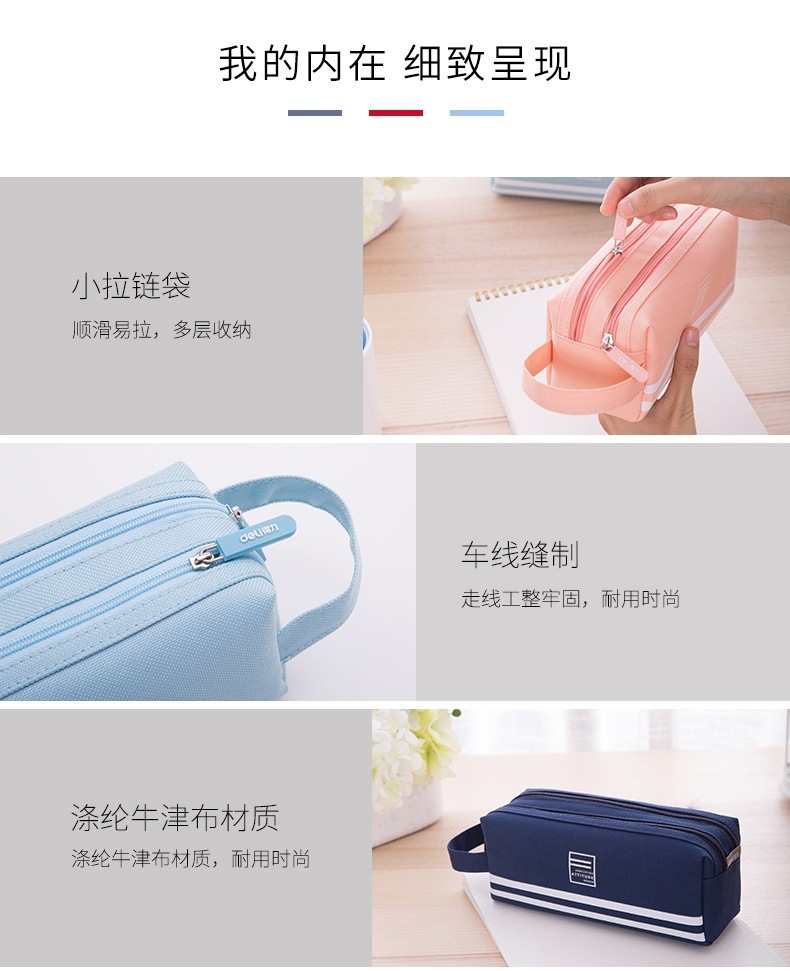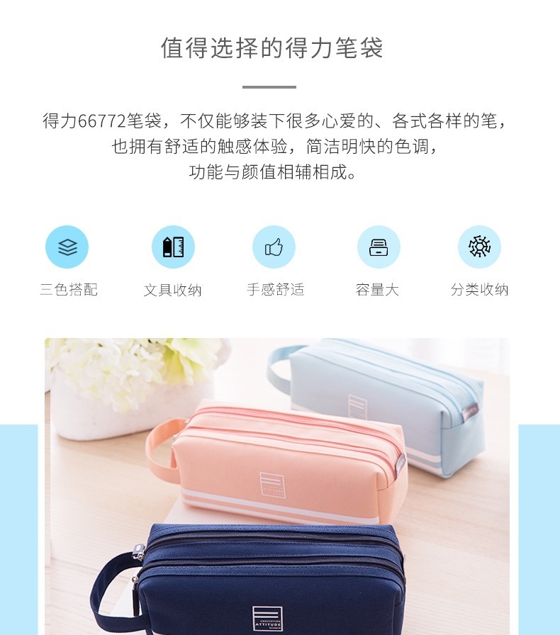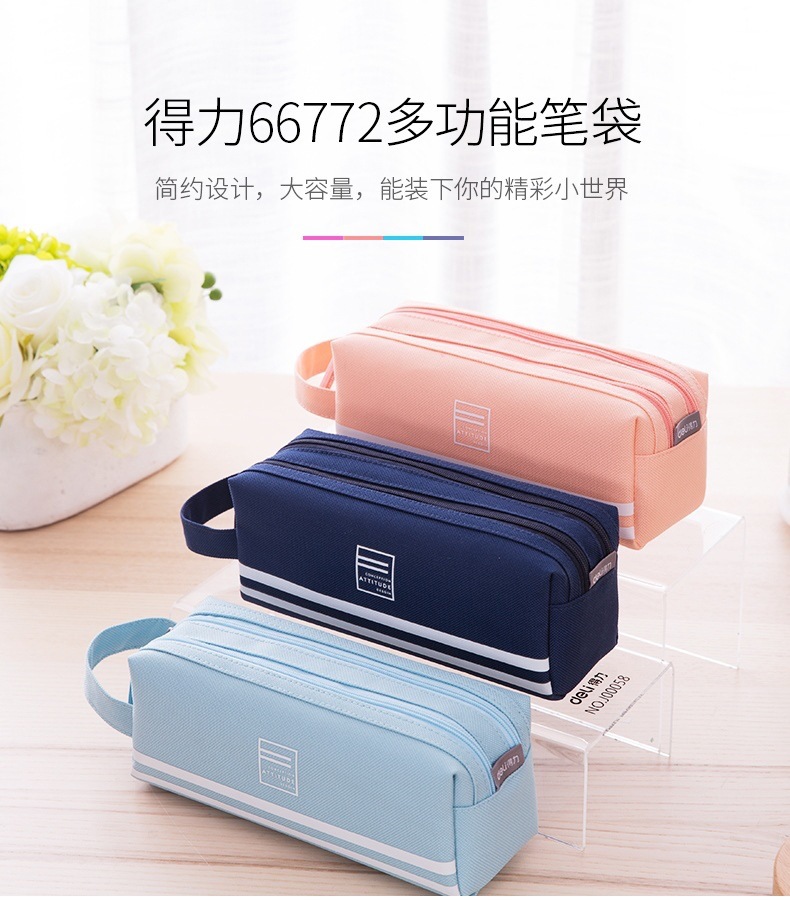 Deli alat tulis 66772 dua lapisan kapasitas besar kotak pensil kanvas sederhana tas alat tulis untuk siswa warna solid tas pensil