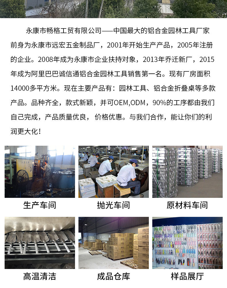 永康市畅格工贸有限公司,前身为永康市远宏五金制品厂. 于2005年经国家相关部门批准注册的企业。由家庭作坊起家,后经努力发展,于2008年成为永康市中小企业扶持对象,现工厂面积5000多平方米。主要生产花园种植工具\铝合金折叠桌\烧烤炉等产品,以及好神拖\铝压铸配件。我们有自己的设计员,技术员,可及时按客户指定要求制作样品,价格能得到最大的优惠!得到更大的利润!