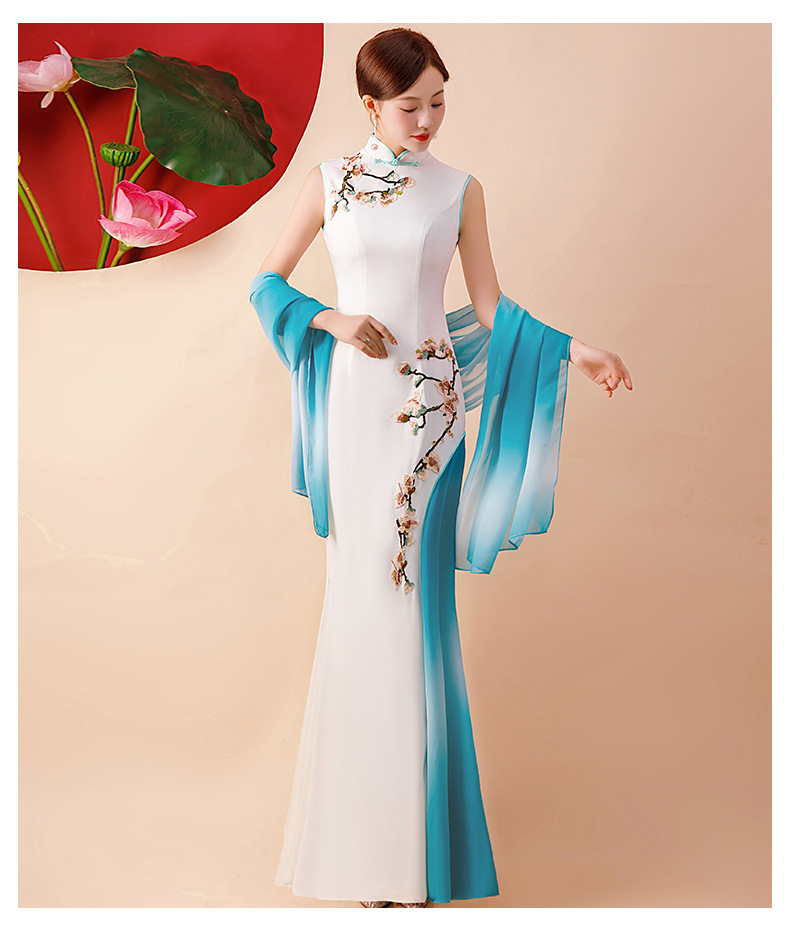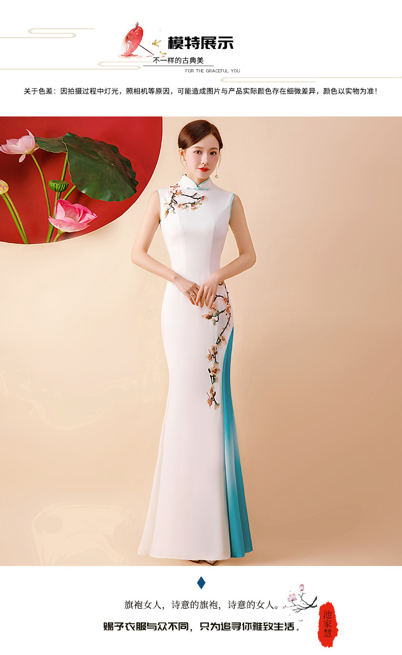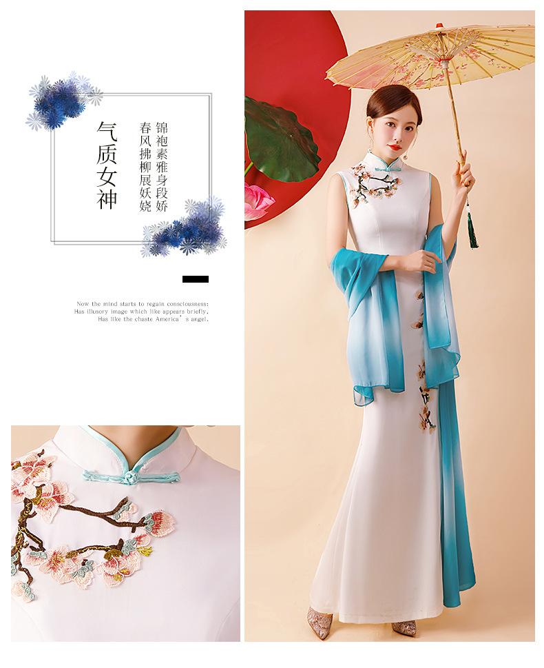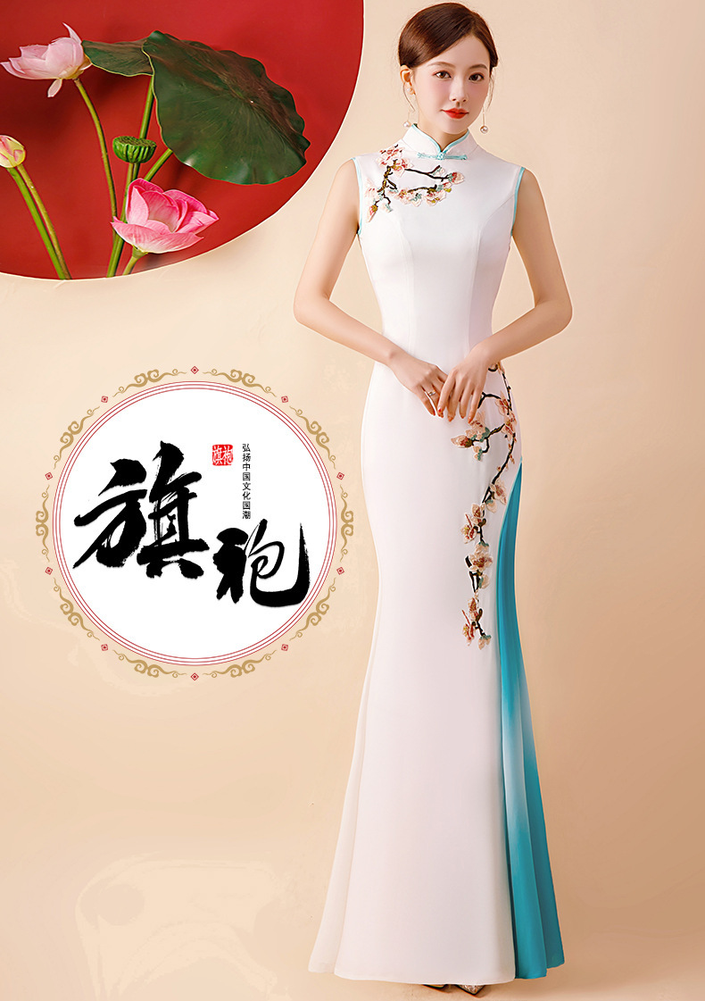 Gaun cheongsam wanita dengan performa yang lebih baik, model panjang dengan kerah berdiri, melangsingkan, gaun malam bordir modis untuk musim semi dan musim gugur.