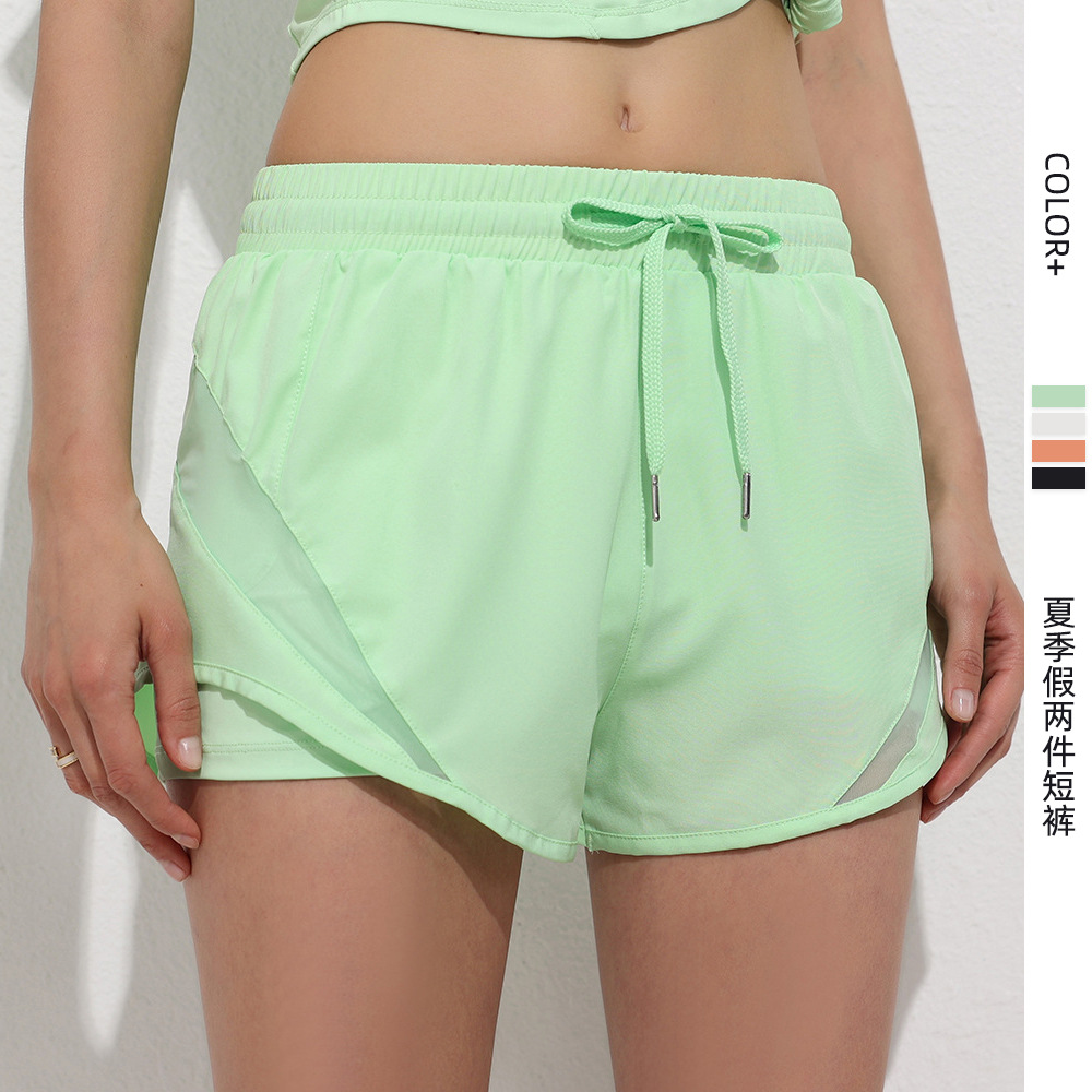 Celana pendek lari wanita, Bawahan luar palsu dua potong pakaian yoga tiga titik, bawahan olahraga fitness Musim Panas 2024 untuk perempuan