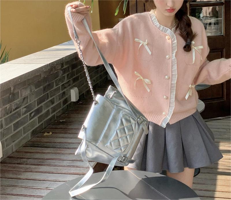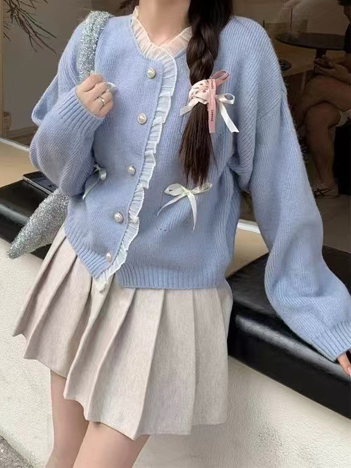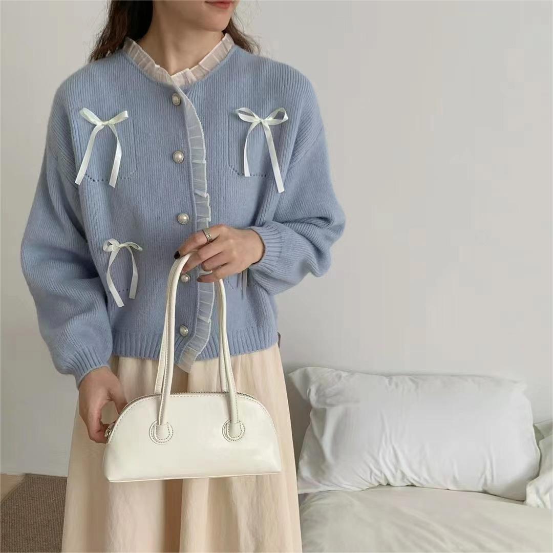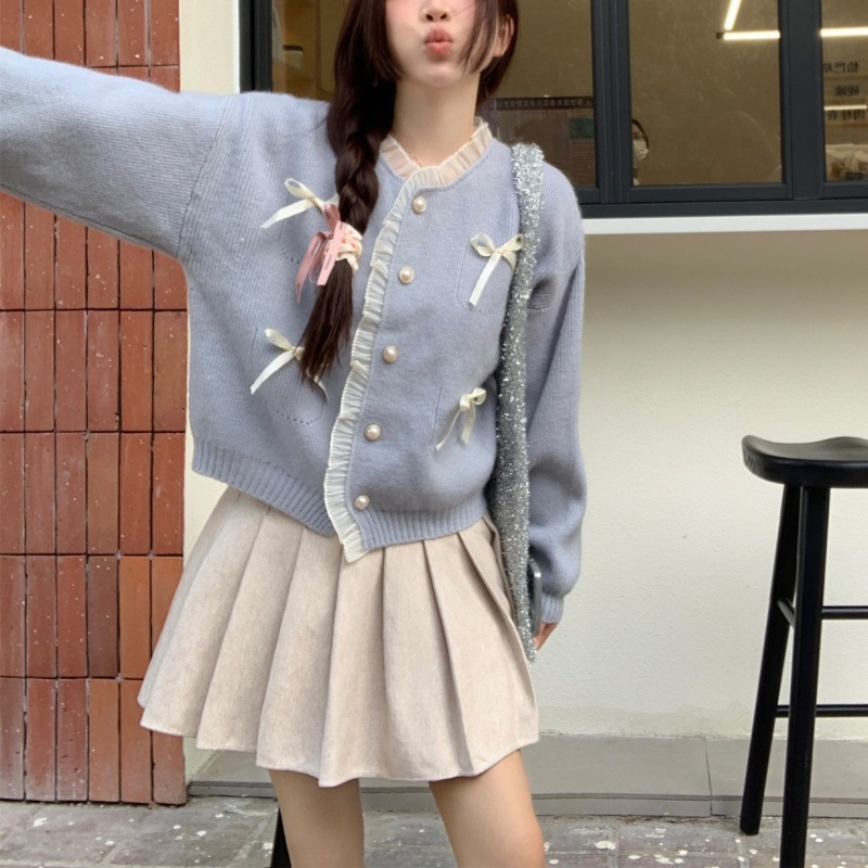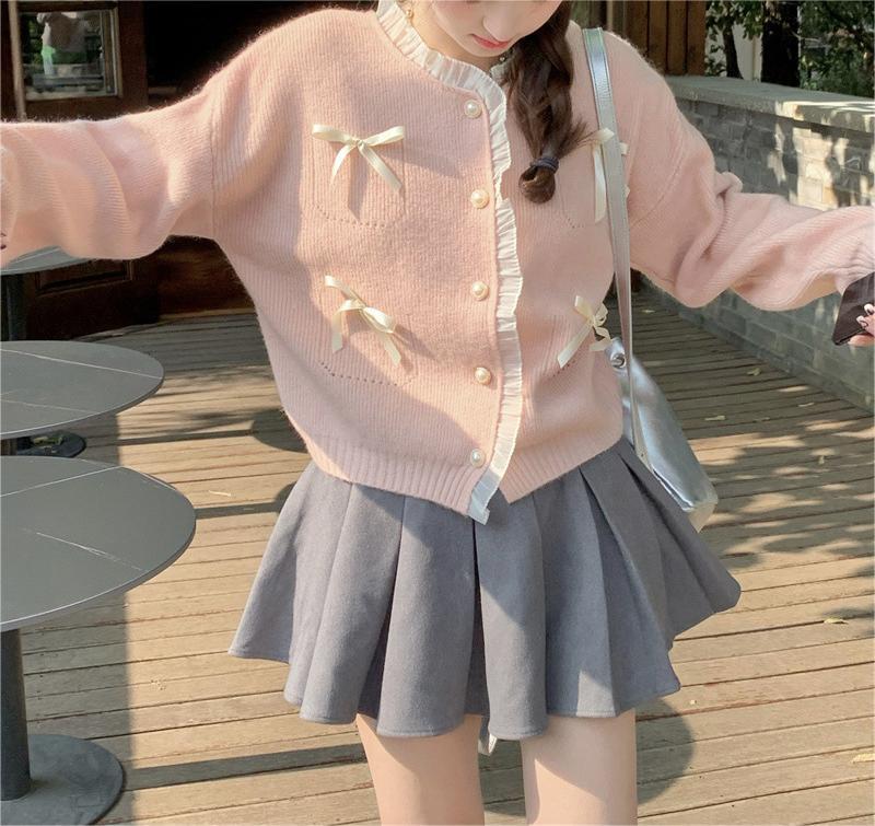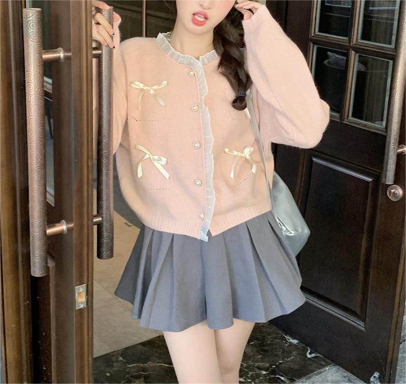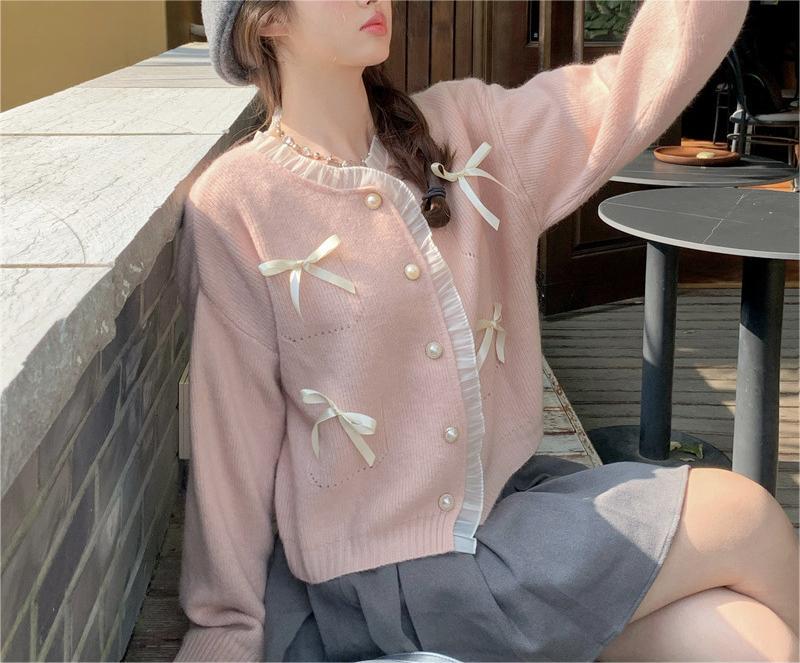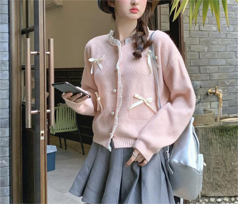 Sweter pita merah muda bergaya lembut manis sweter gaya Barat atasan pengurang usia sweater mantel gaya Korea musim semi untuk wanita